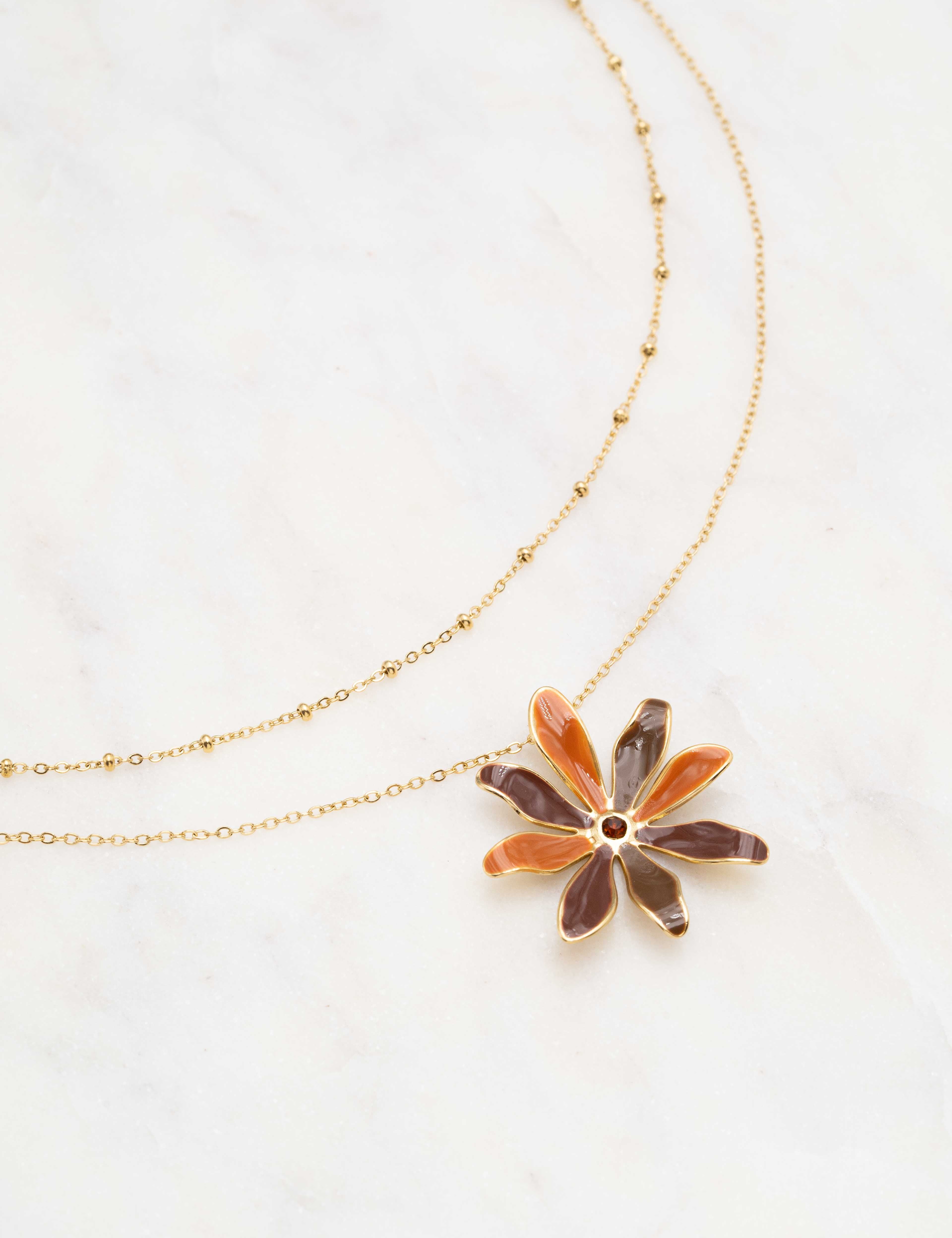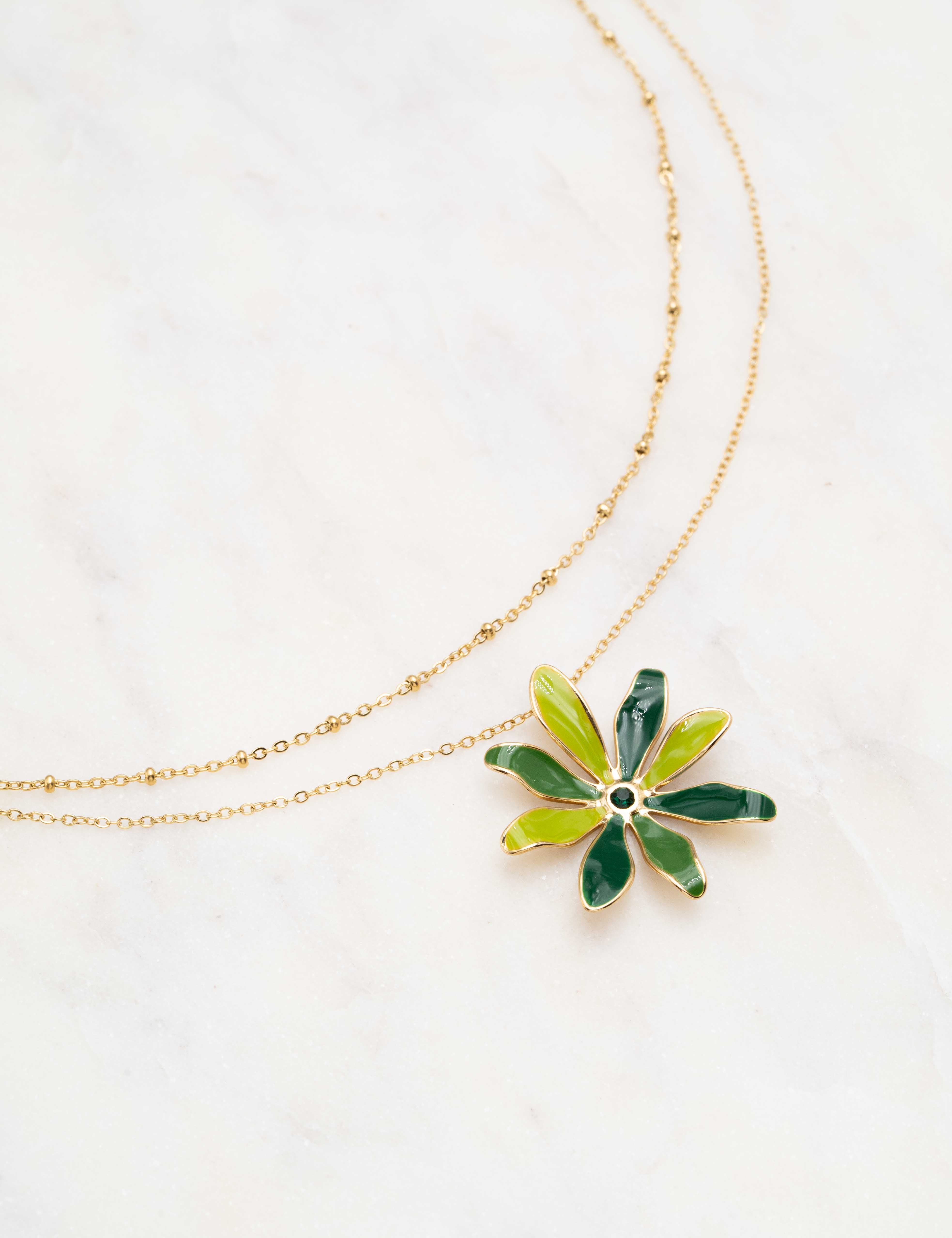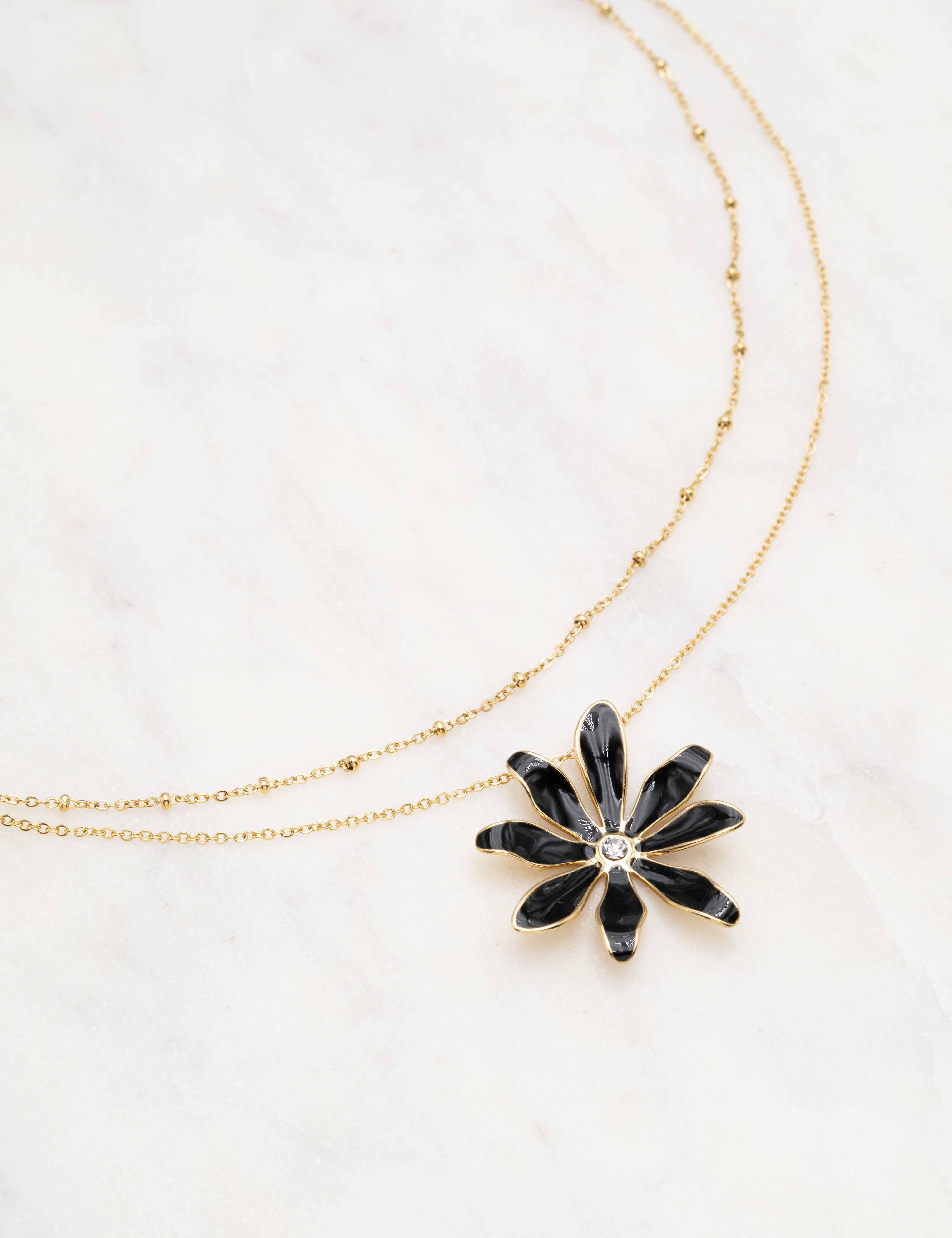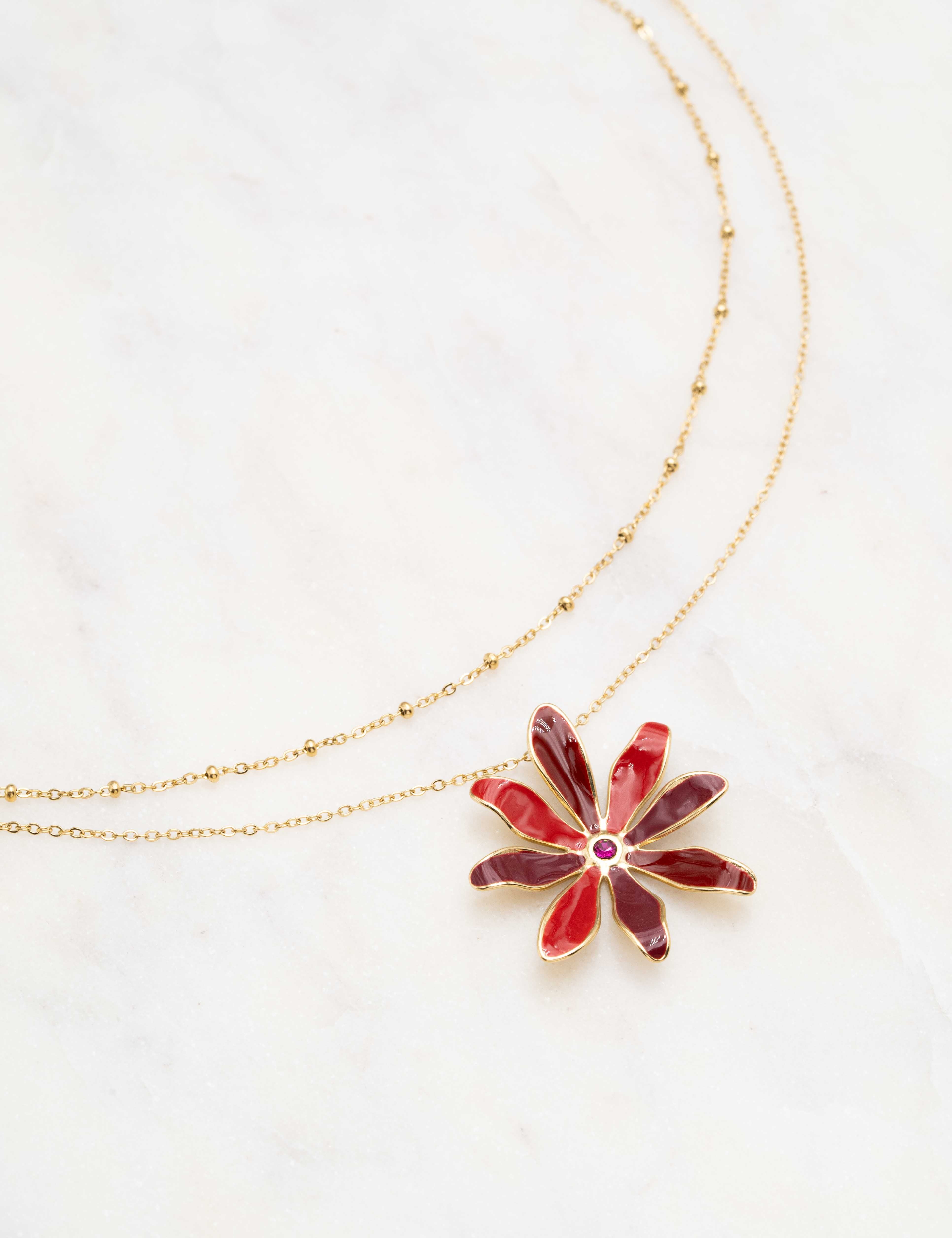Collier réglable sur chaîne double rangs composé d'une pièce au motif floral émaillé coloré orné d'un strass.