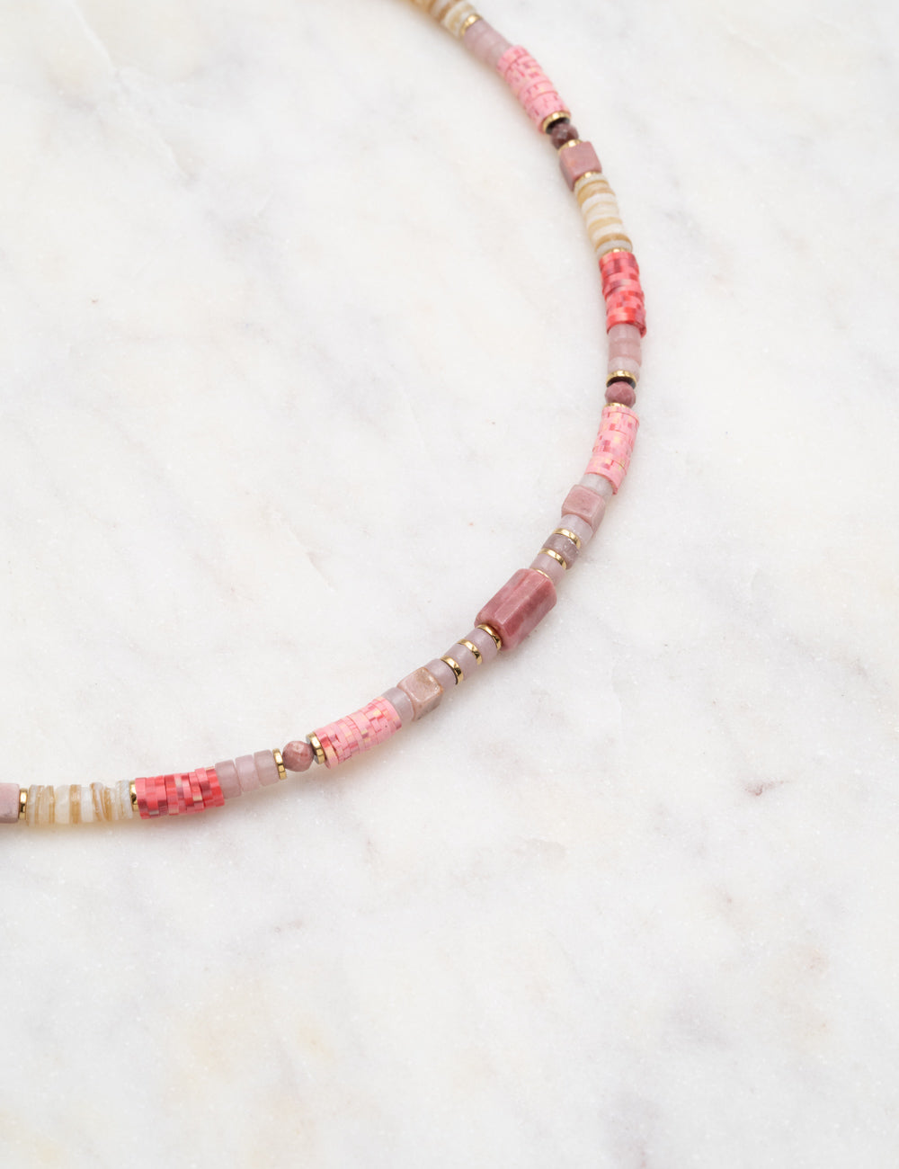 Collier réglable composé d'un joli enfilage de coquillages, perles heishi et pierres naturelles.