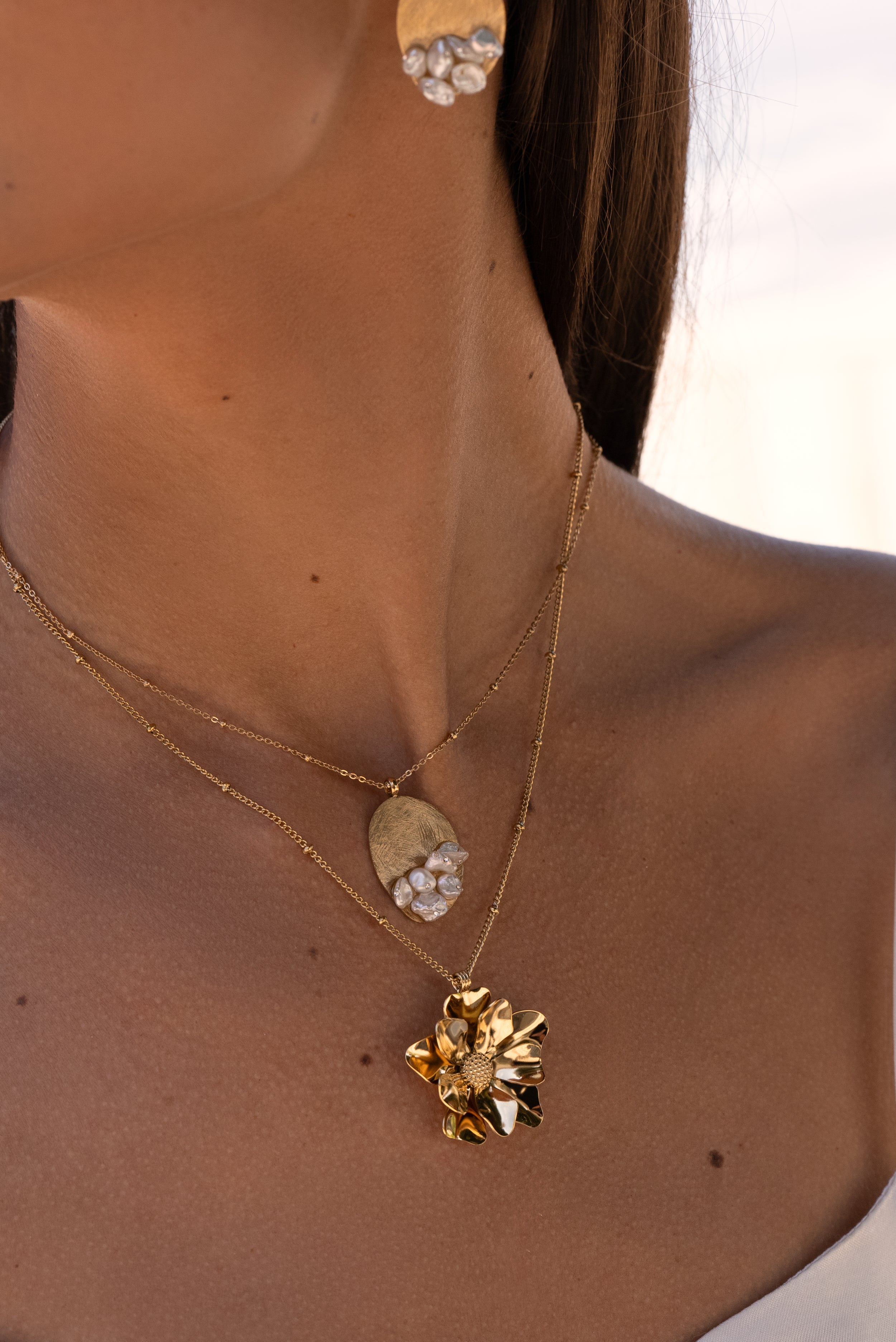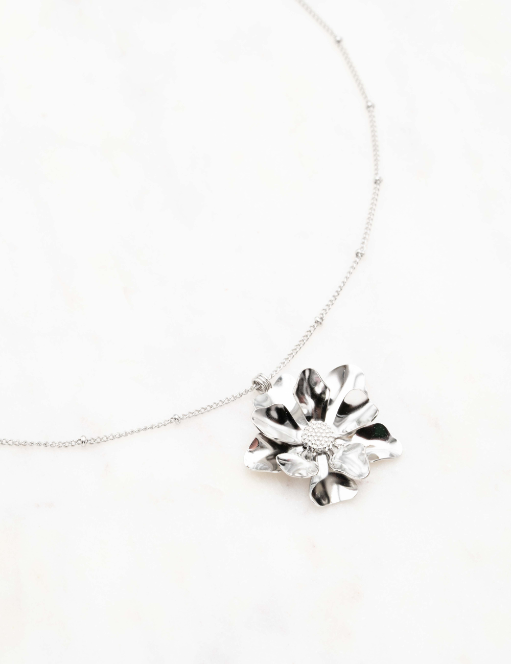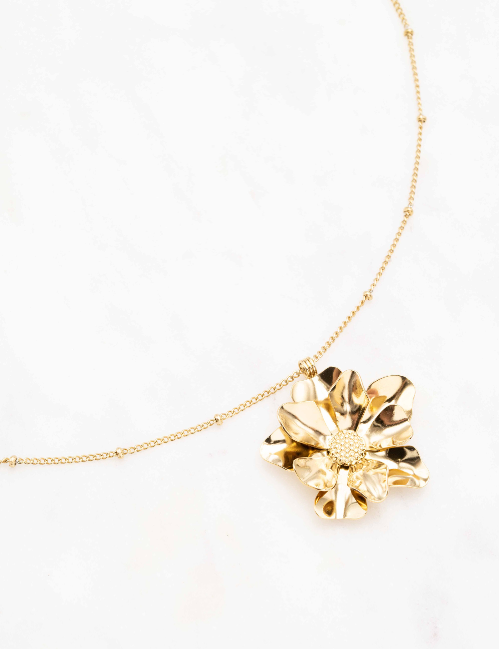 Collier réglable sur chaîne composé d'un pendant formant une fleur texturée.