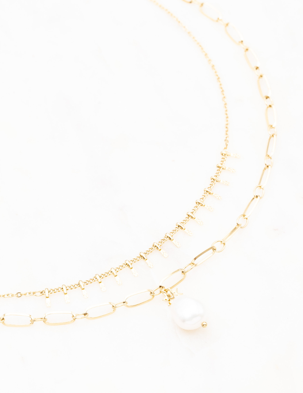Collier réglable sur chaîne double rangs avec maille composé de picots, d'une pampille étoile et d'une perle d'eau douce.