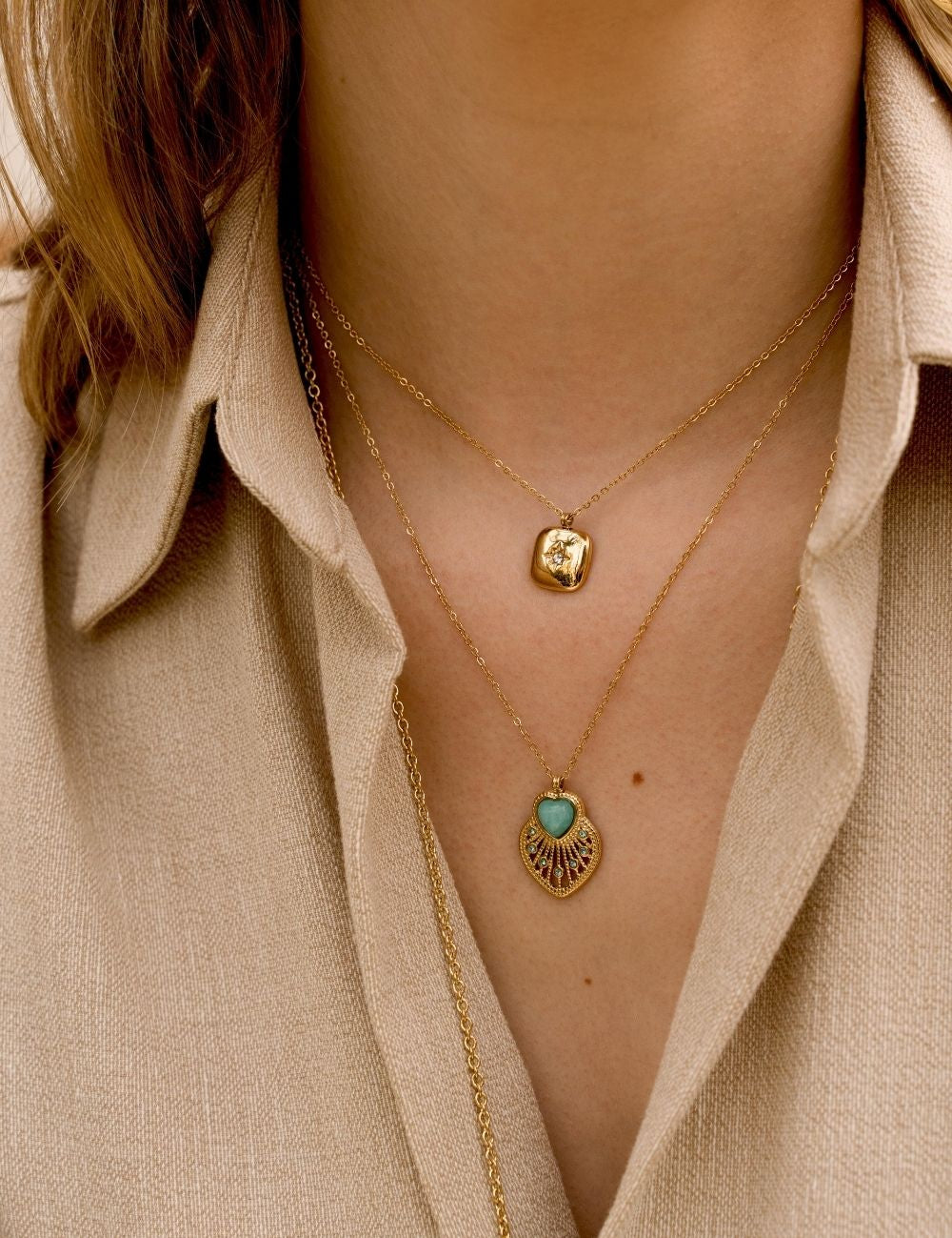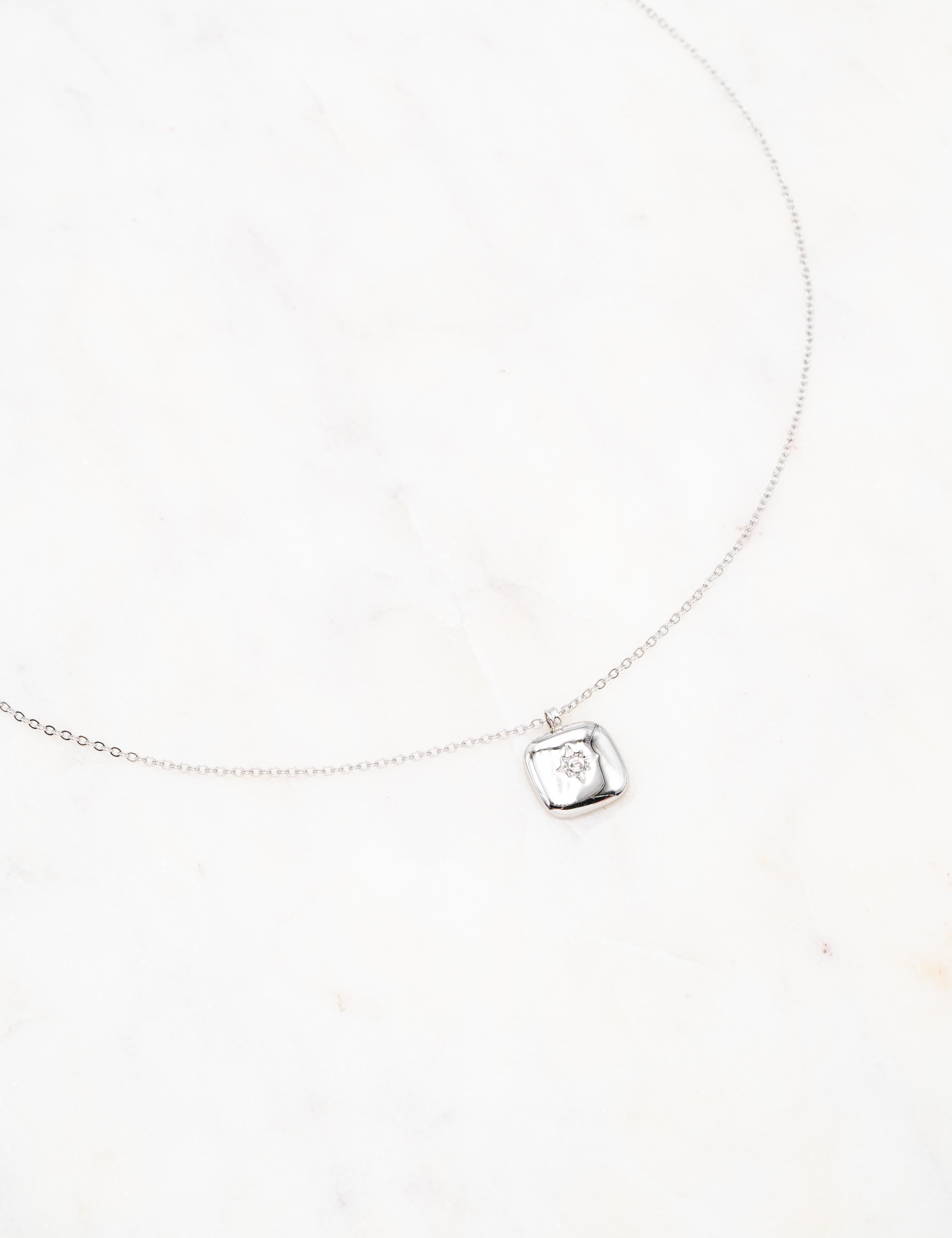 Collier réglable sur chaîne composé d'une pièce carrée ornée d'une étoile et d'un strass.