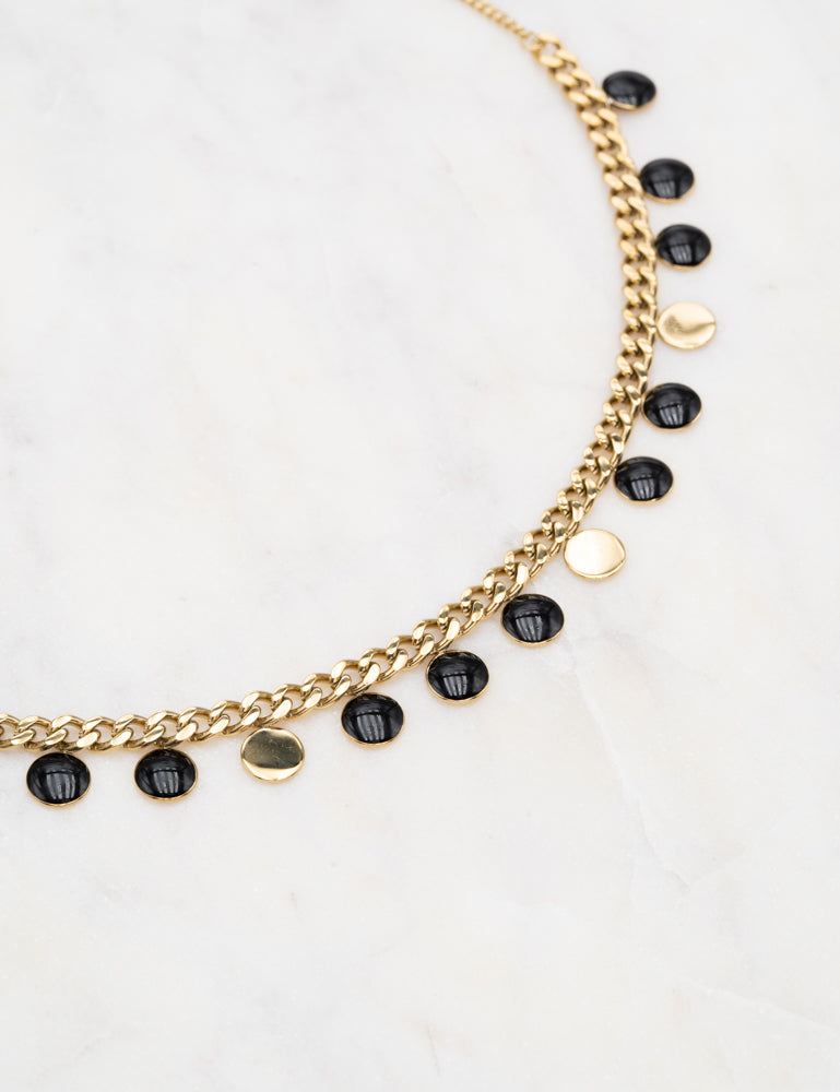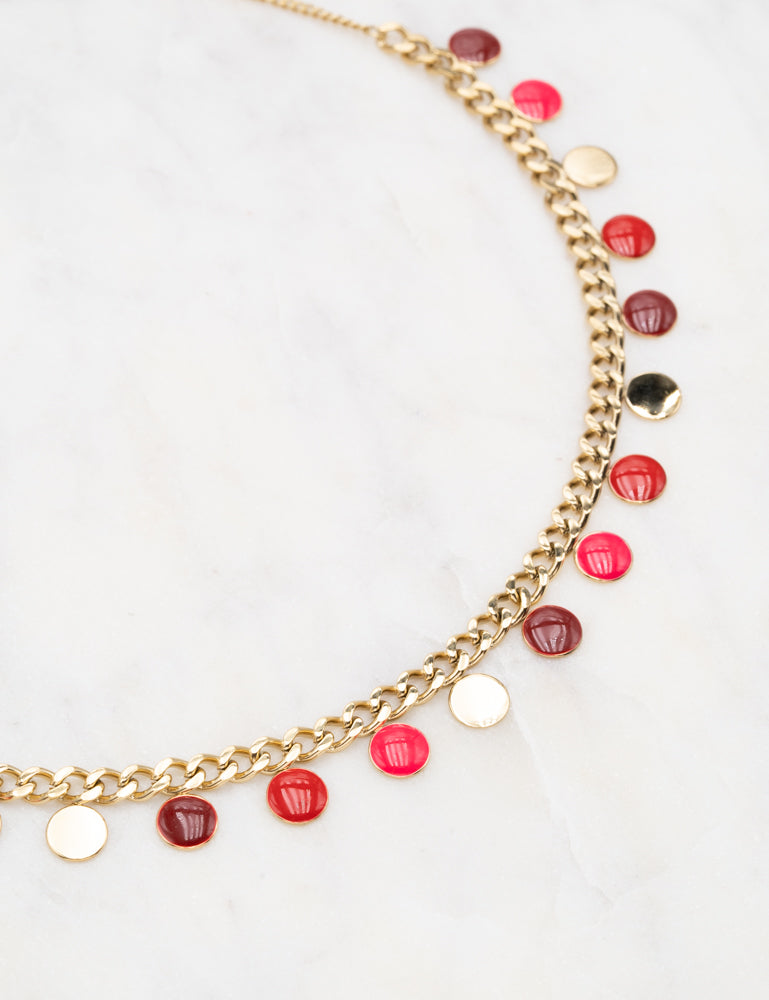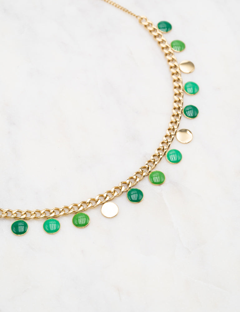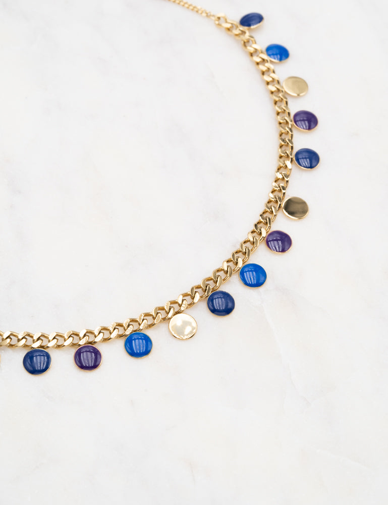 Collier réglable en maille gourmette embelli de pampilles rondes lisses et colorées émaillées.