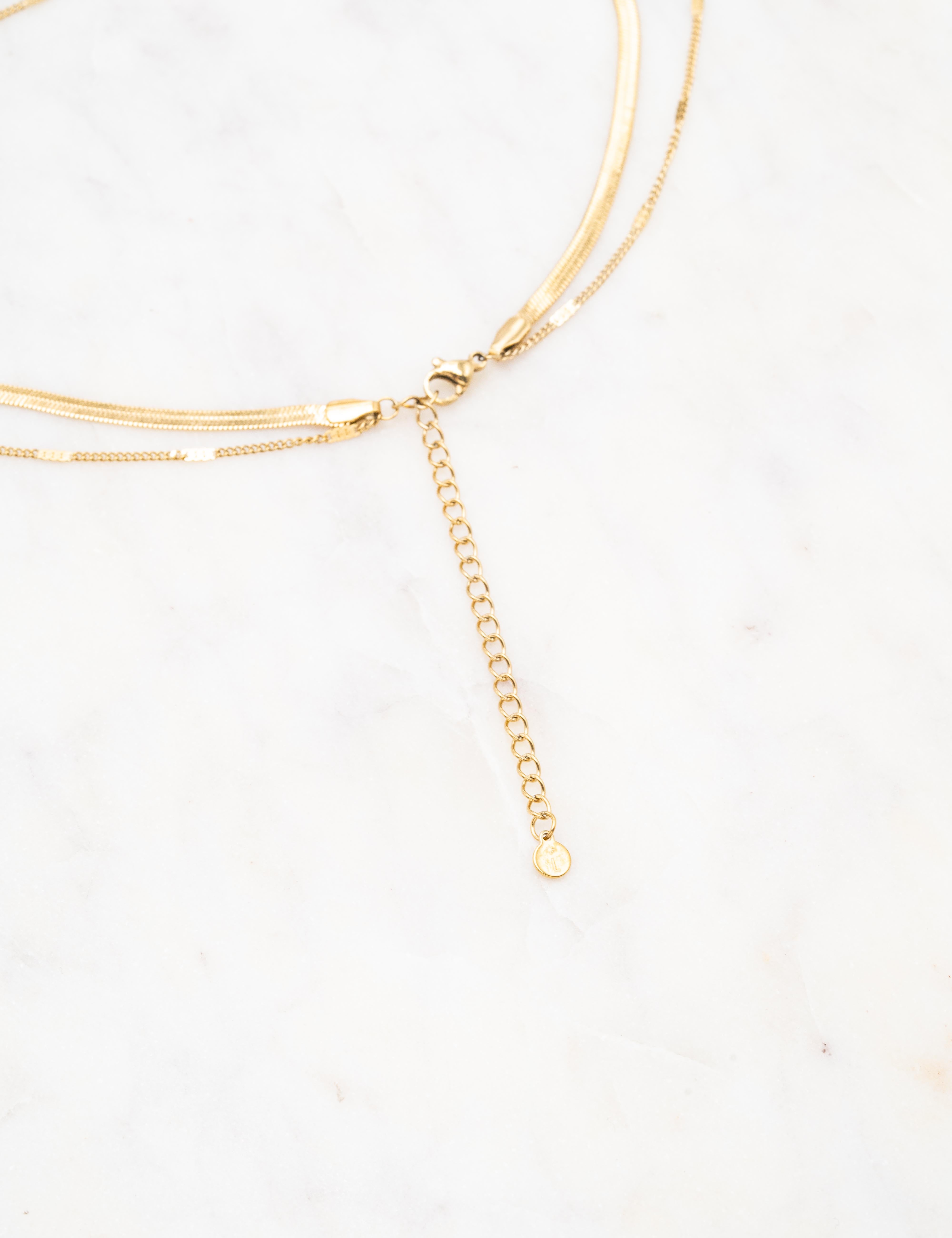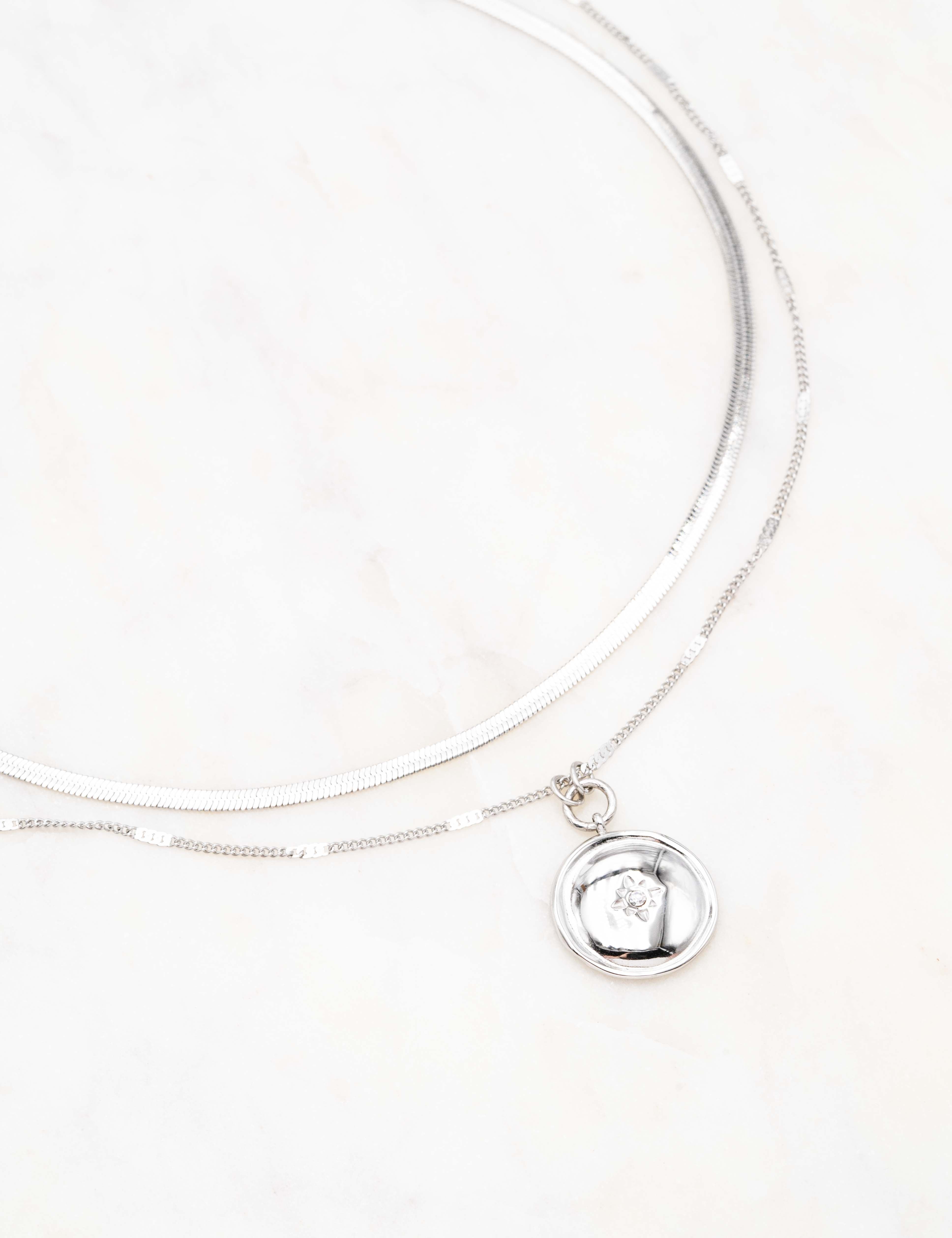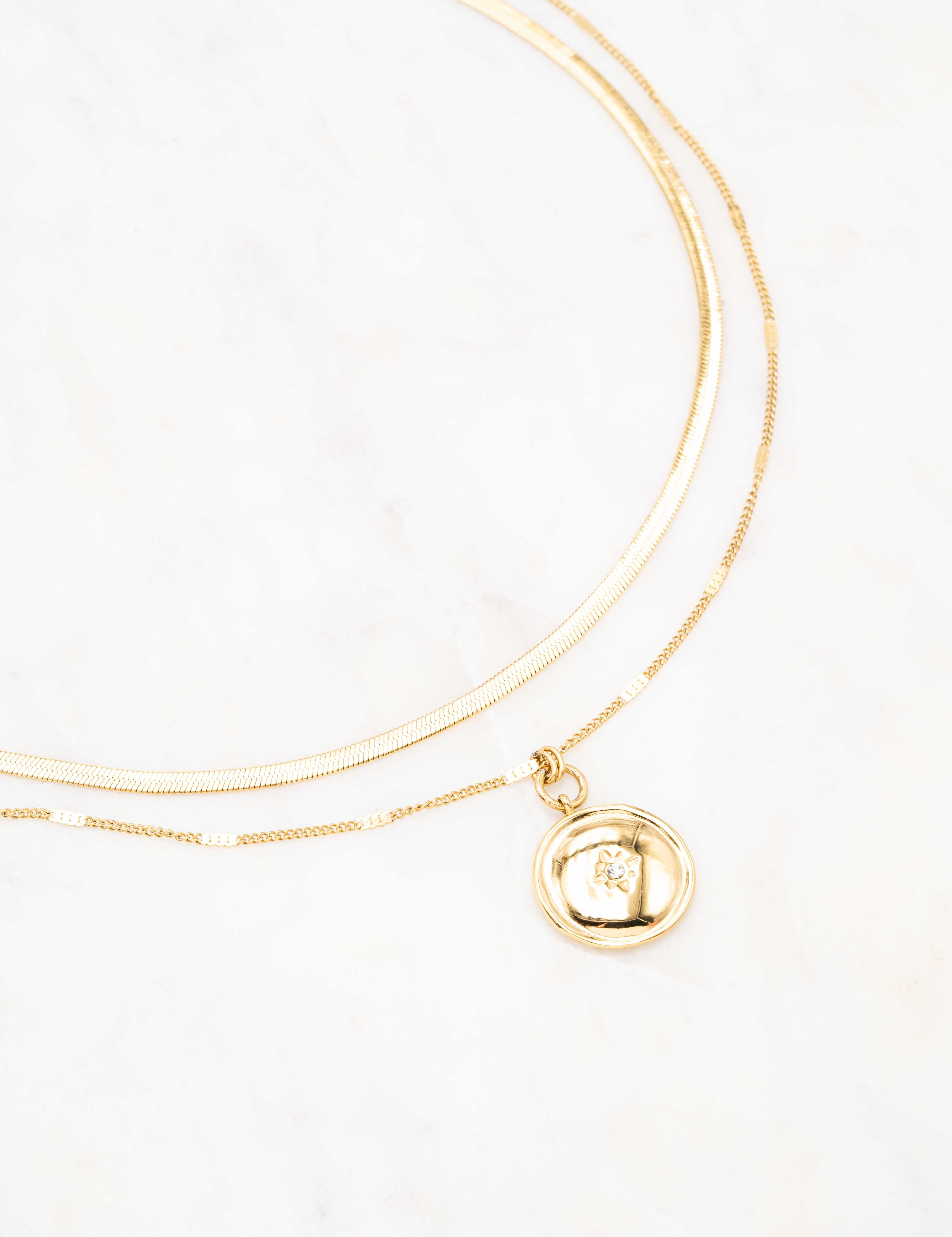 Collier réglable sur chaîne double rangs avec maille composé de trois petits anneaux et d'un pendentif rond avec une étoile et un strass.