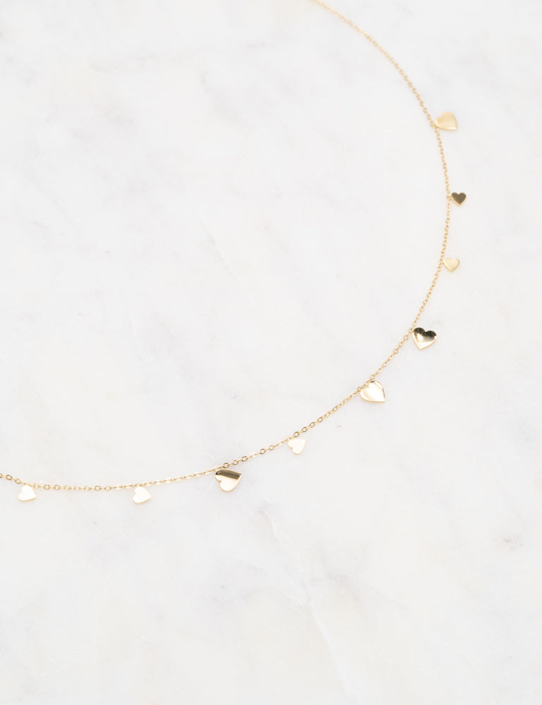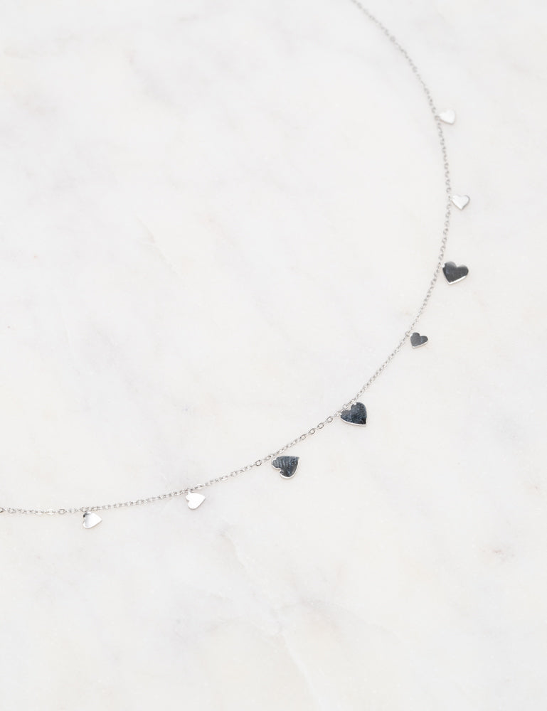 Collier sur chaîne composé de pampilles coeurs. Fermoir mousqueton et chaînette de réglage.