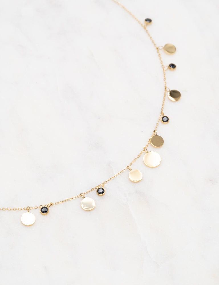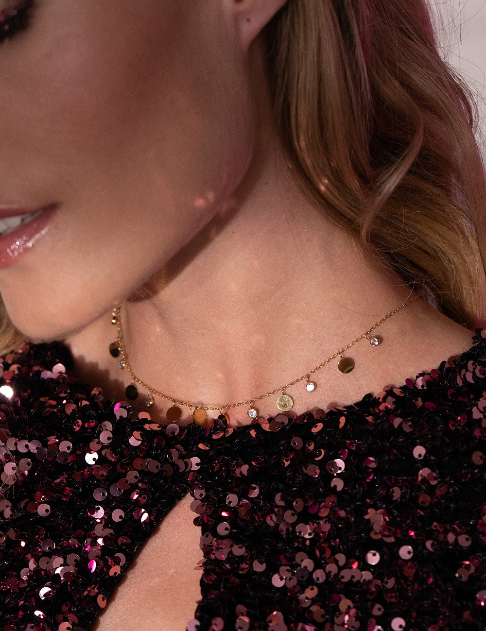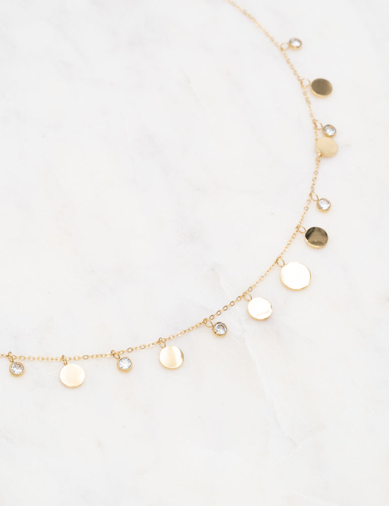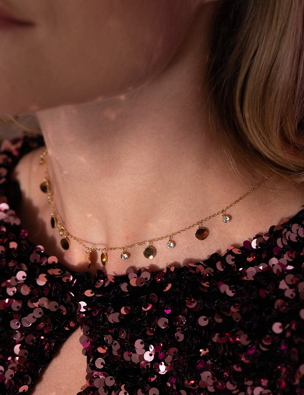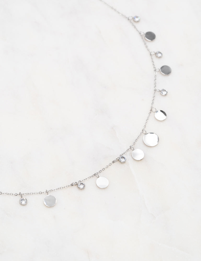 Collier sur chaîne composé de pampilles rondes et de strass.