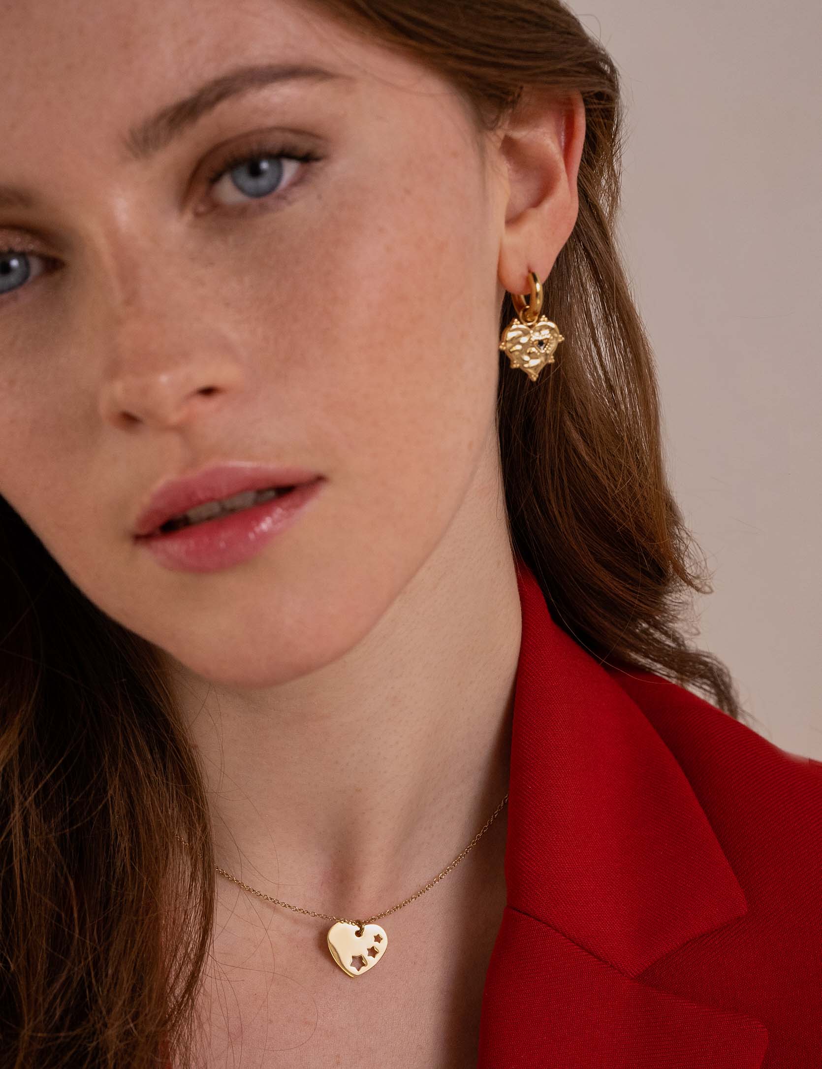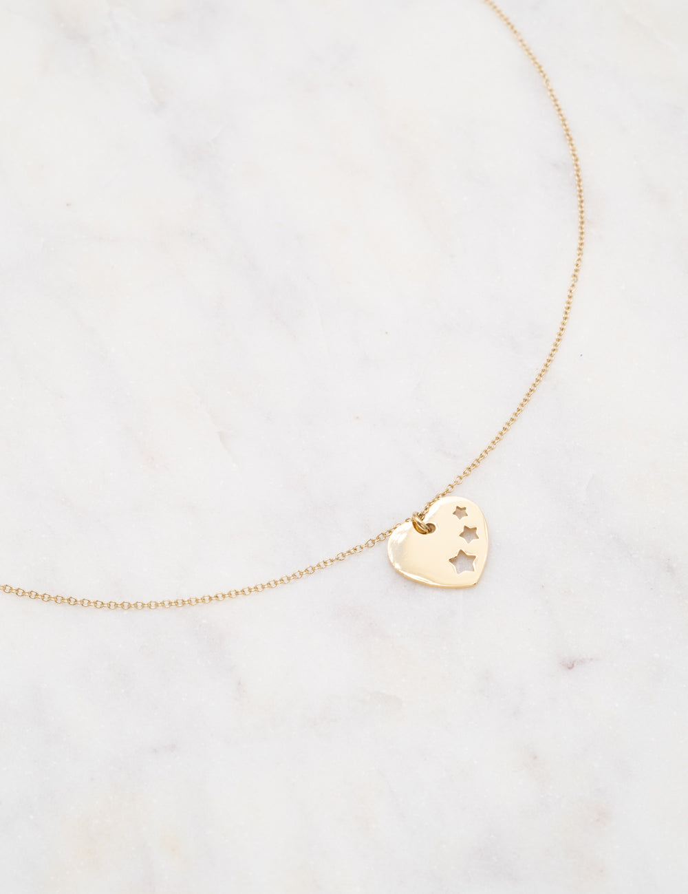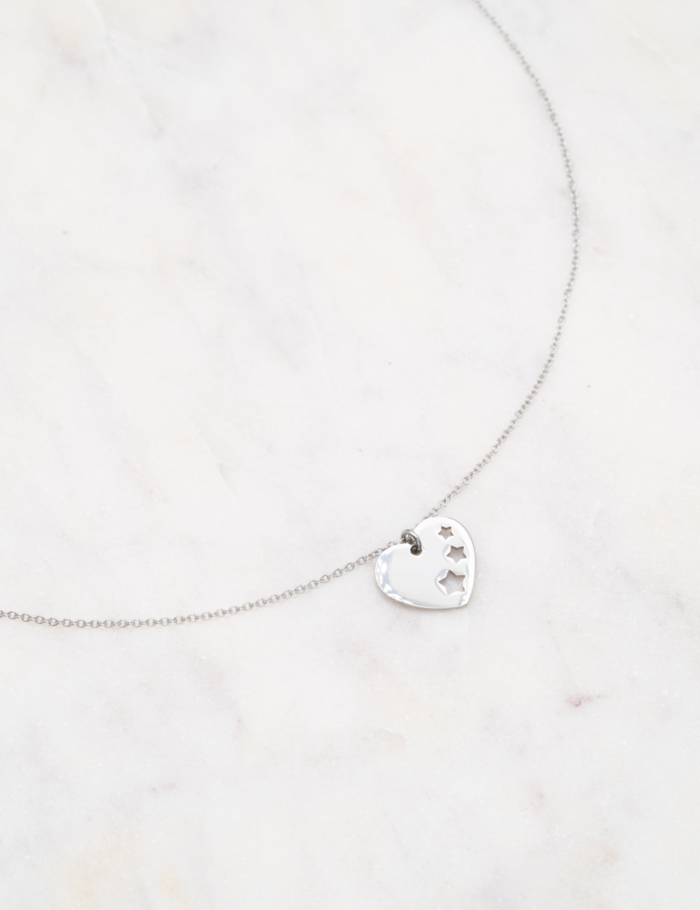 Collier réglable sur chaine avec un pendant au motif coeur orné d'étoiles ajourées. Fermoir mousqueton et chaînette de réglage.