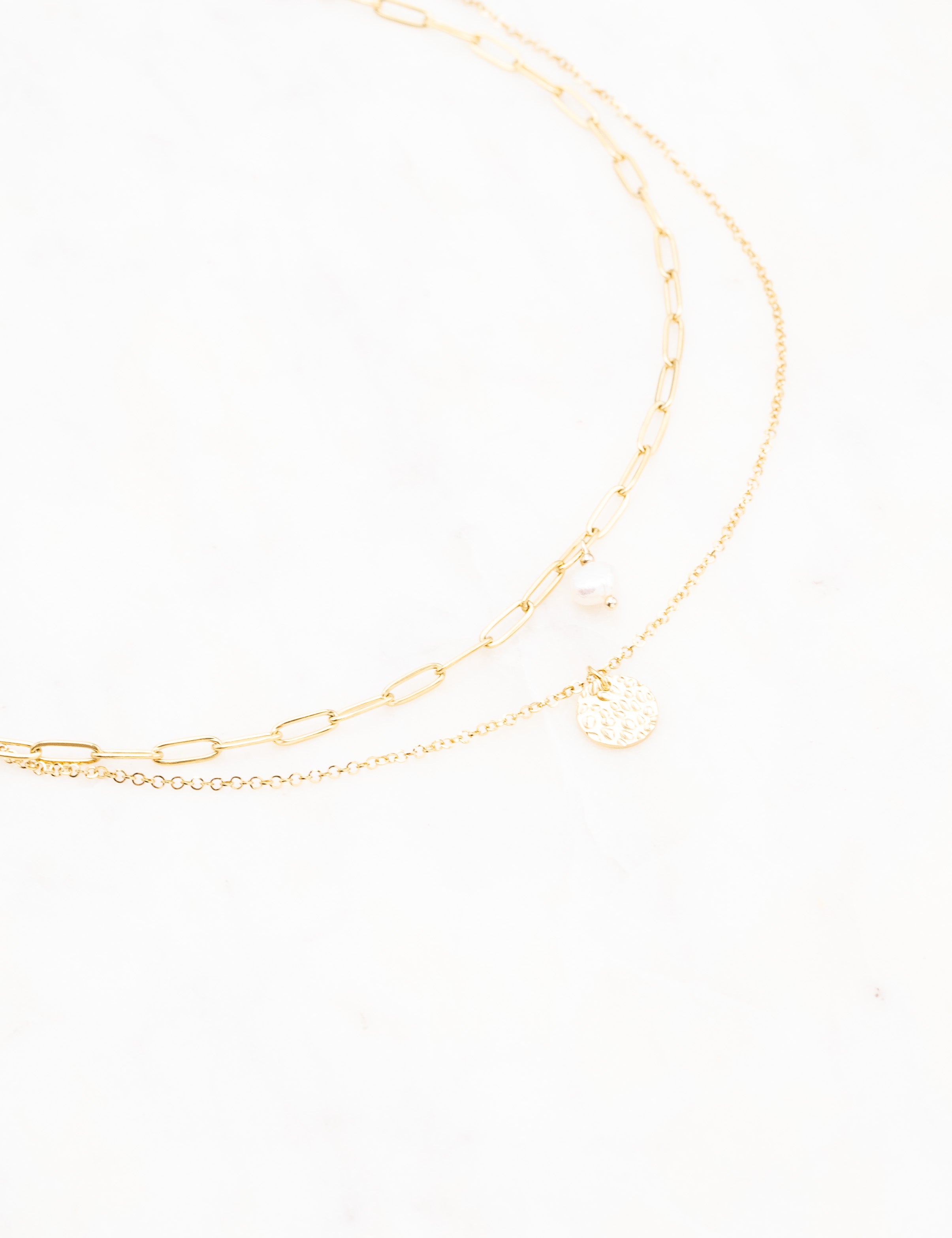 Collier sur chaîne double rangs avec maille composé de deux pendentifs : une perle d'eau douce et une pièce ronde martelée.