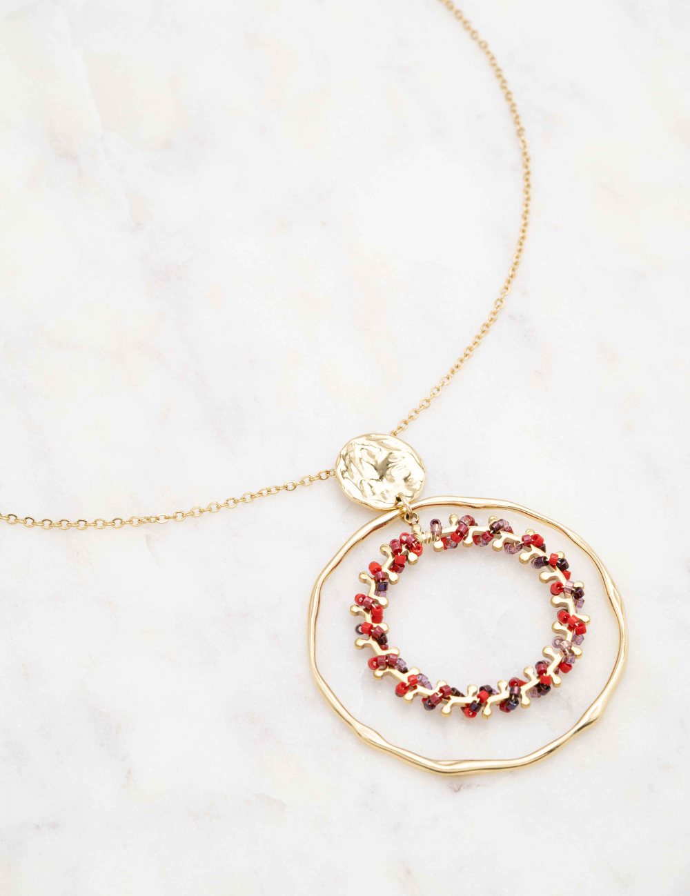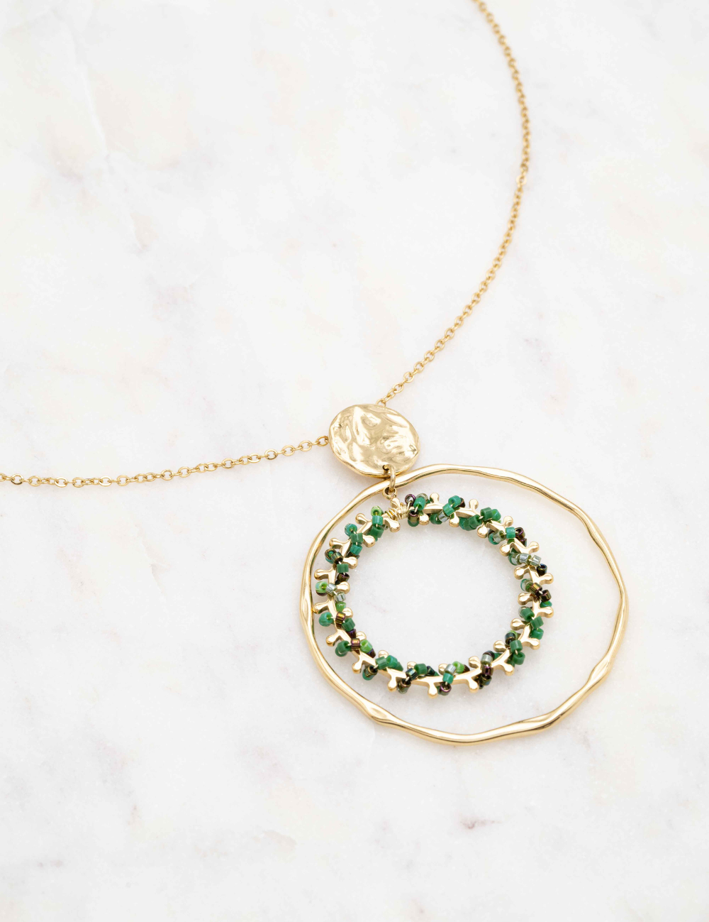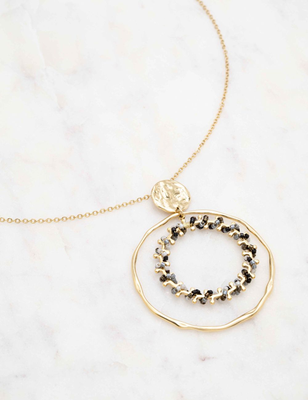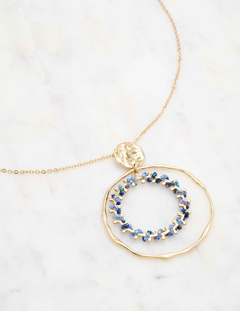 Collier réglable type sautoir sur chaîne composé d'une pièce martelée avec un pendant anneau texturé et un anneau orné de perles en pate de verre type rocailles.