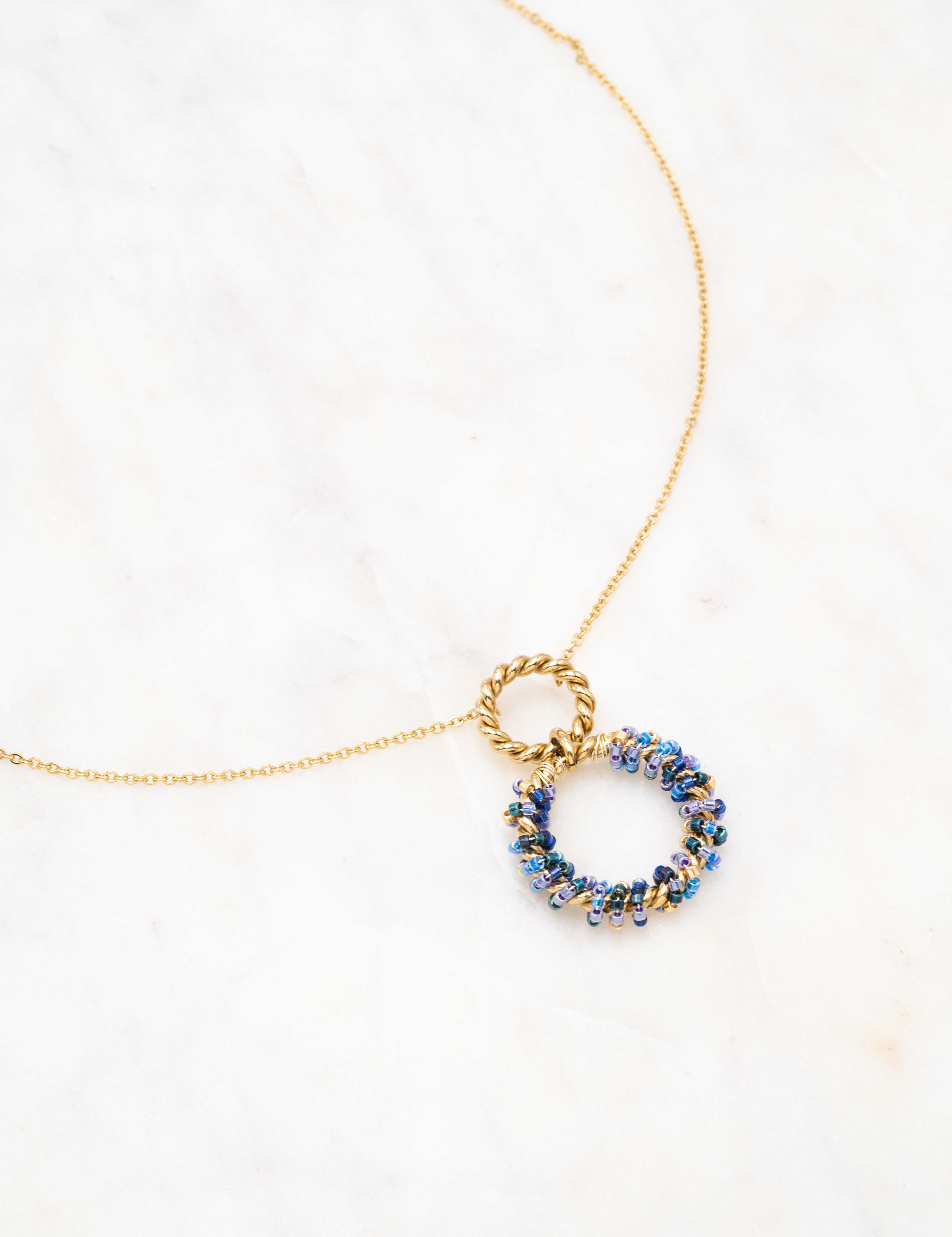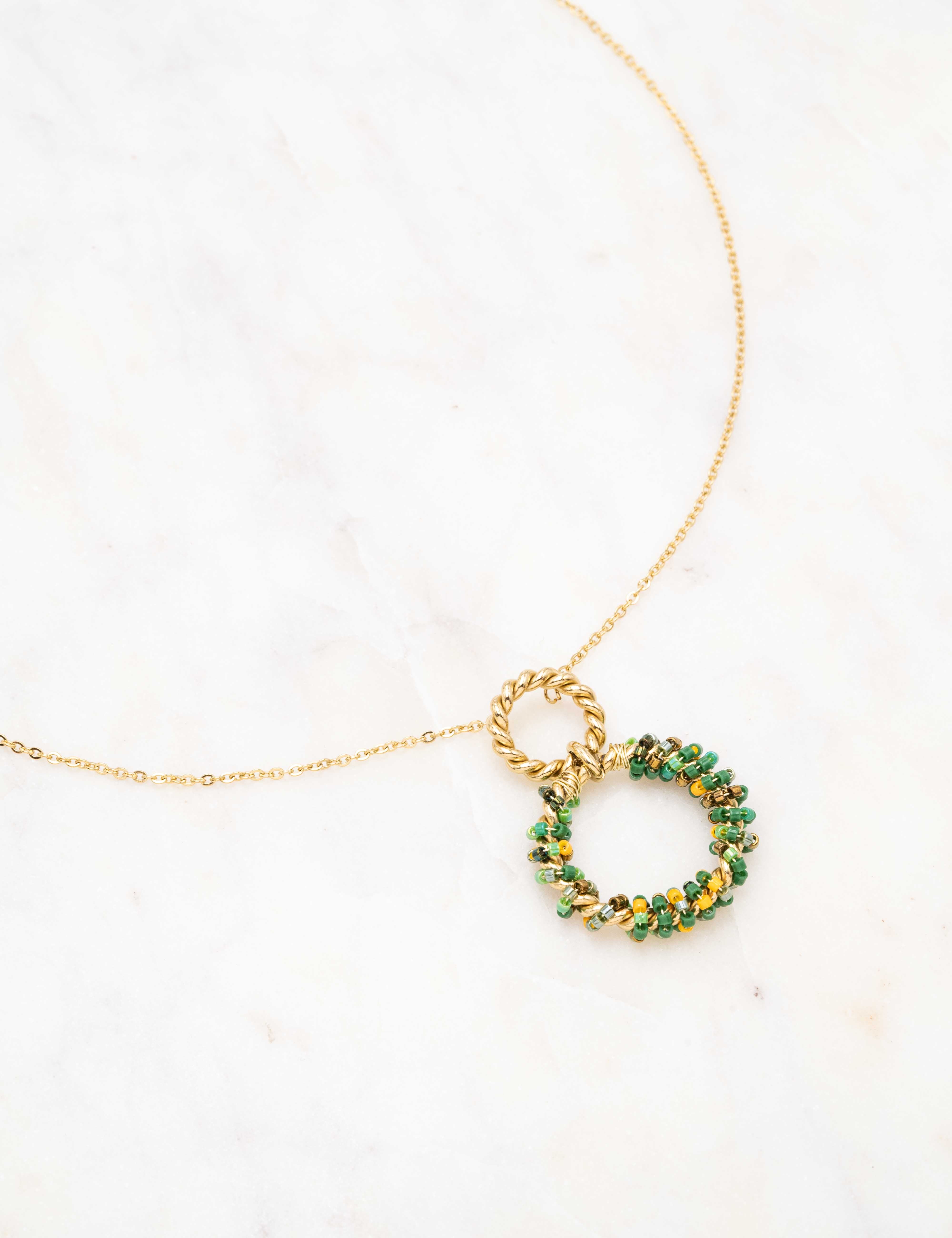 Collier réglable sur chaîne composé d'un anneau torsadé et d'un anneau orné de pates de verre type rocaille.