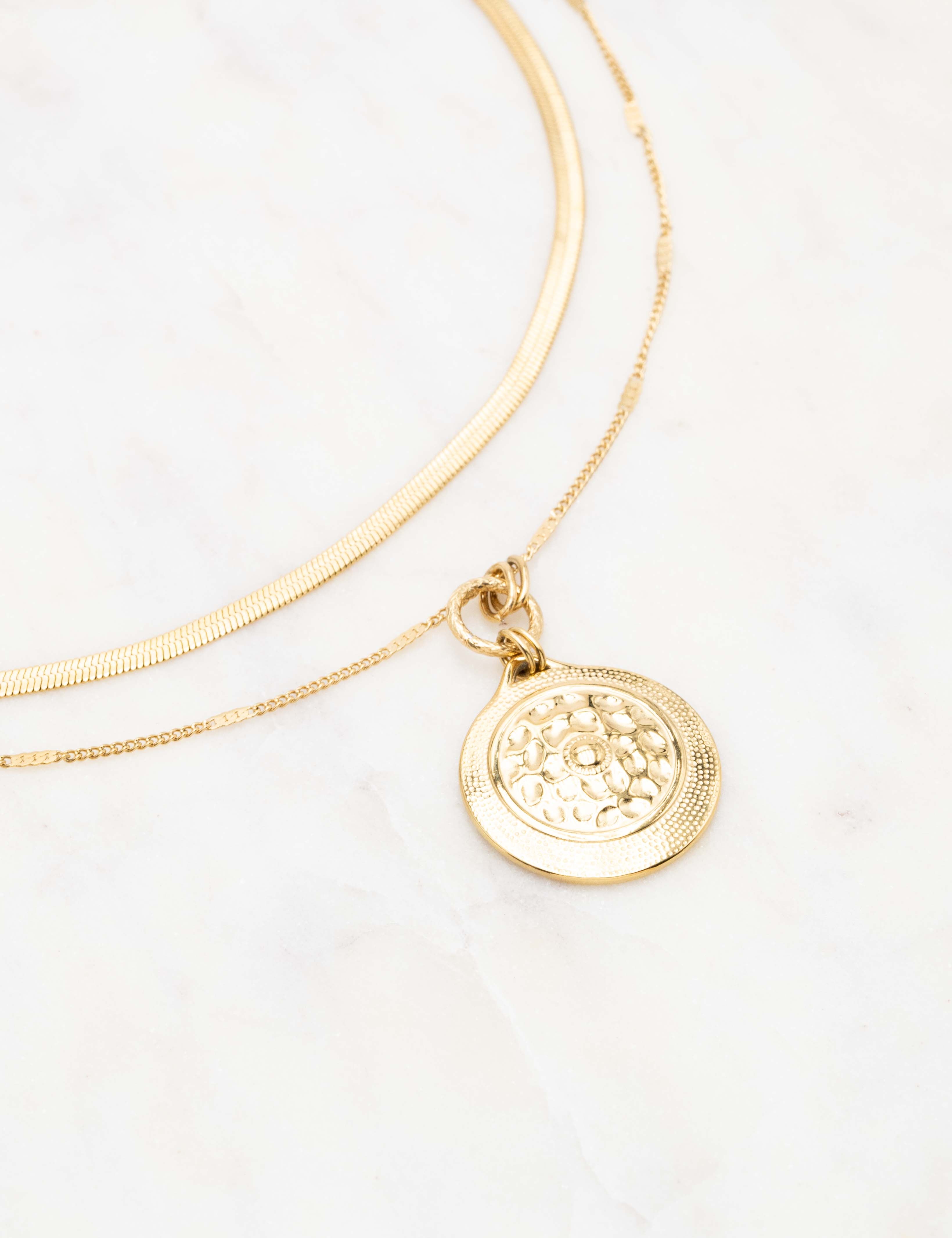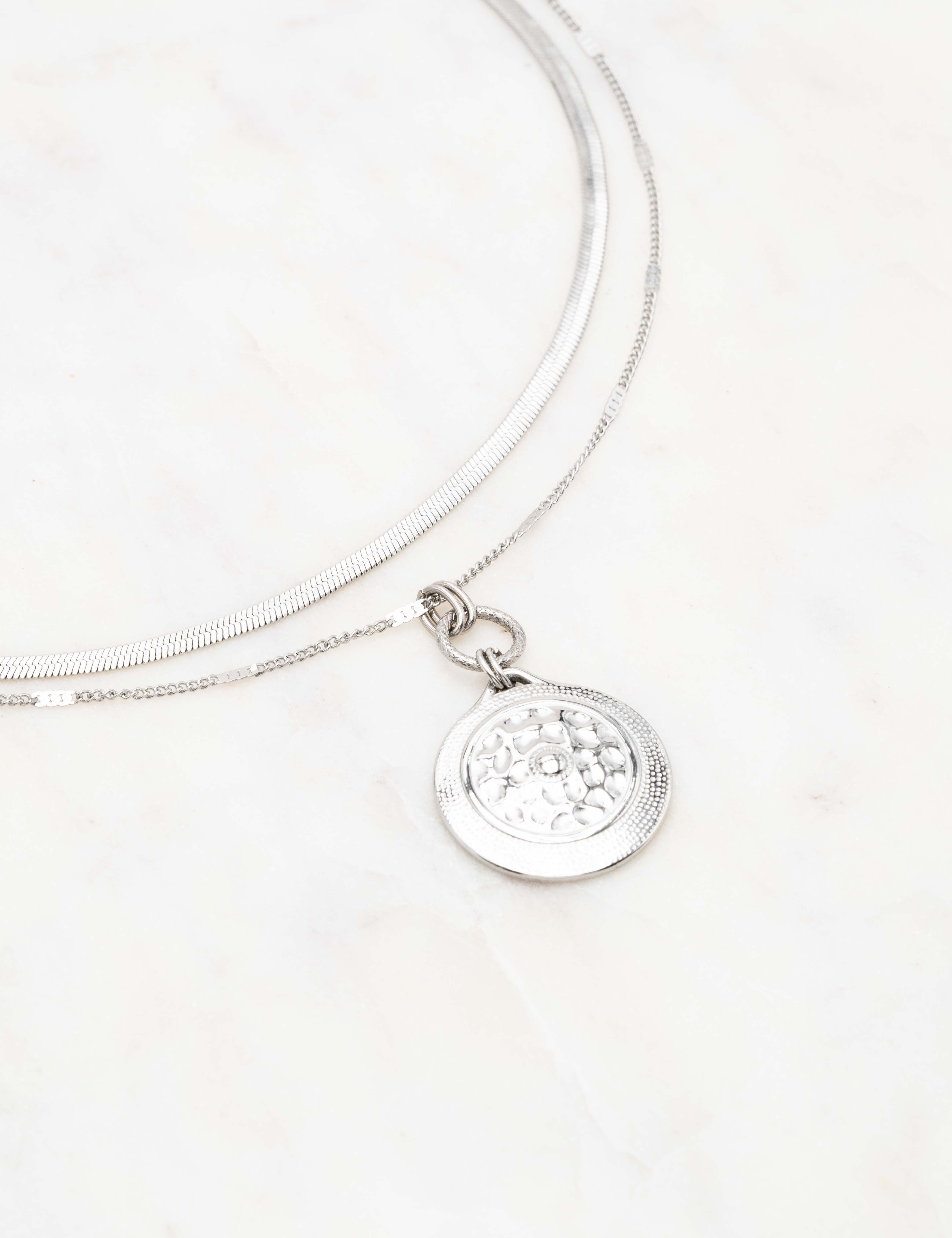 Collier réglable sur chaîne double rangs (chaine et maille plate) composé d'un pendentif rond martelé.