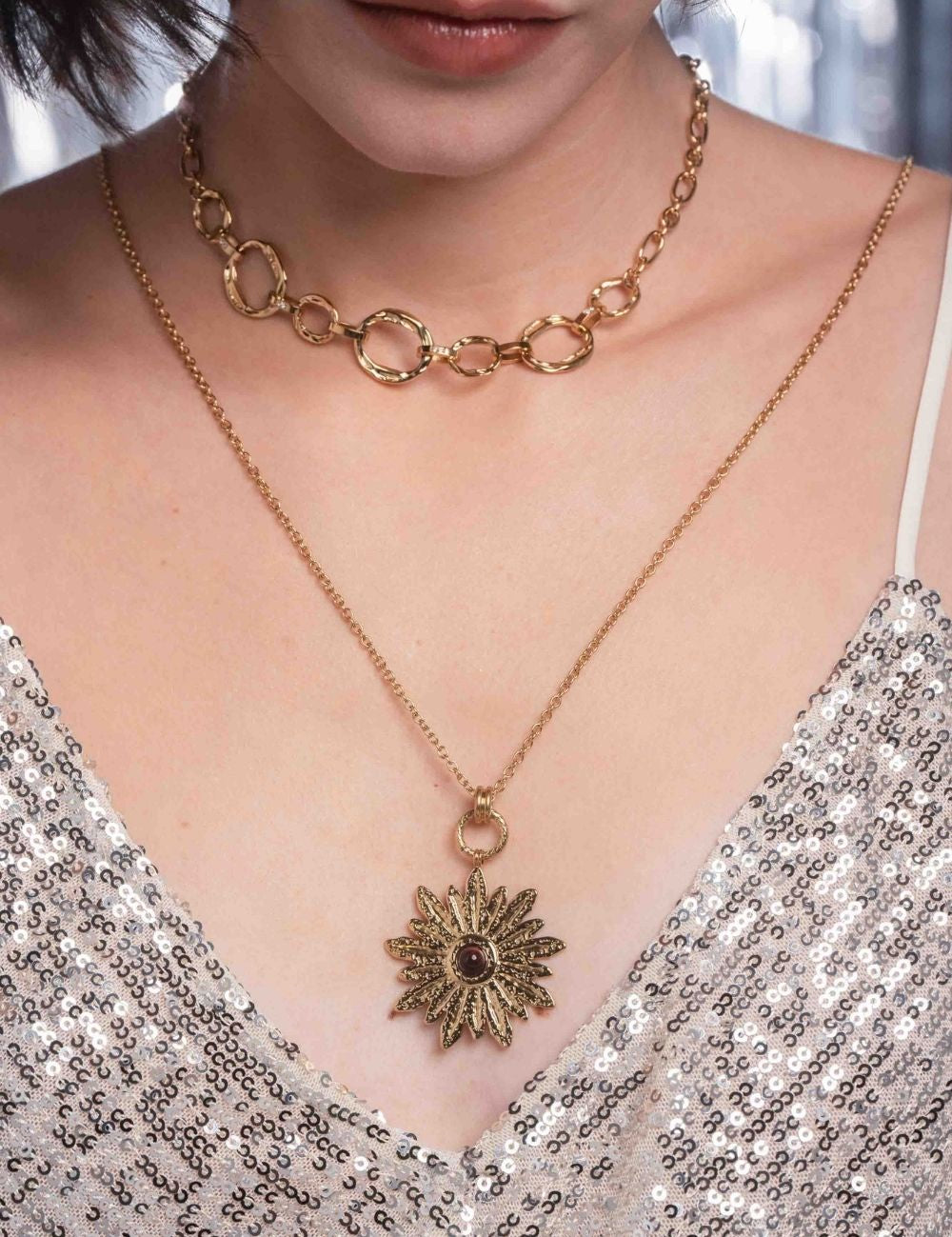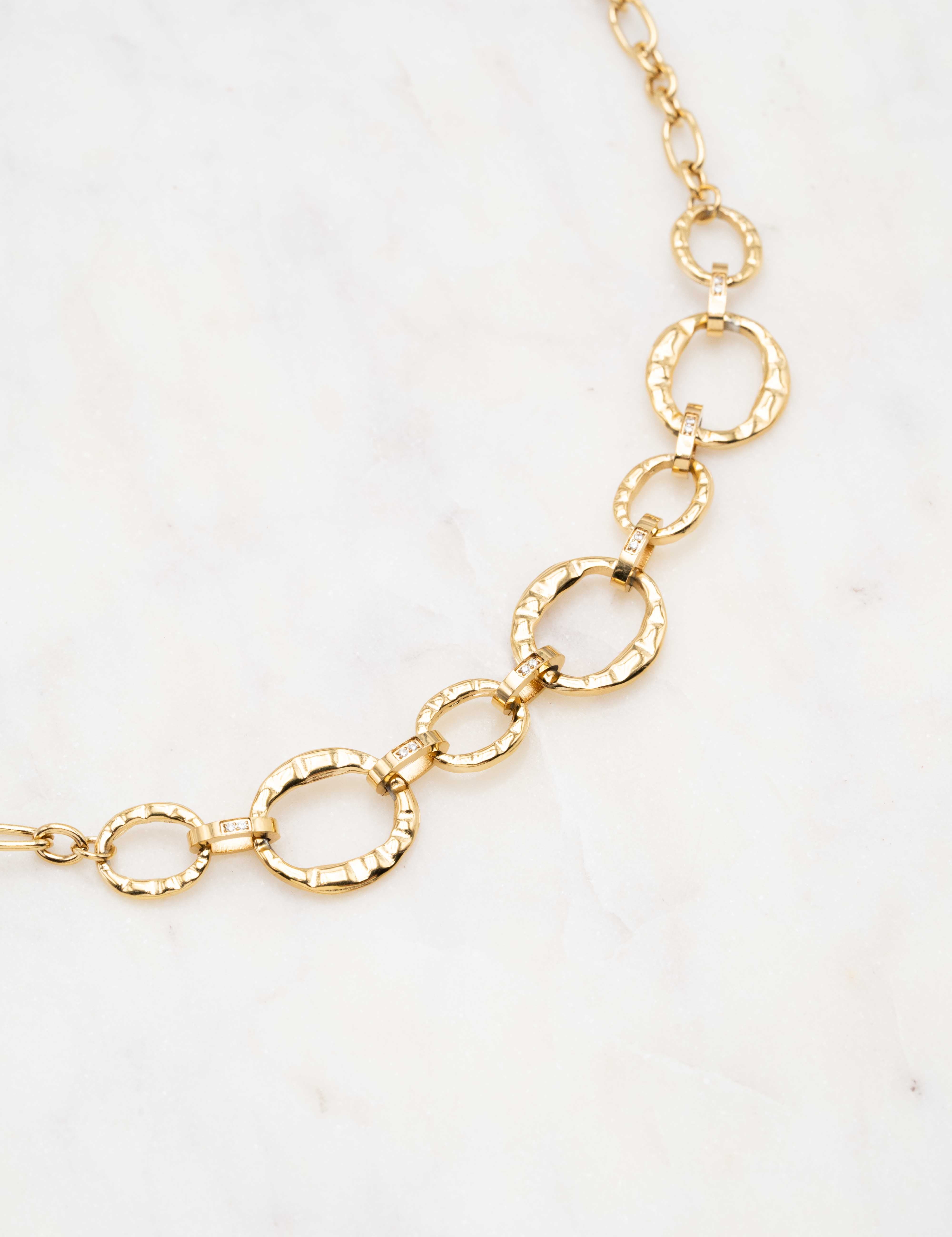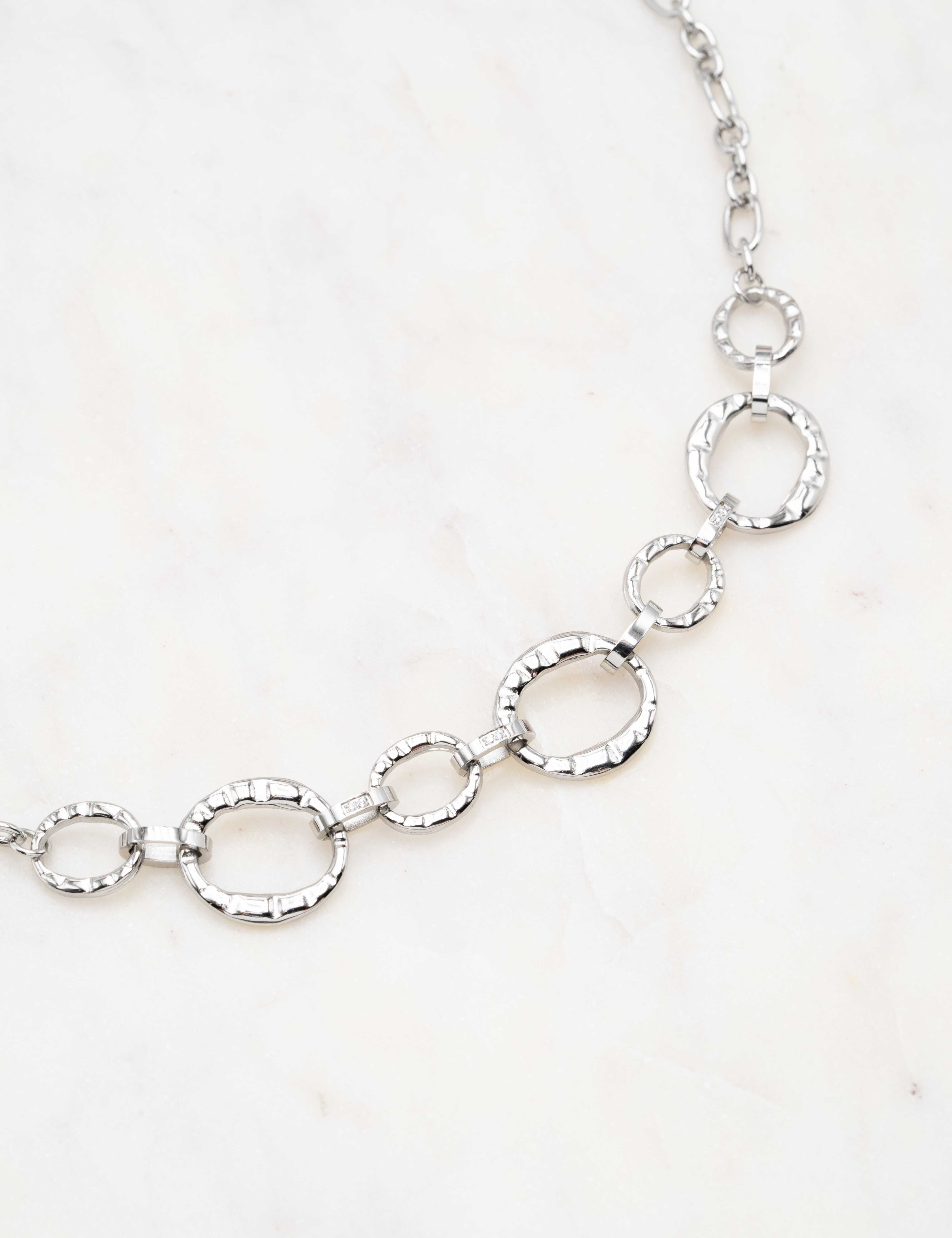 Collier réglable sur chaîne en maille composé de multi-anneaux texturés et anneaux lisses ornés de strass.