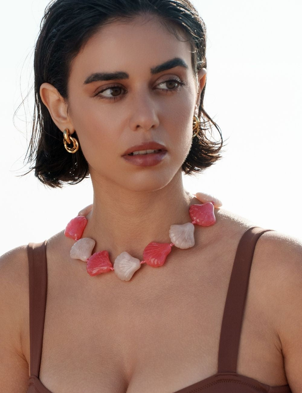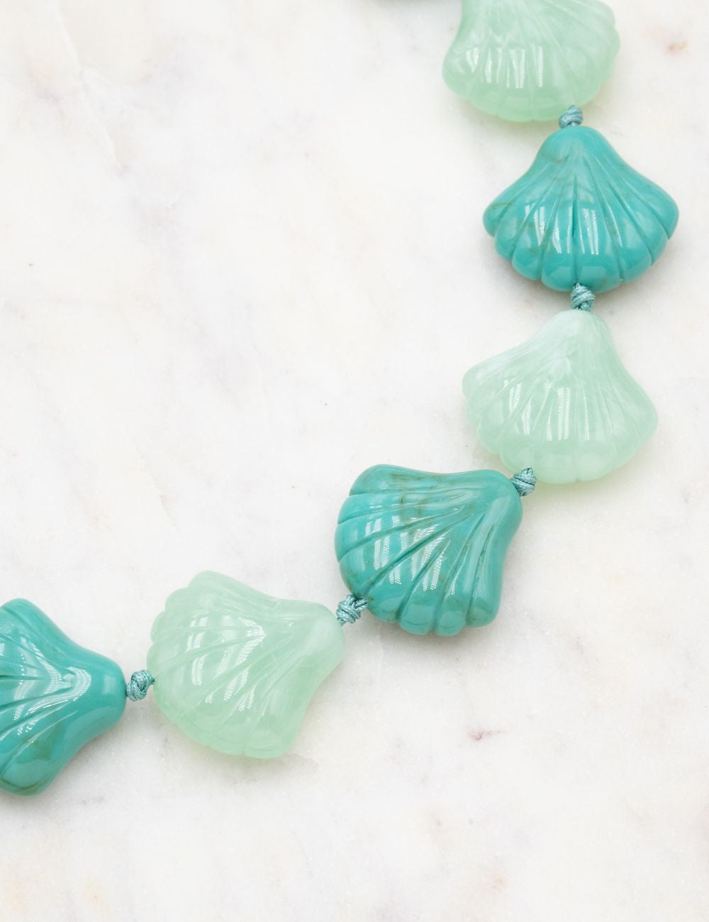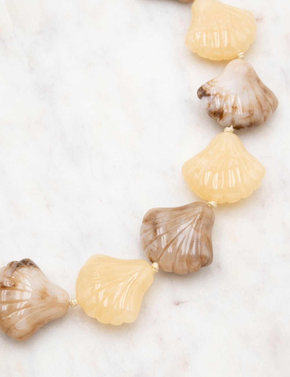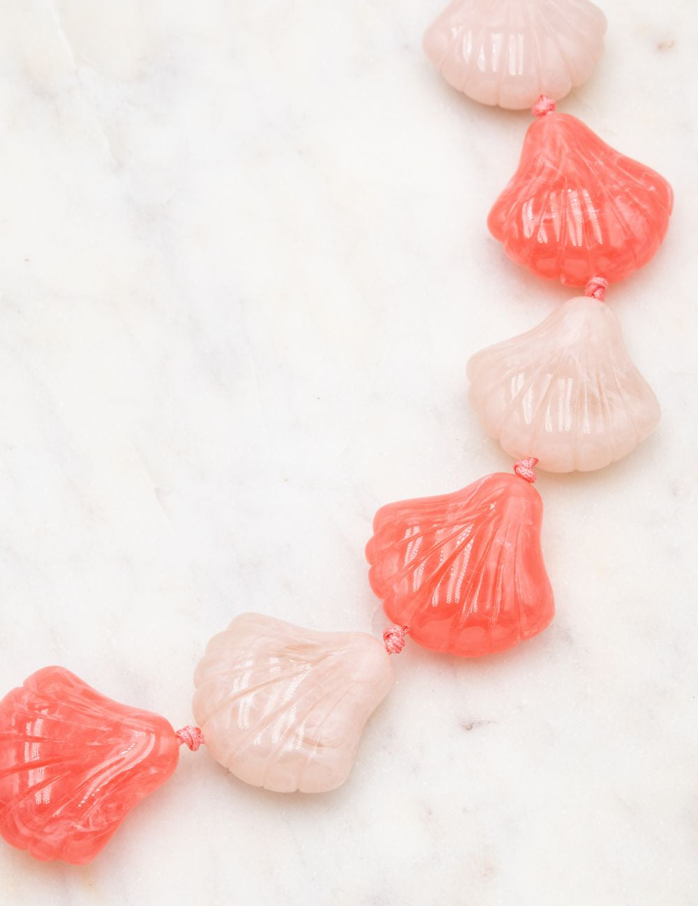Collier réglable composé d'un enfilage de perles (formes coquillages) en résine colorée.