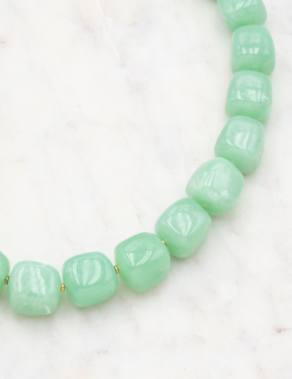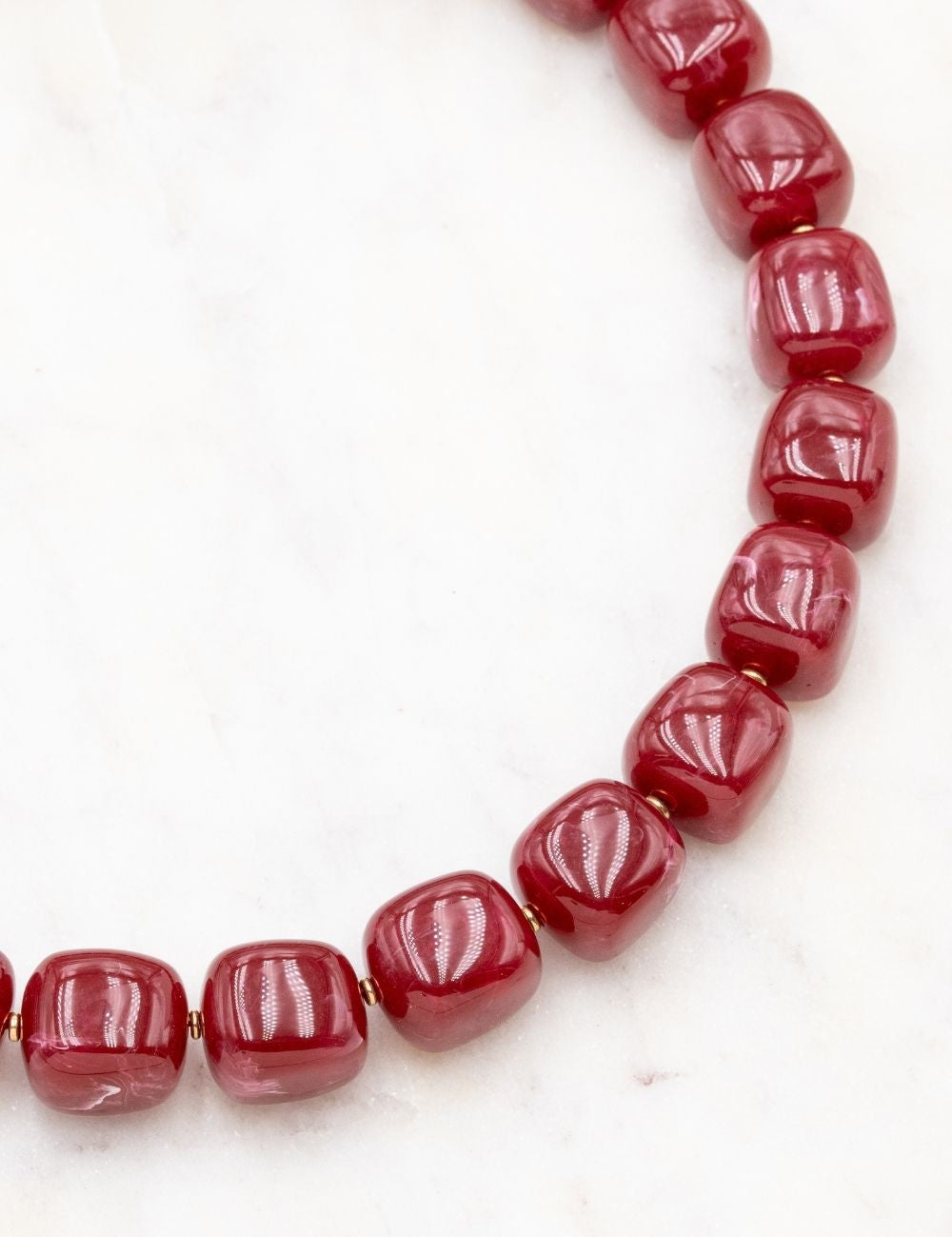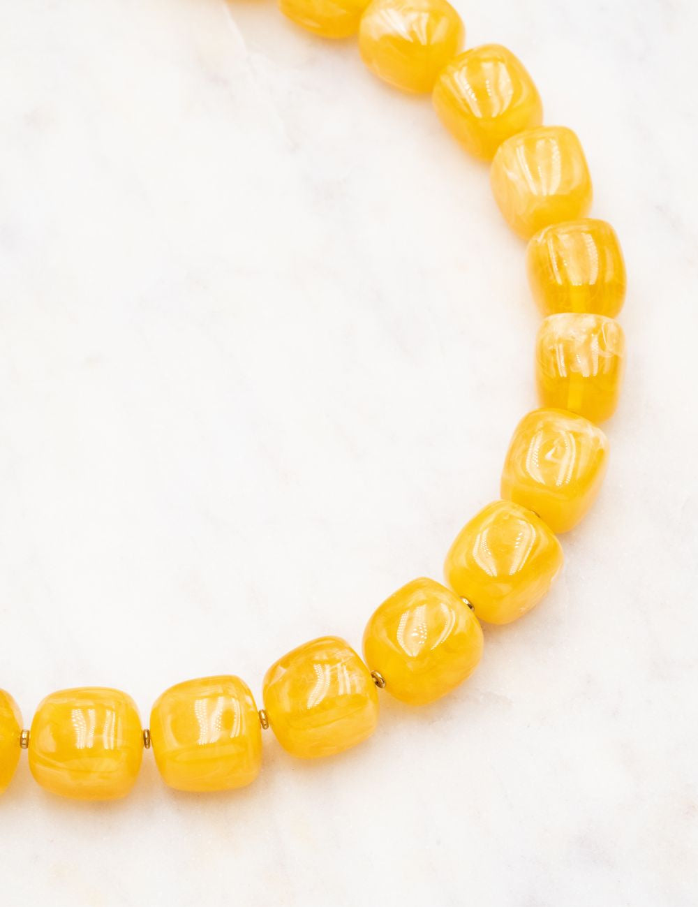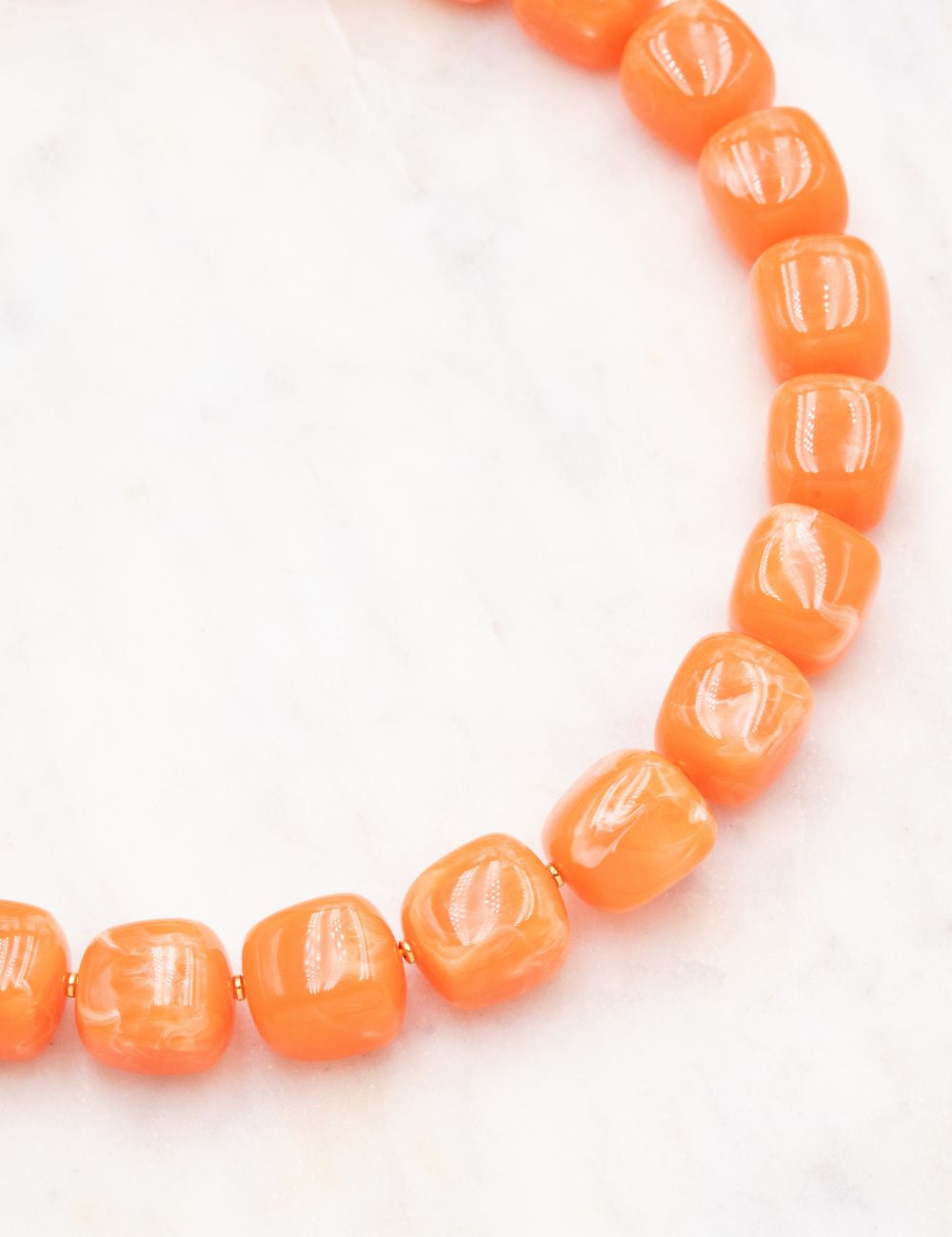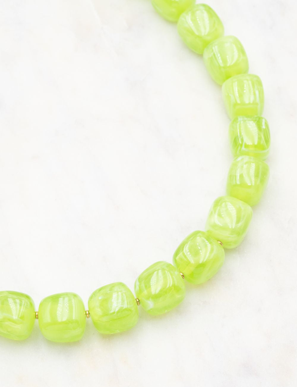 Collier réglable composé d'un enfilage de perles en résine colorée.