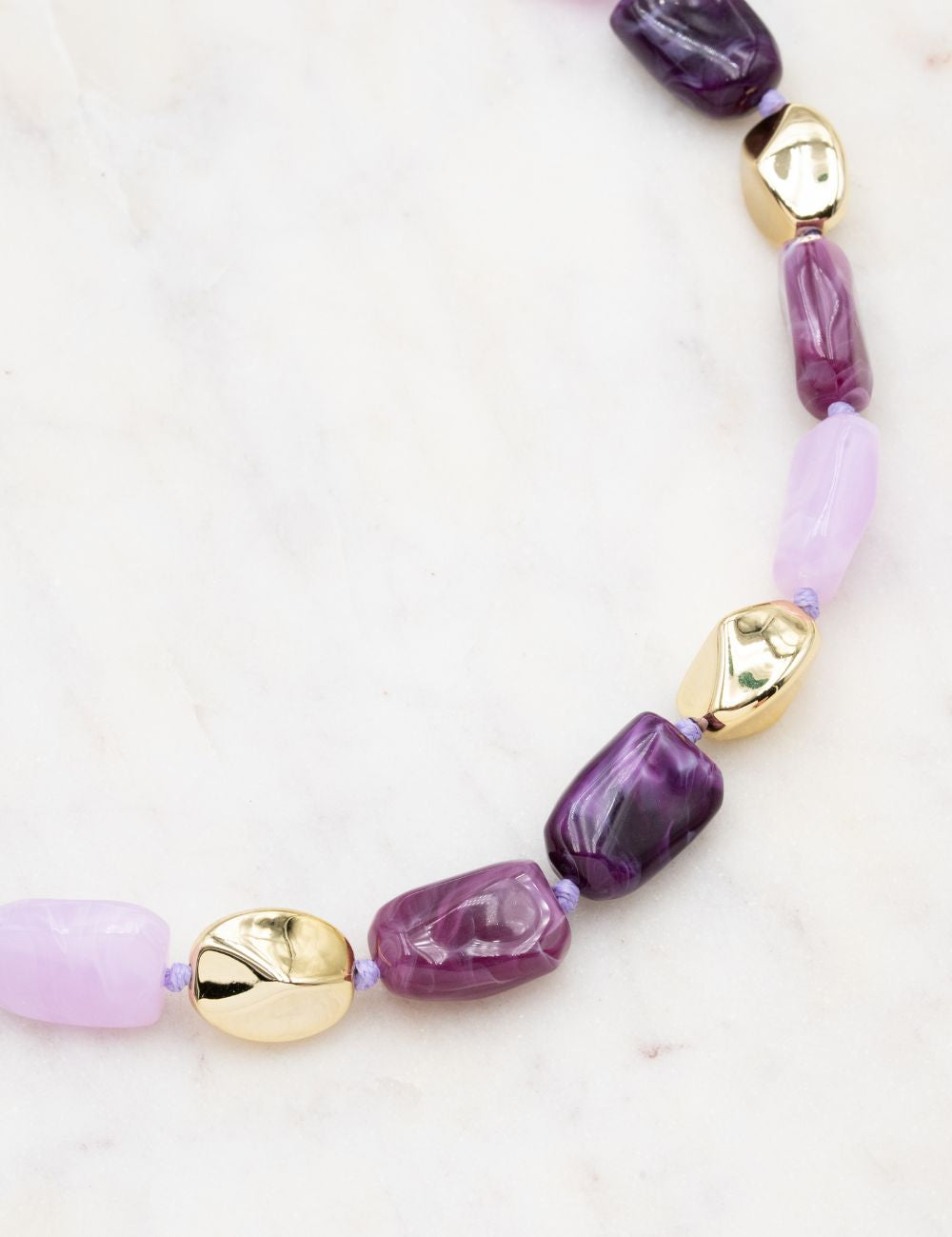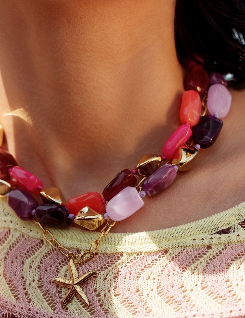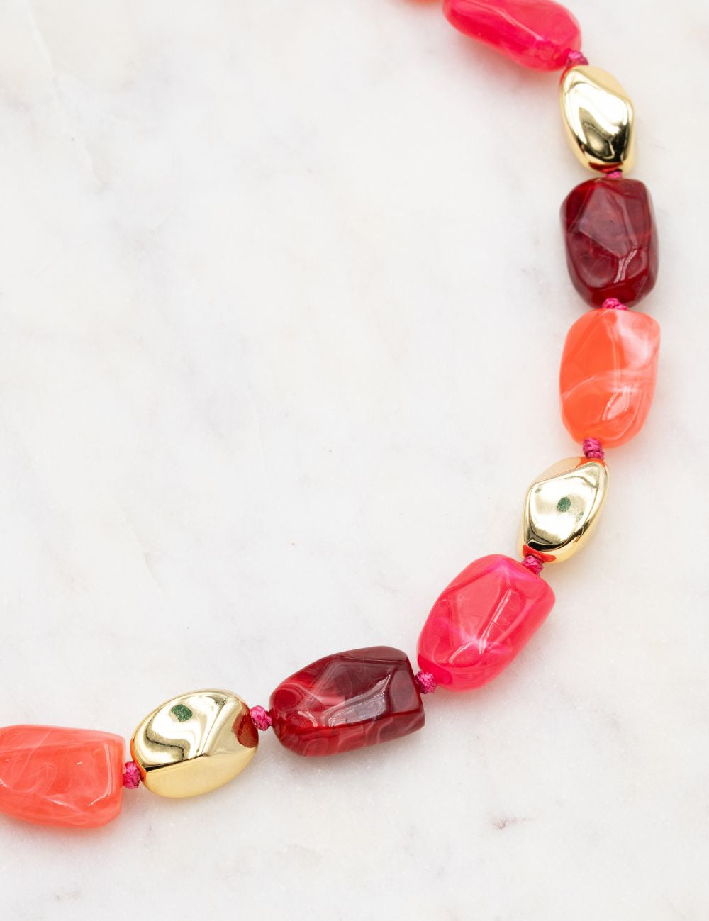 Collier réglable composé d'un enfilage de perles en résine colorée et perles dorées graphiques en acier inoxydable.