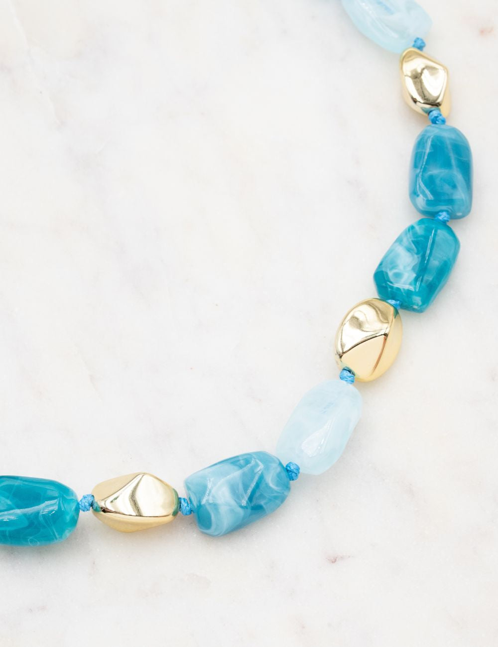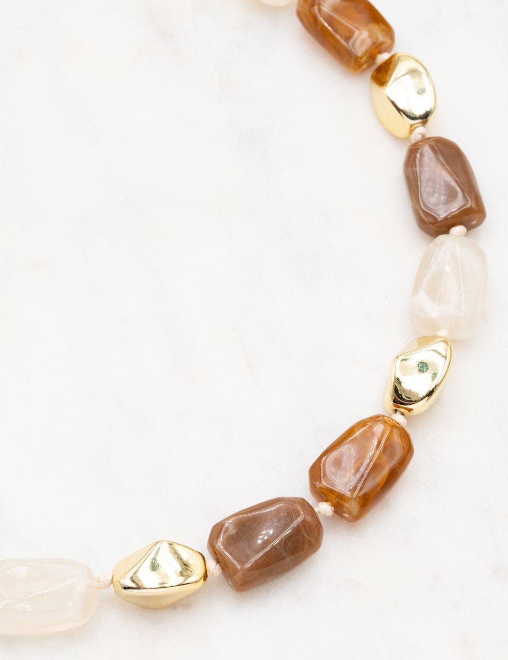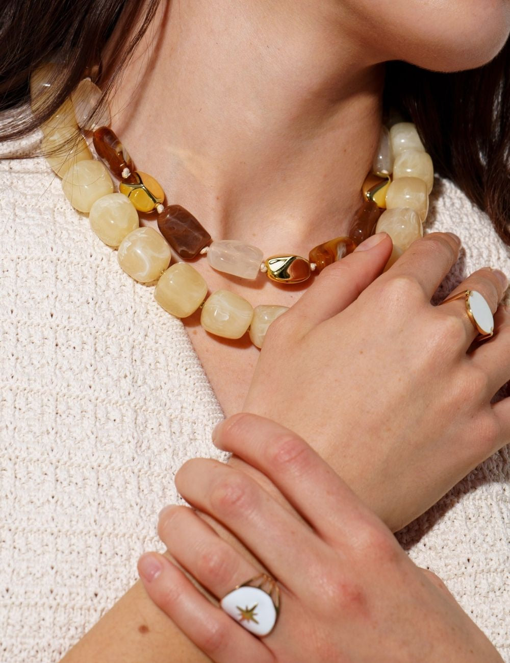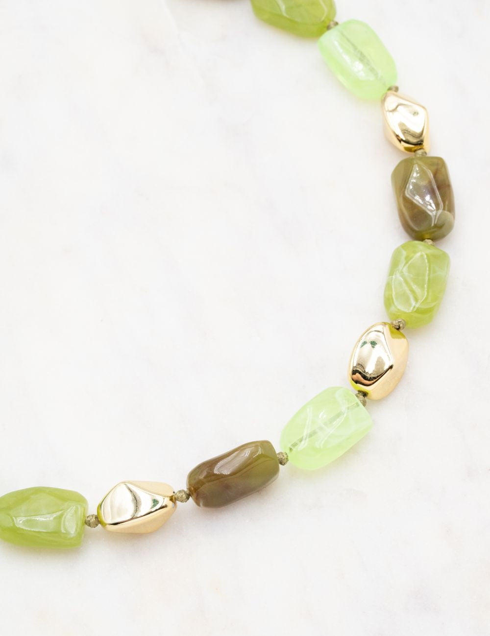 Collier réglable composé d'un enfilage de perles en résine colorée et perles dorées graphiques en acier inoxydable.