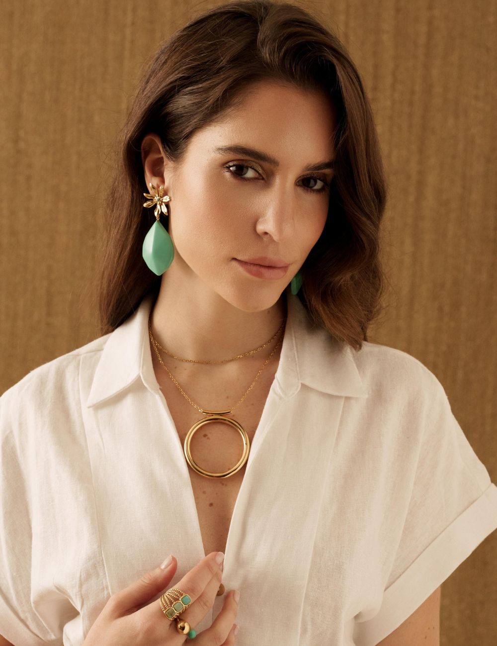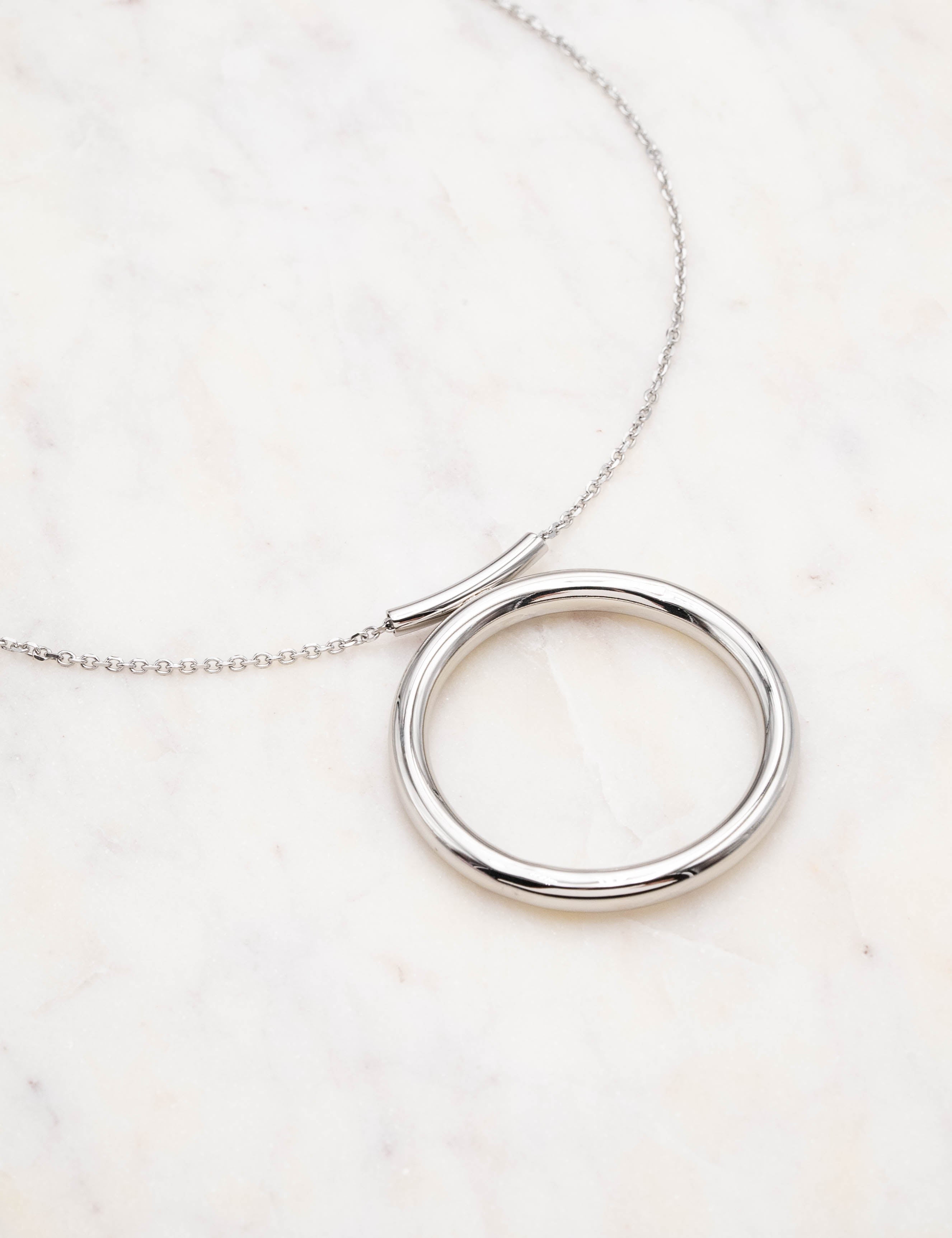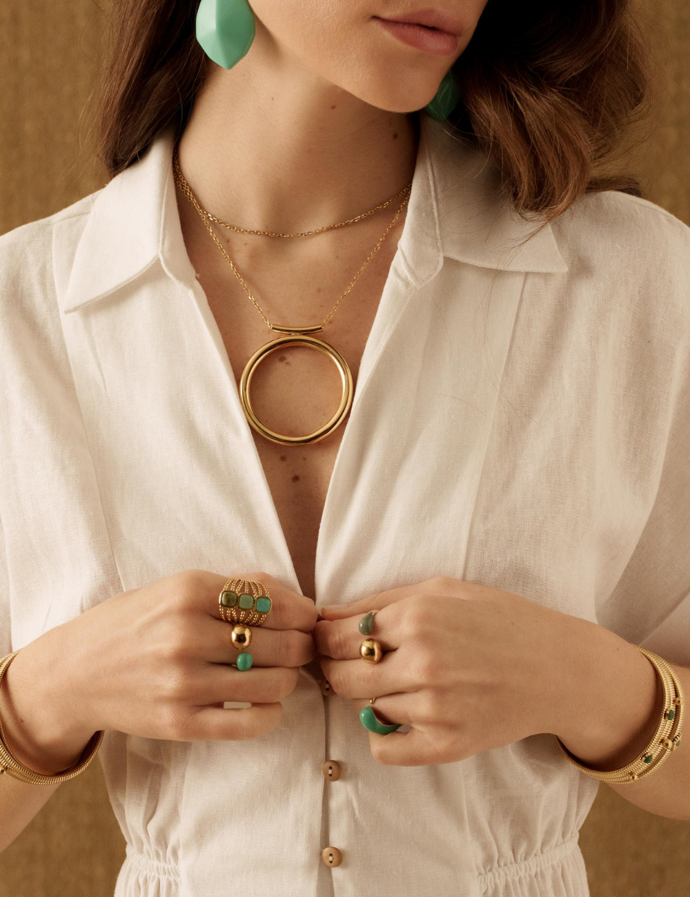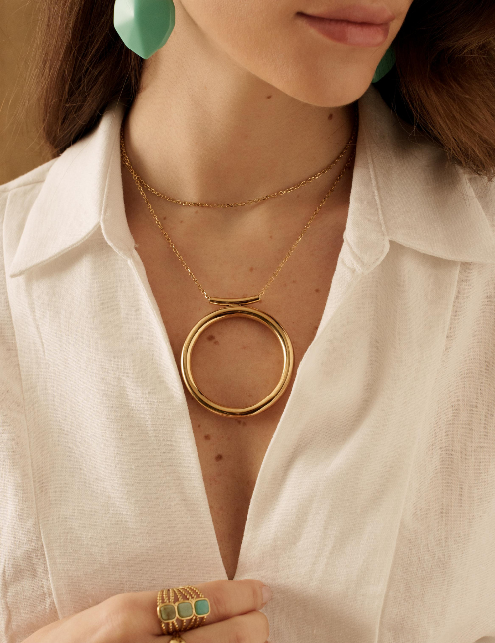 Collier réglable sur chaîne type sautoir composé d'un pendentif anneau Fermoir mousqueton et chaînette de réglage.