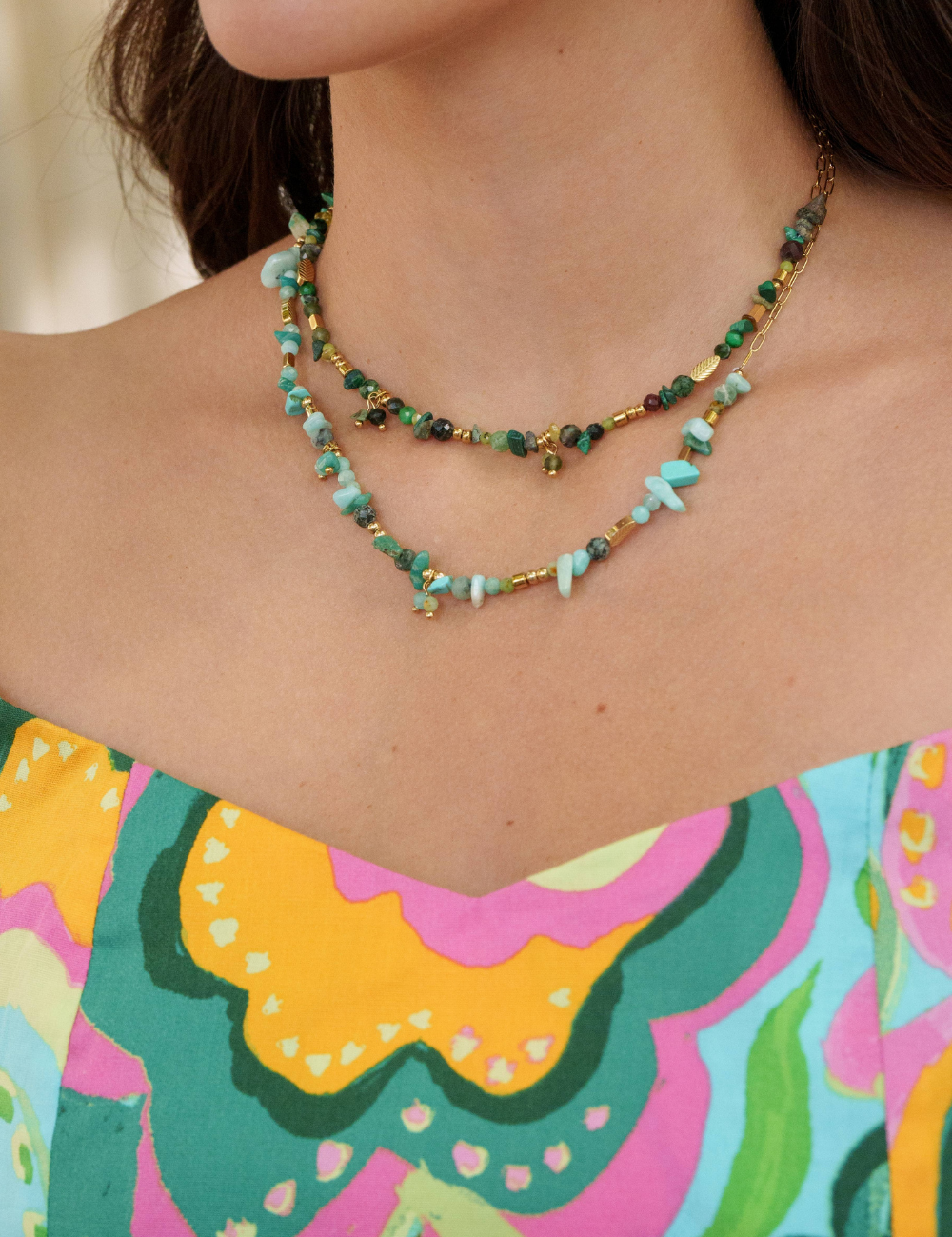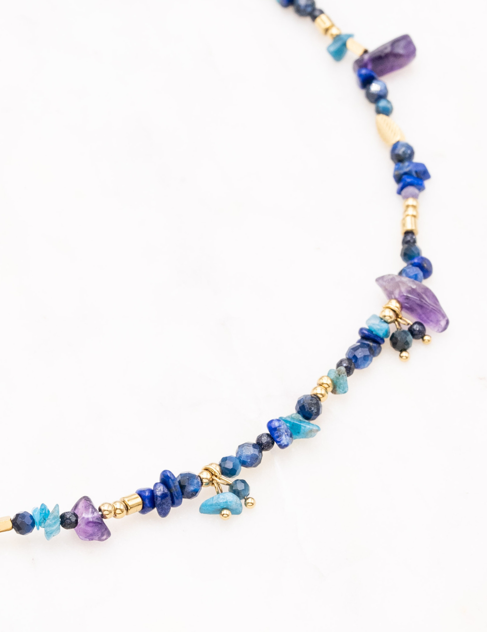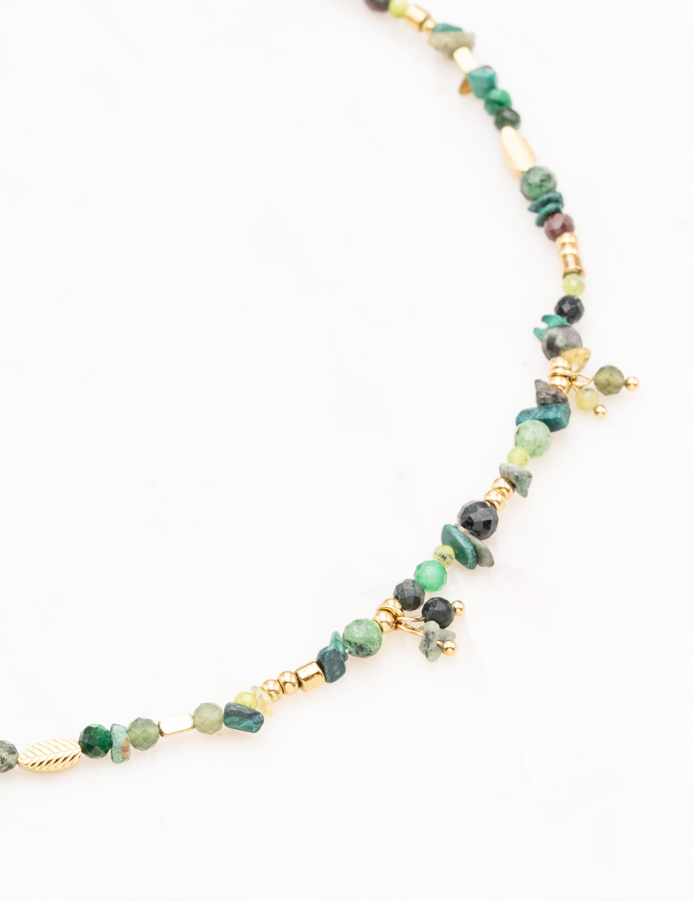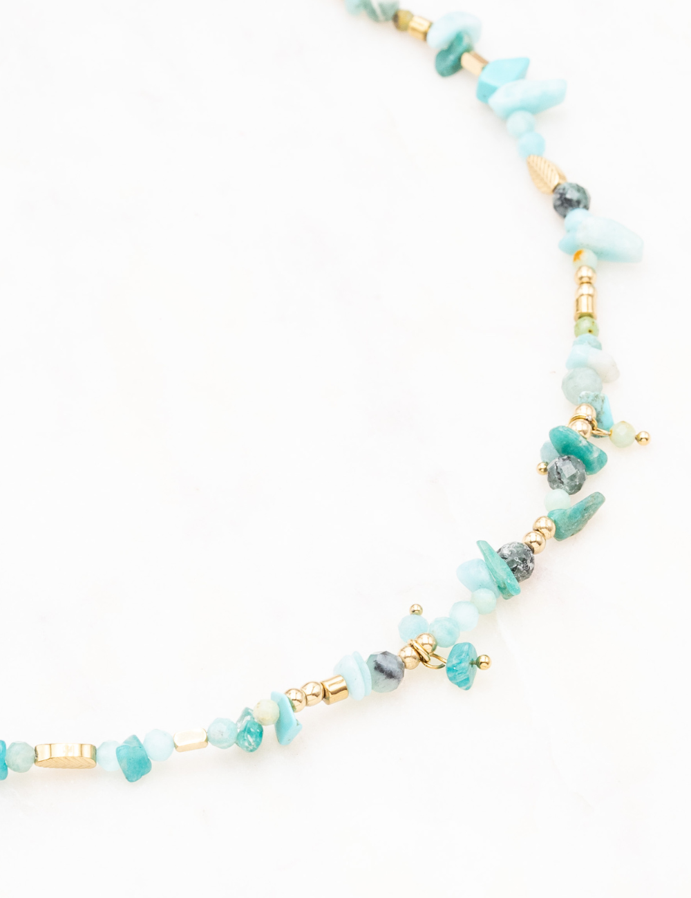 Collier réglable sur chaine composé d'un joli enfilage de perles en pierres naturelles, perles dorées et pampilles.