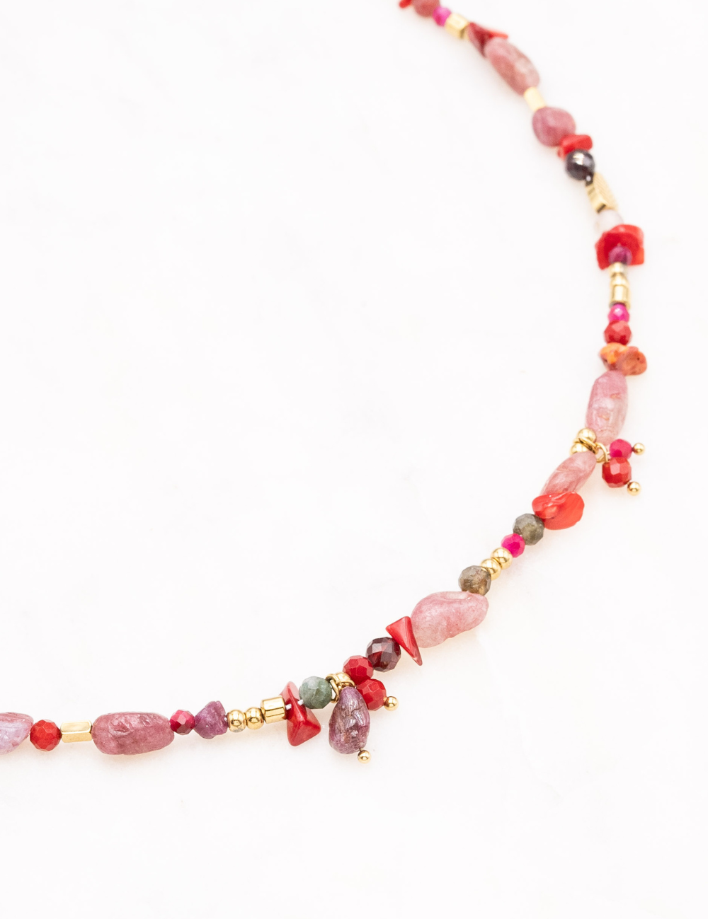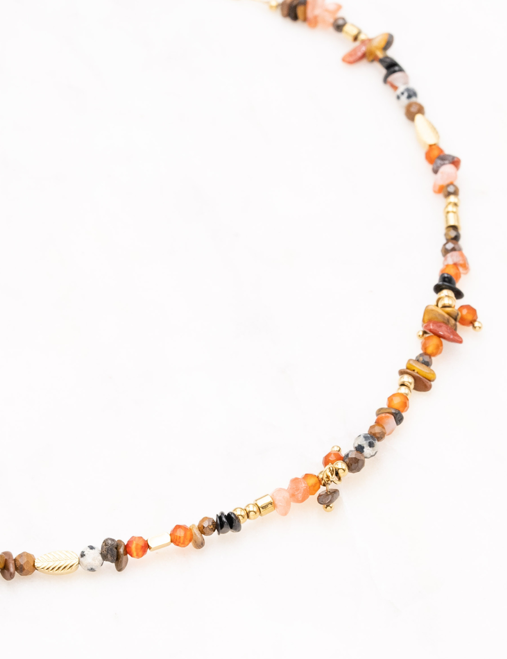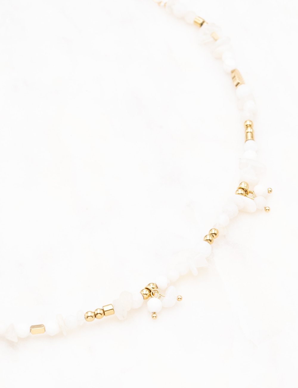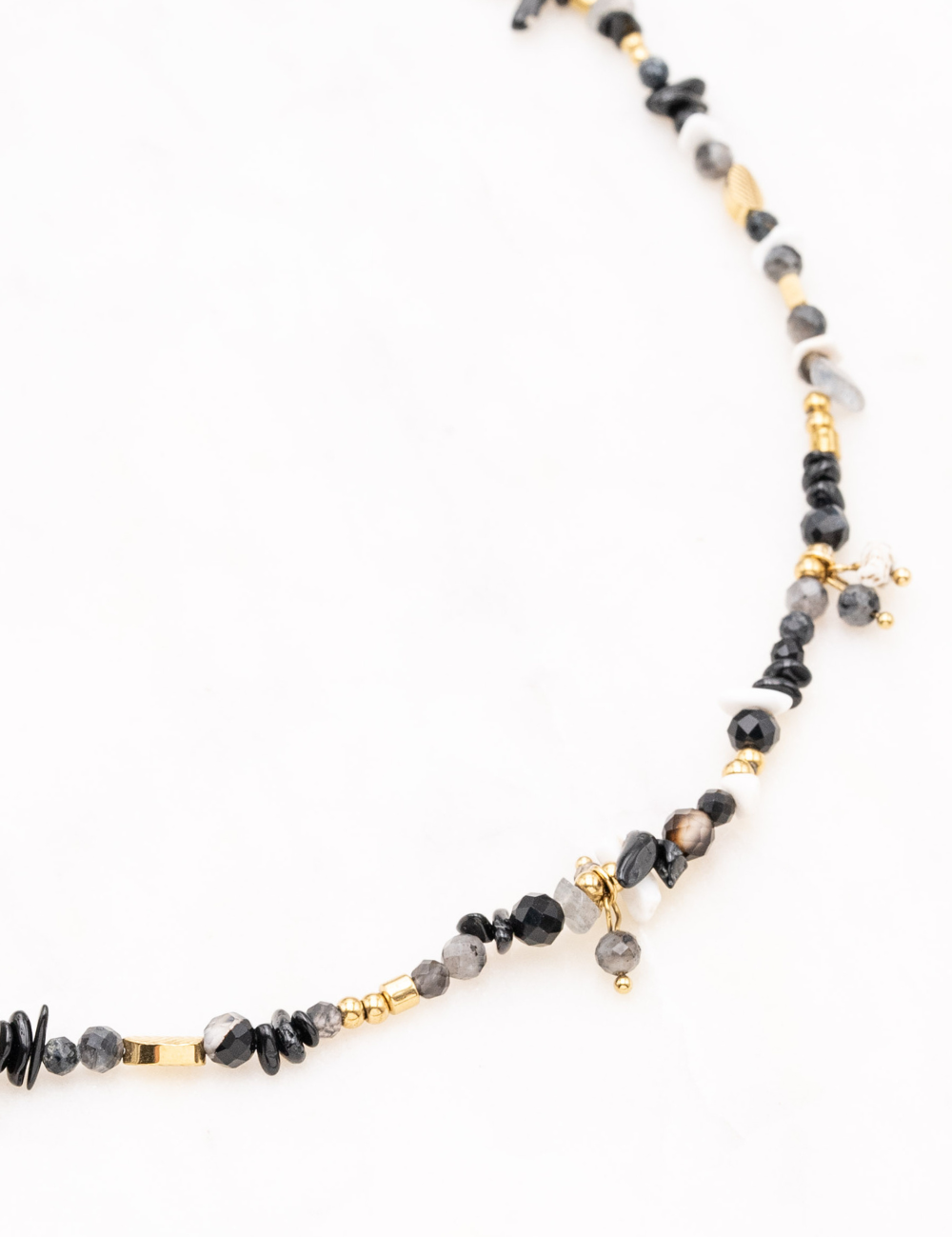 Collier réglable sur chaine composé d'un joli enfilage de perles en pierres naturelles, perles dorées et pampilles.