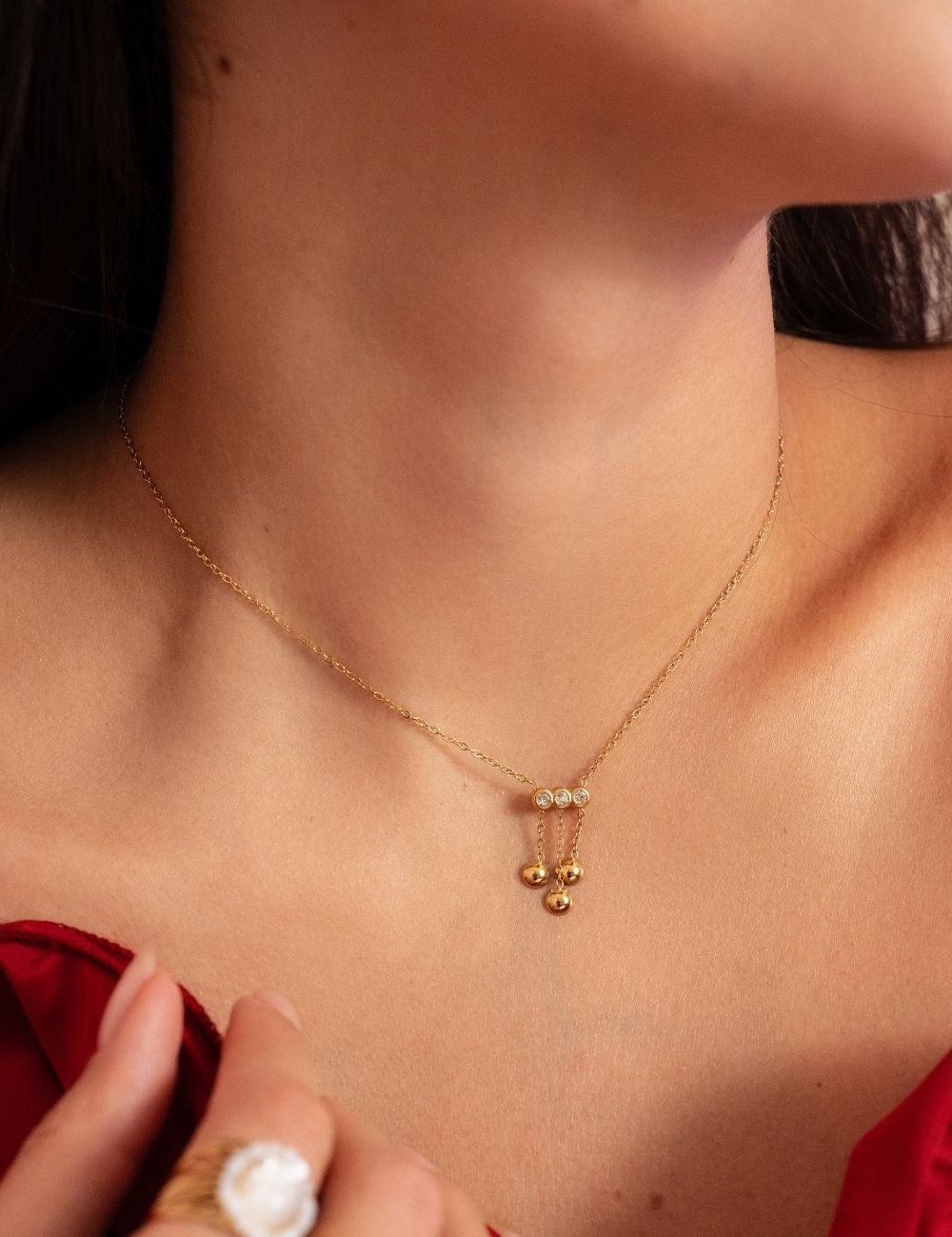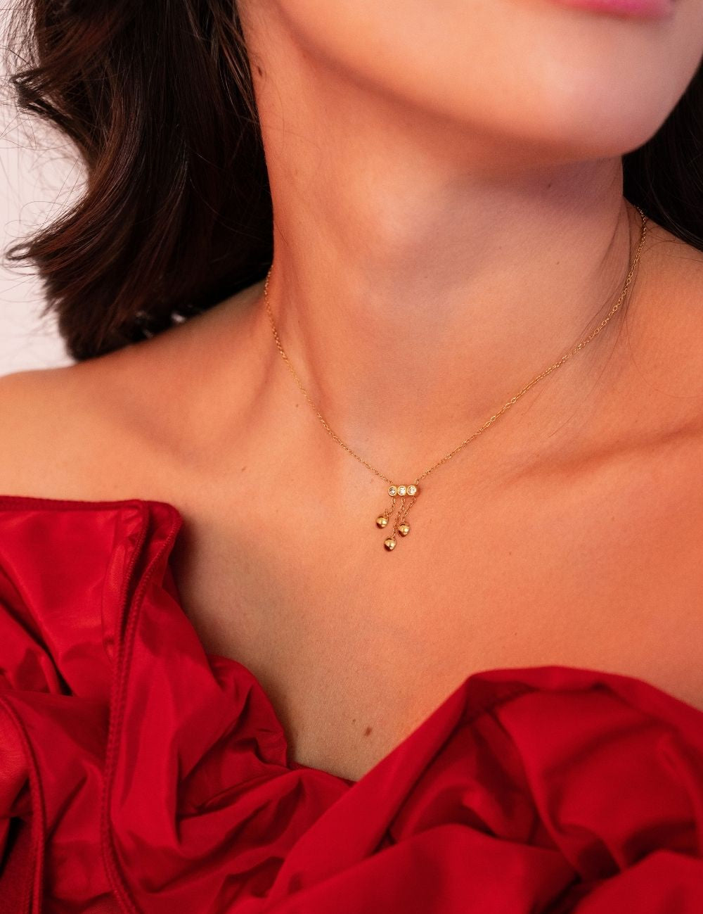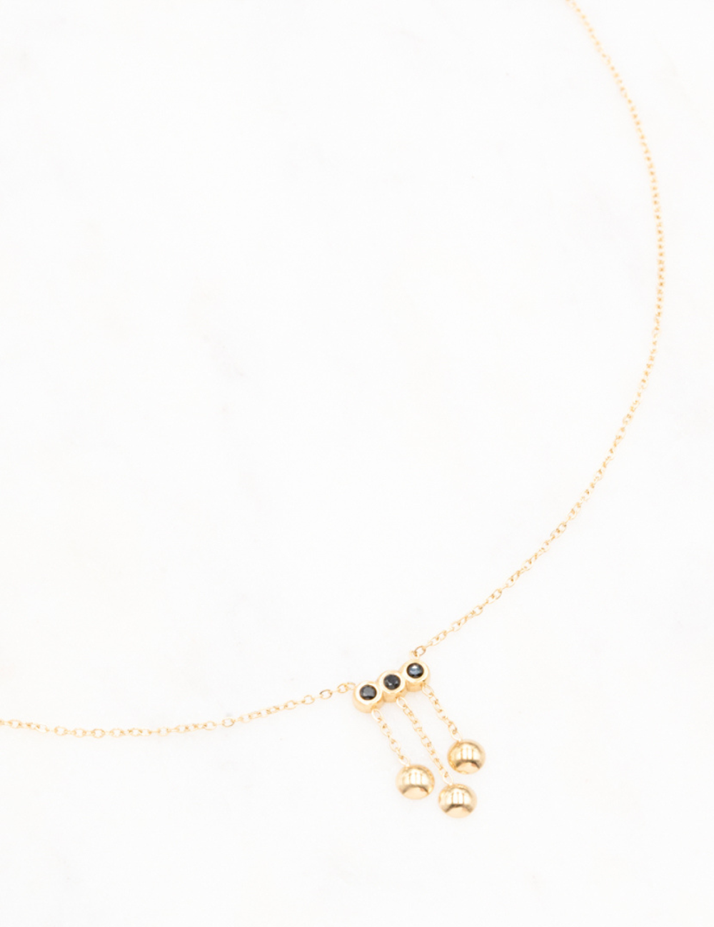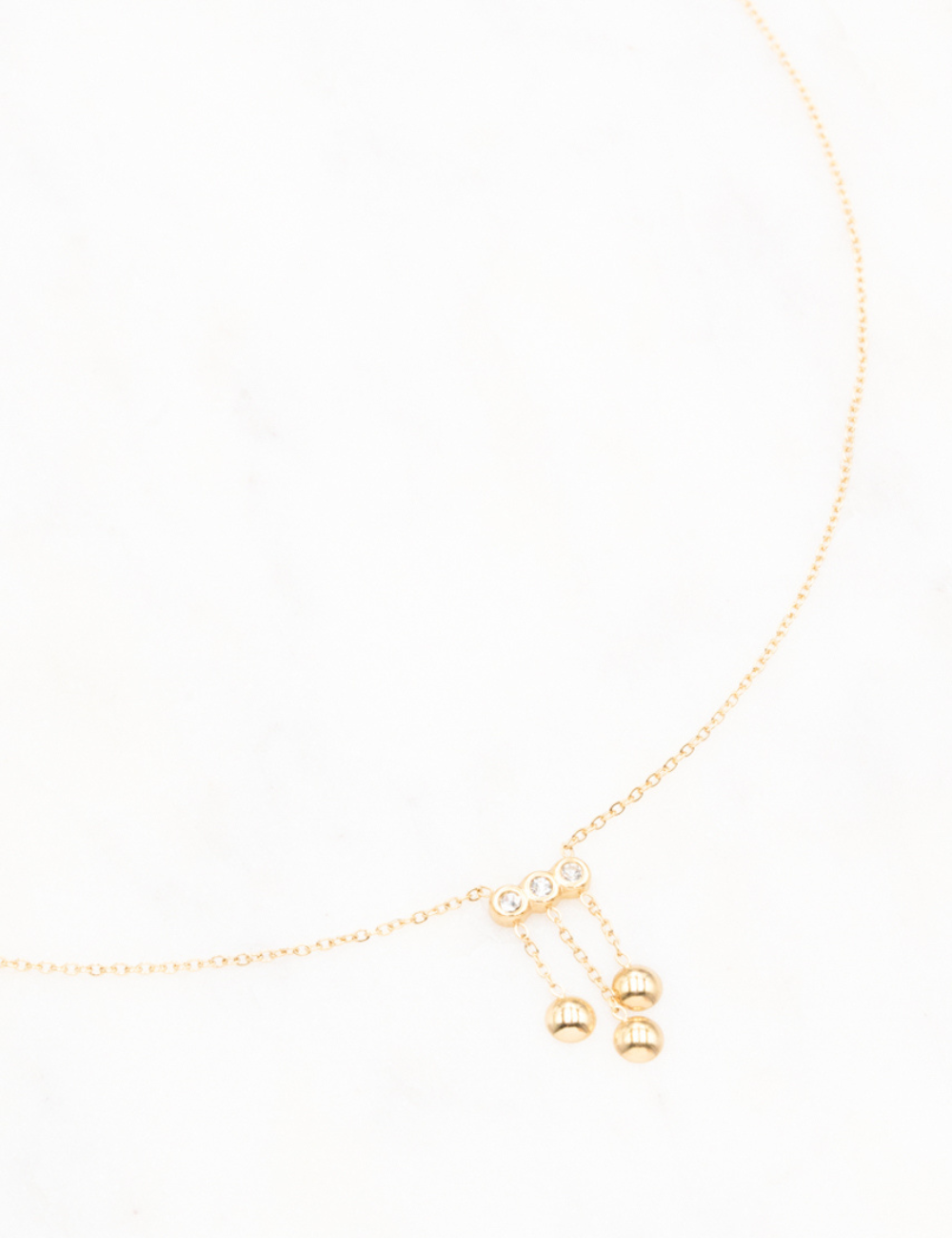 Collier réglable sur chaîne composé de chaînes et de pampilles rondes et de trois strass.