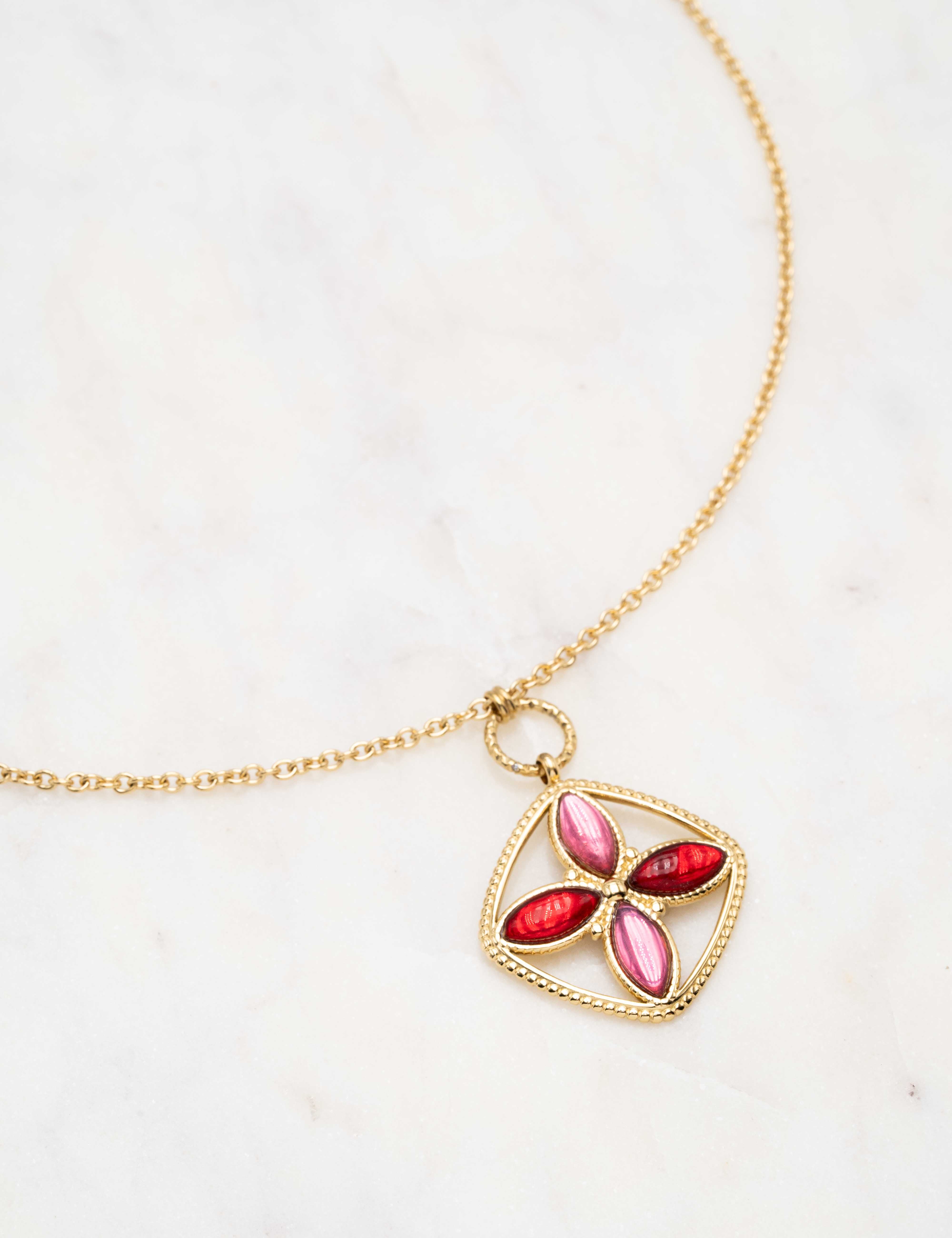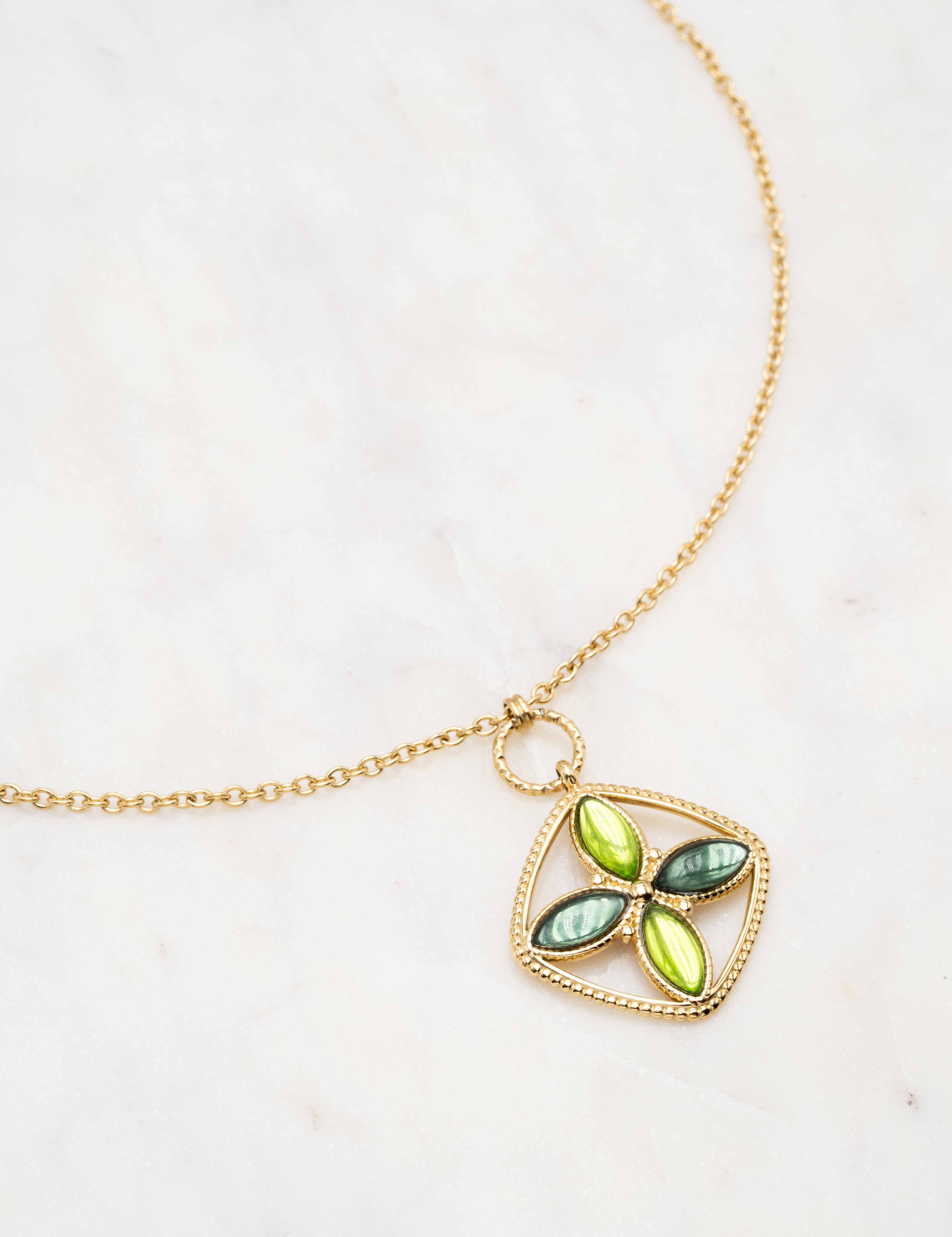 Collier sur chaîne type sautoir composé d'un pendentif anneau orné de pièces style cabochon coloré en pâte de verre.