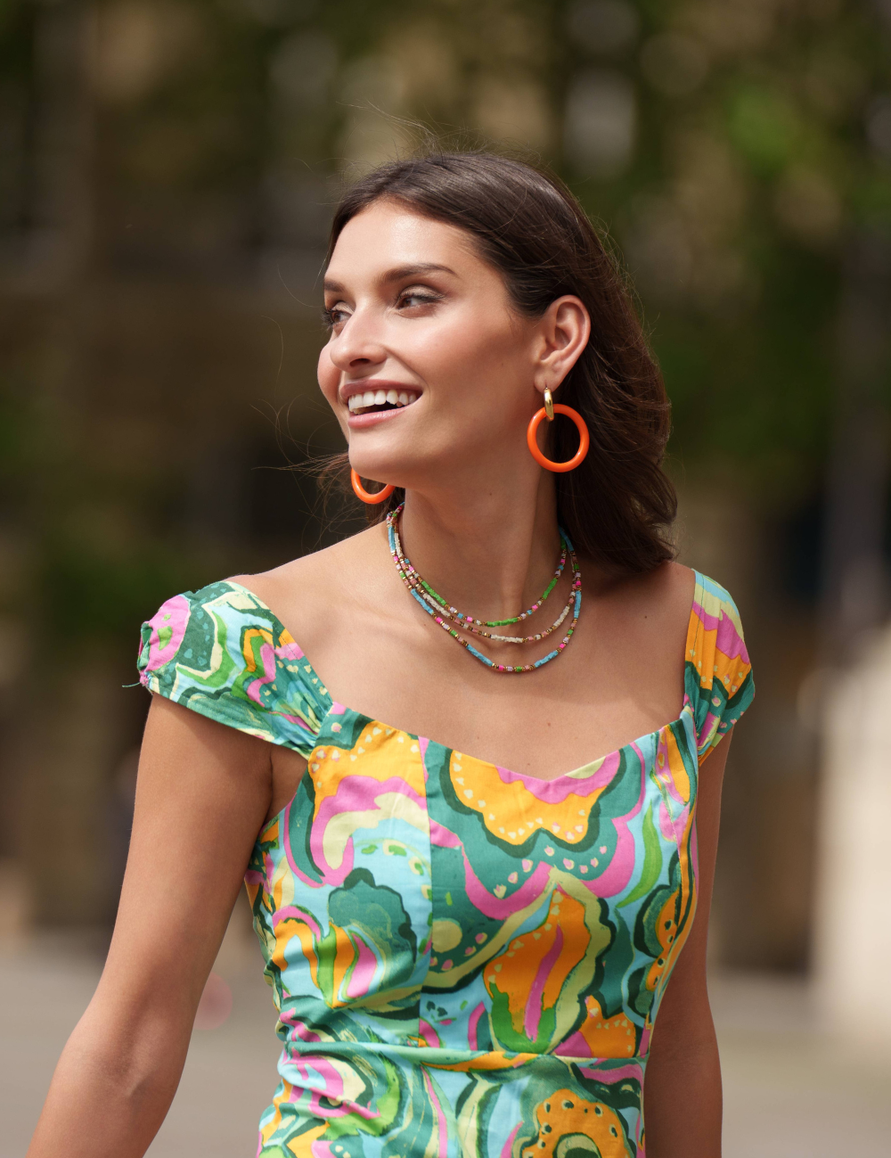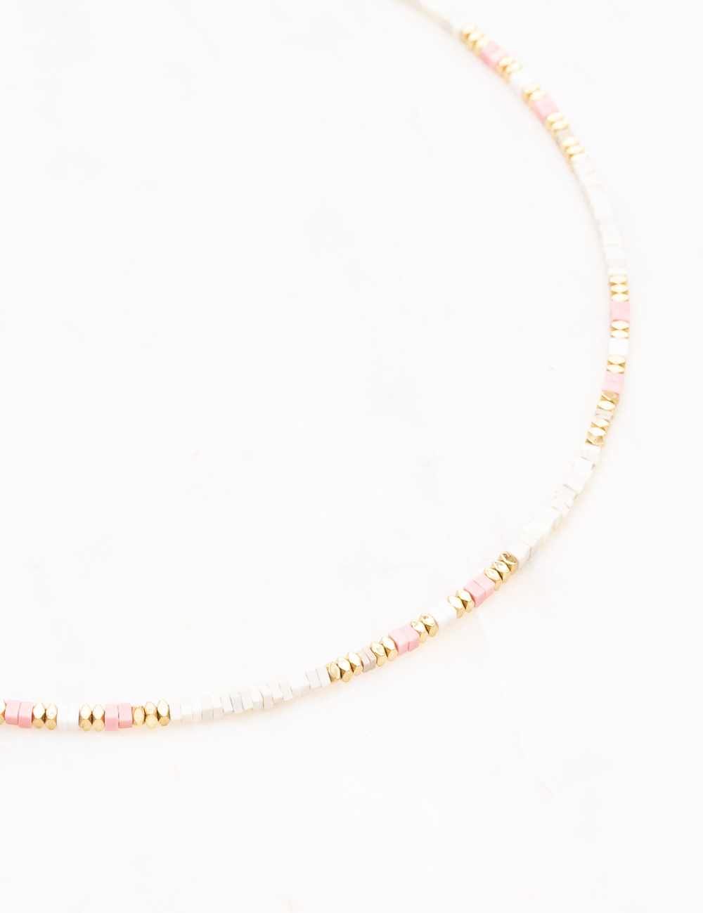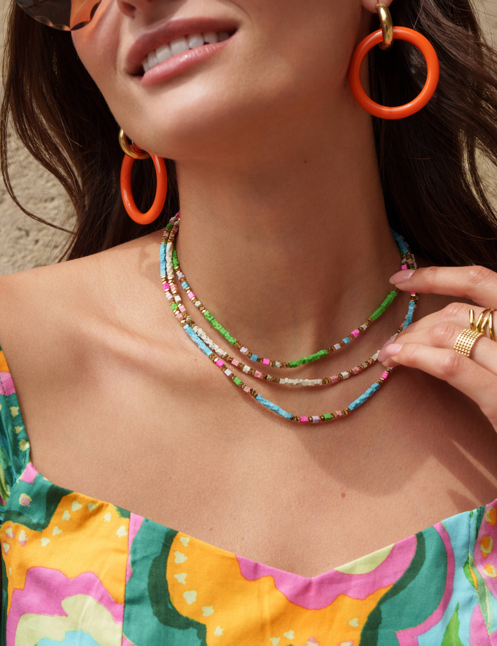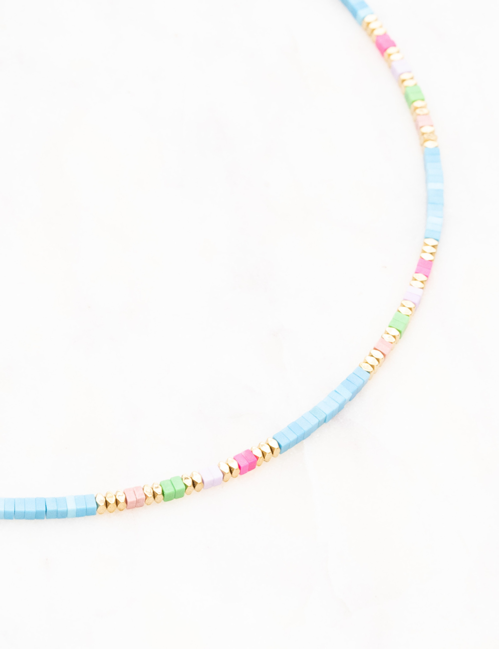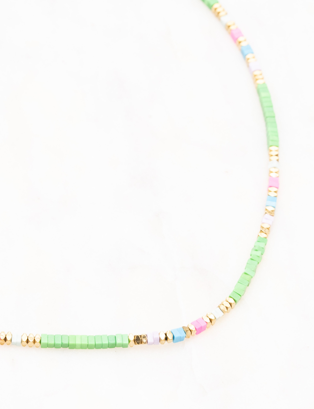 Collier sur chaîne composé d'un joli enfilage de perles multicolores en pierres naturelles et perles dorées.