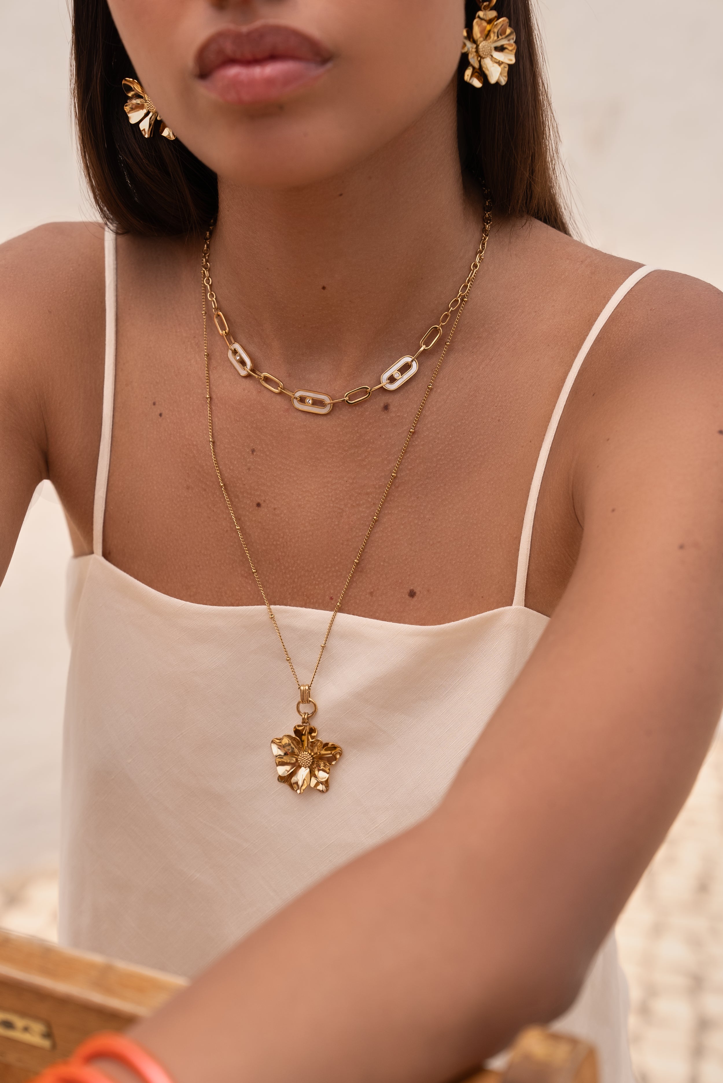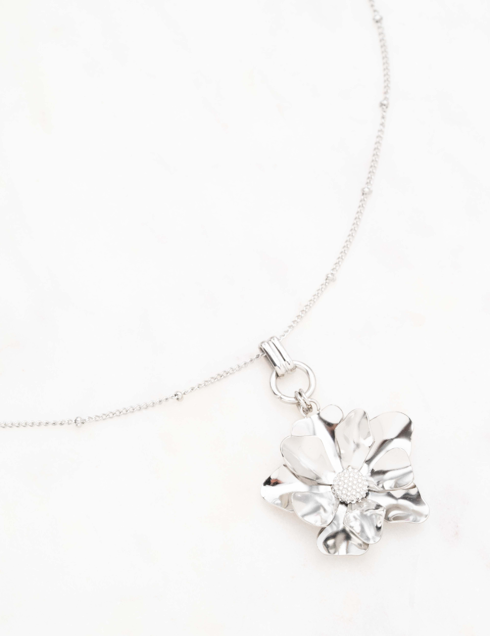 Collier réglable sur chaîne type sautoir composé d'un pendant formant une fleur texturée.