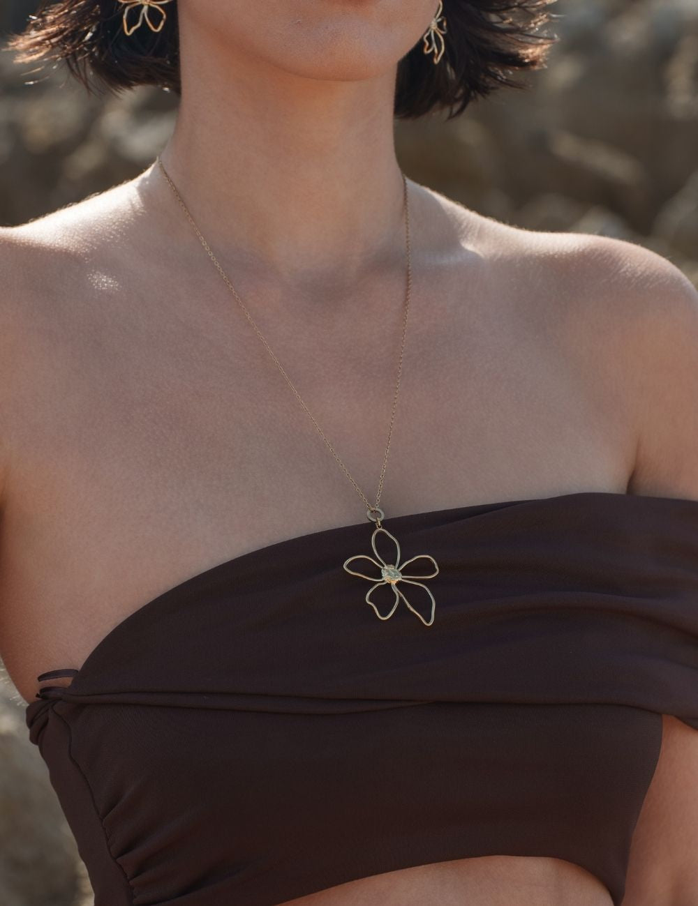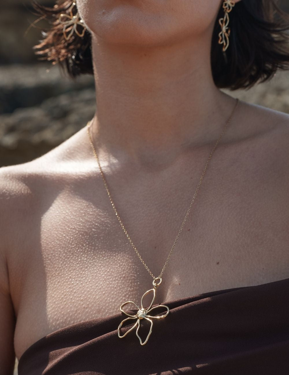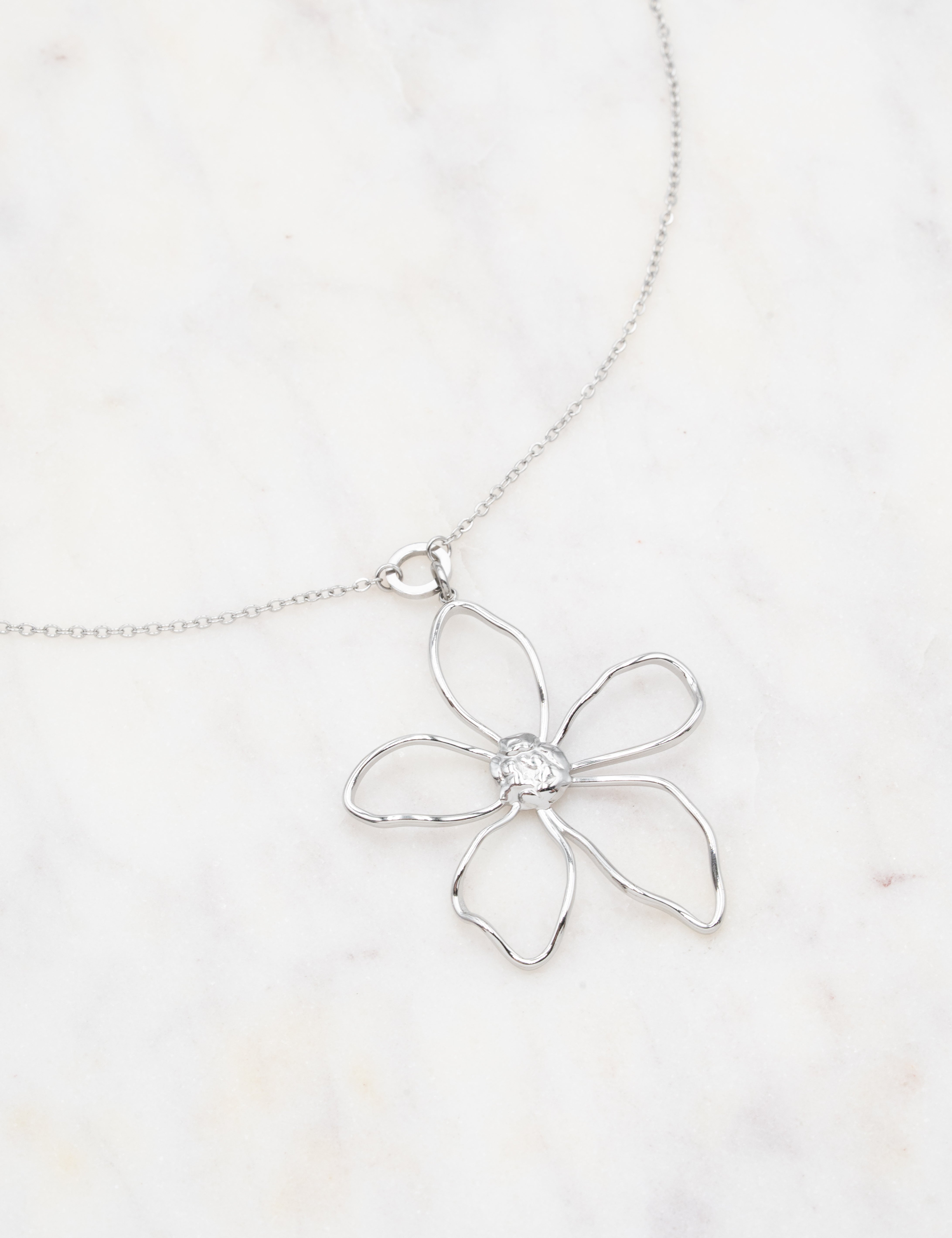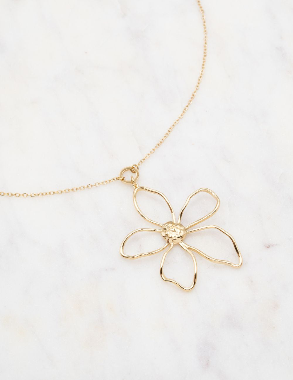 Collier sur chaîne type sautoir réglable  composé d'un pendant floral ajouré.