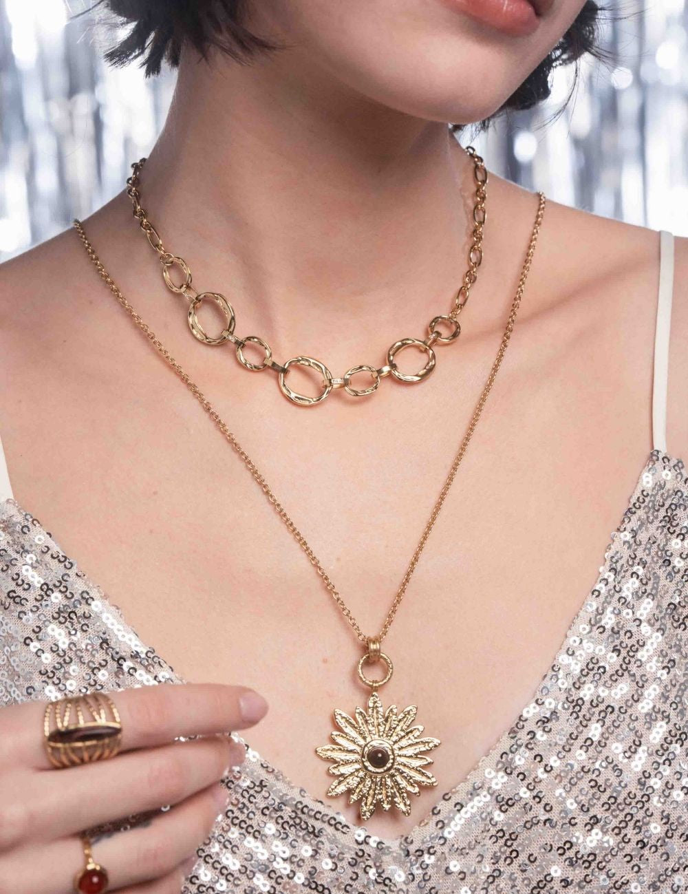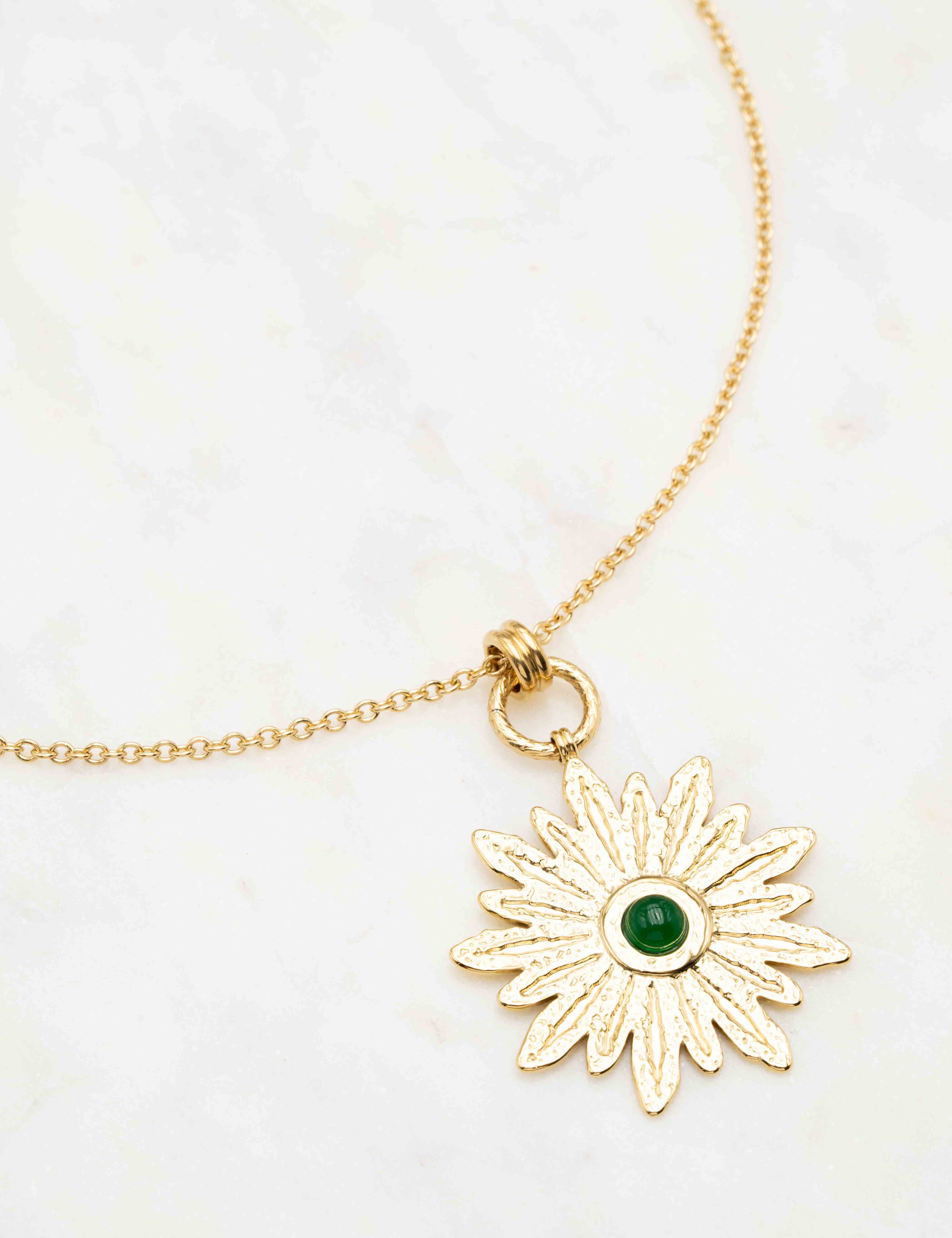 Collier réglable sur chaîne type sautoir composé d'un pendentif feuillage orné d'une pierre naturelle.