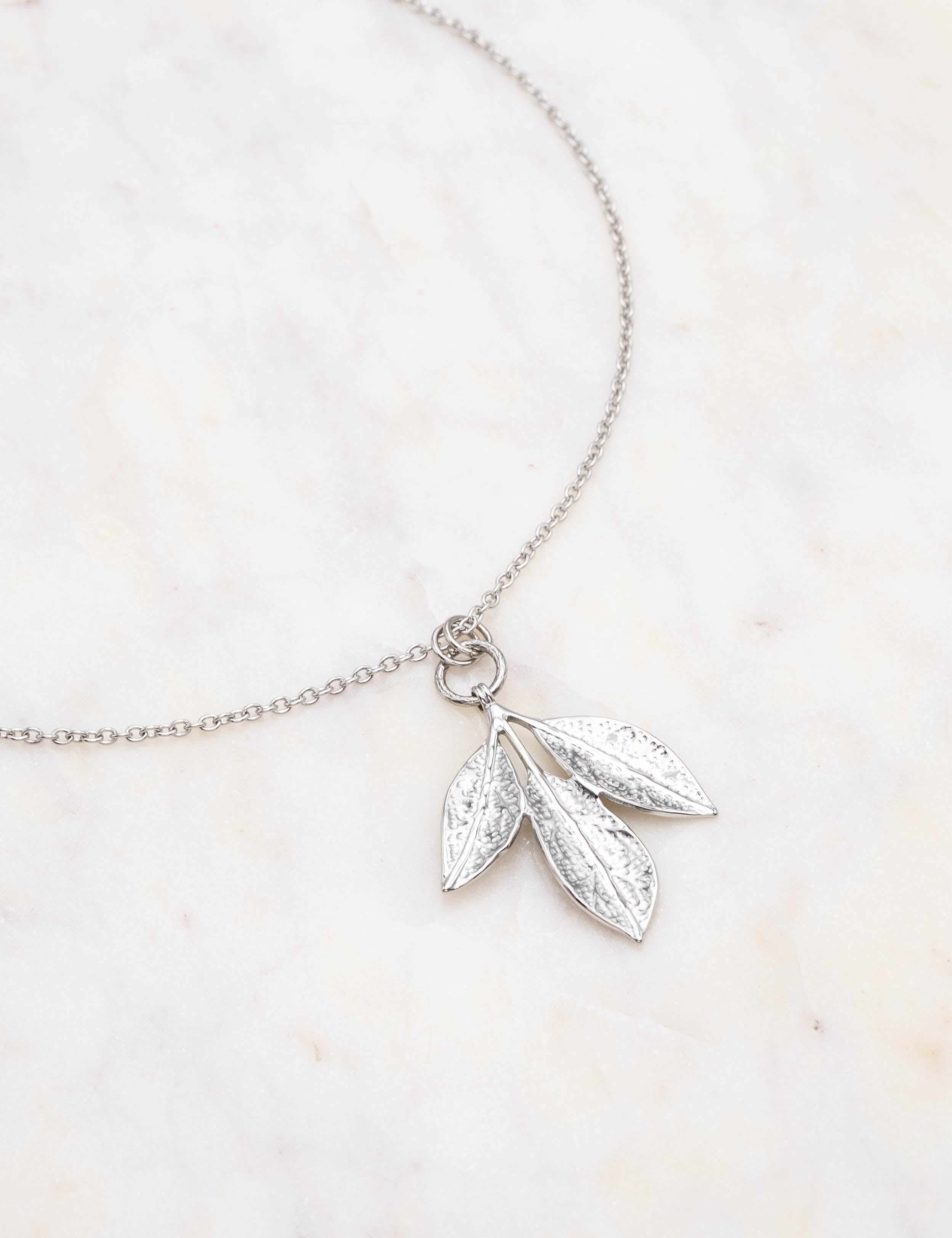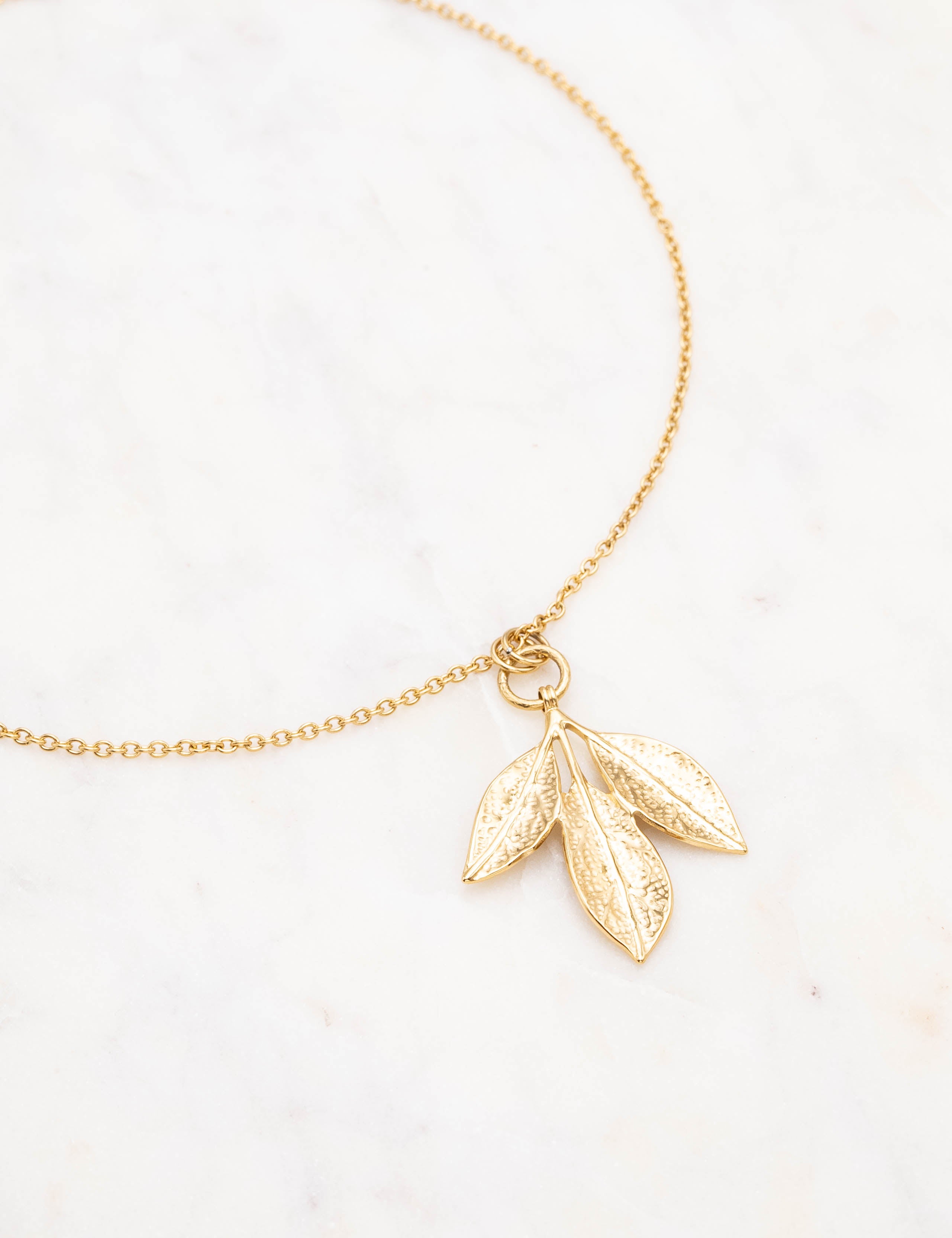 Collier sur chaîne type sautoir composé d'un pendentif avec trois feuilles texturés.