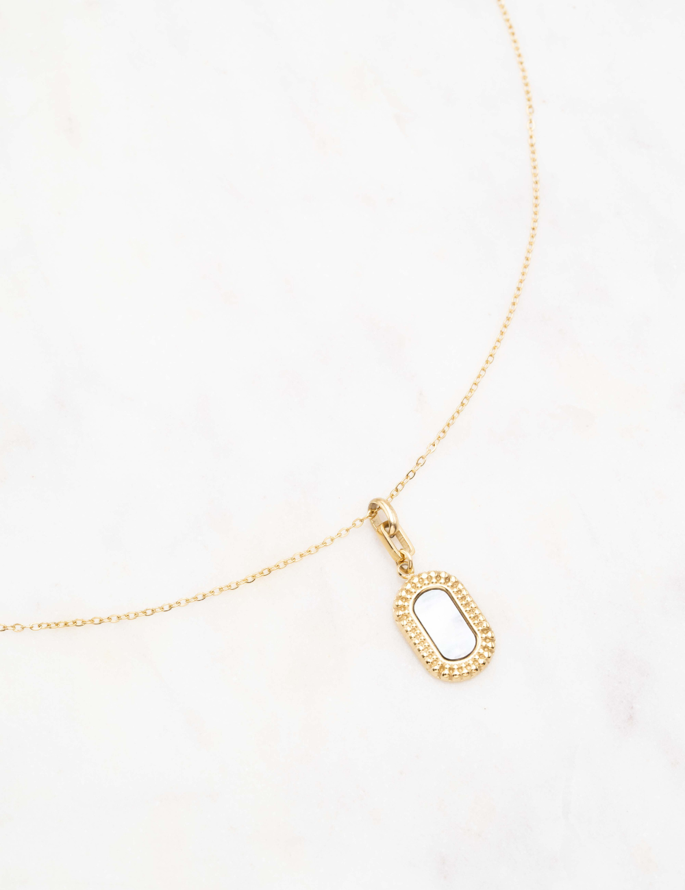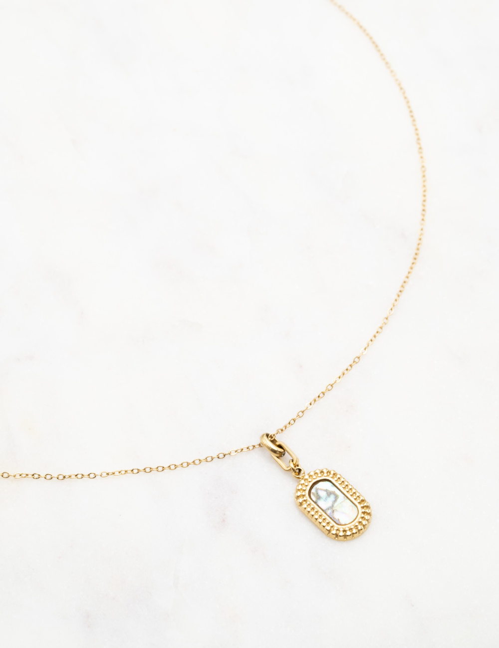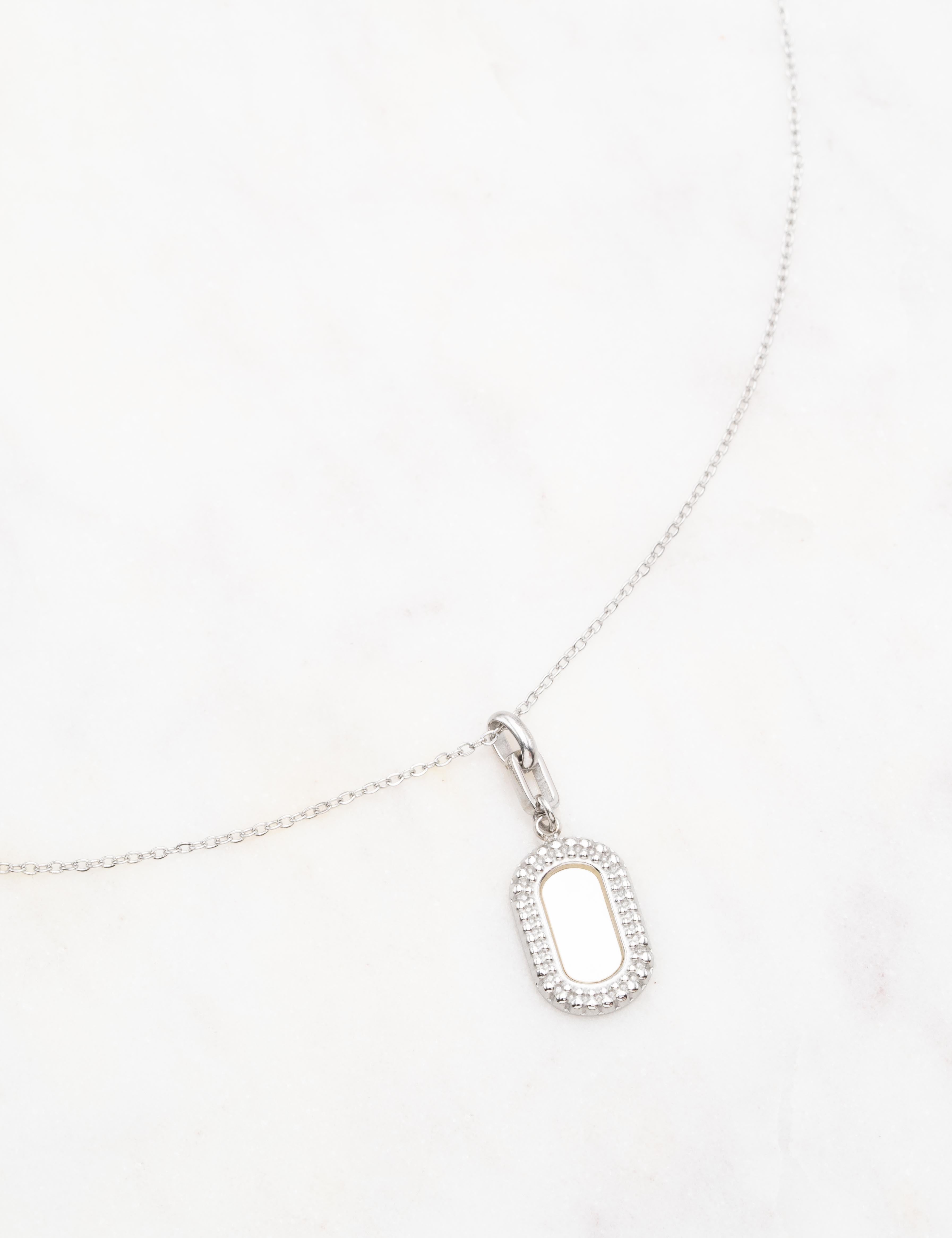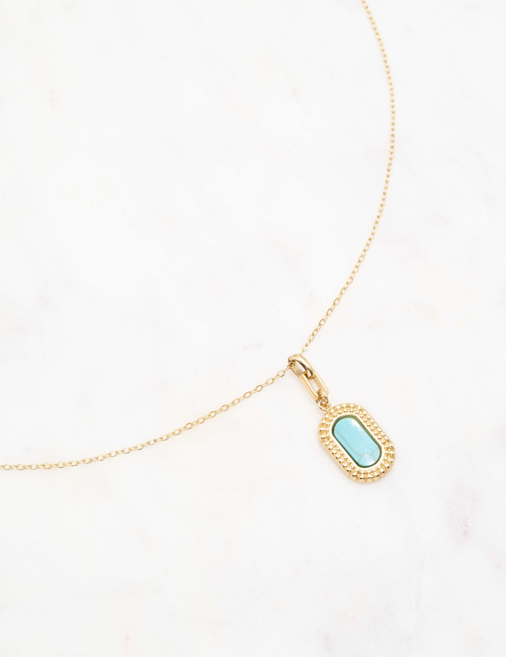 Collier réglable sur chaîne composé d'un anneau rectangulaire et d'un pendentif rectangulaire sertie d'une pierre naturelle.