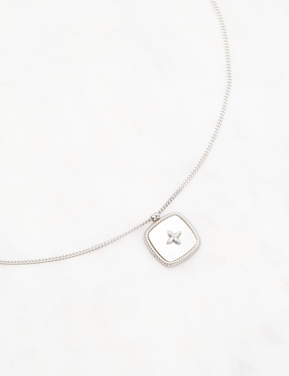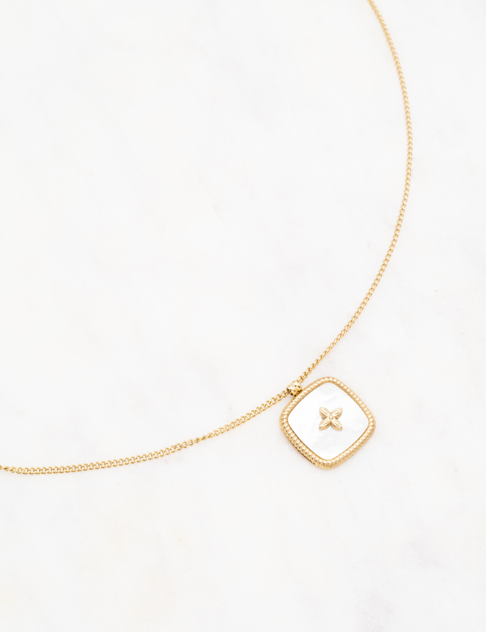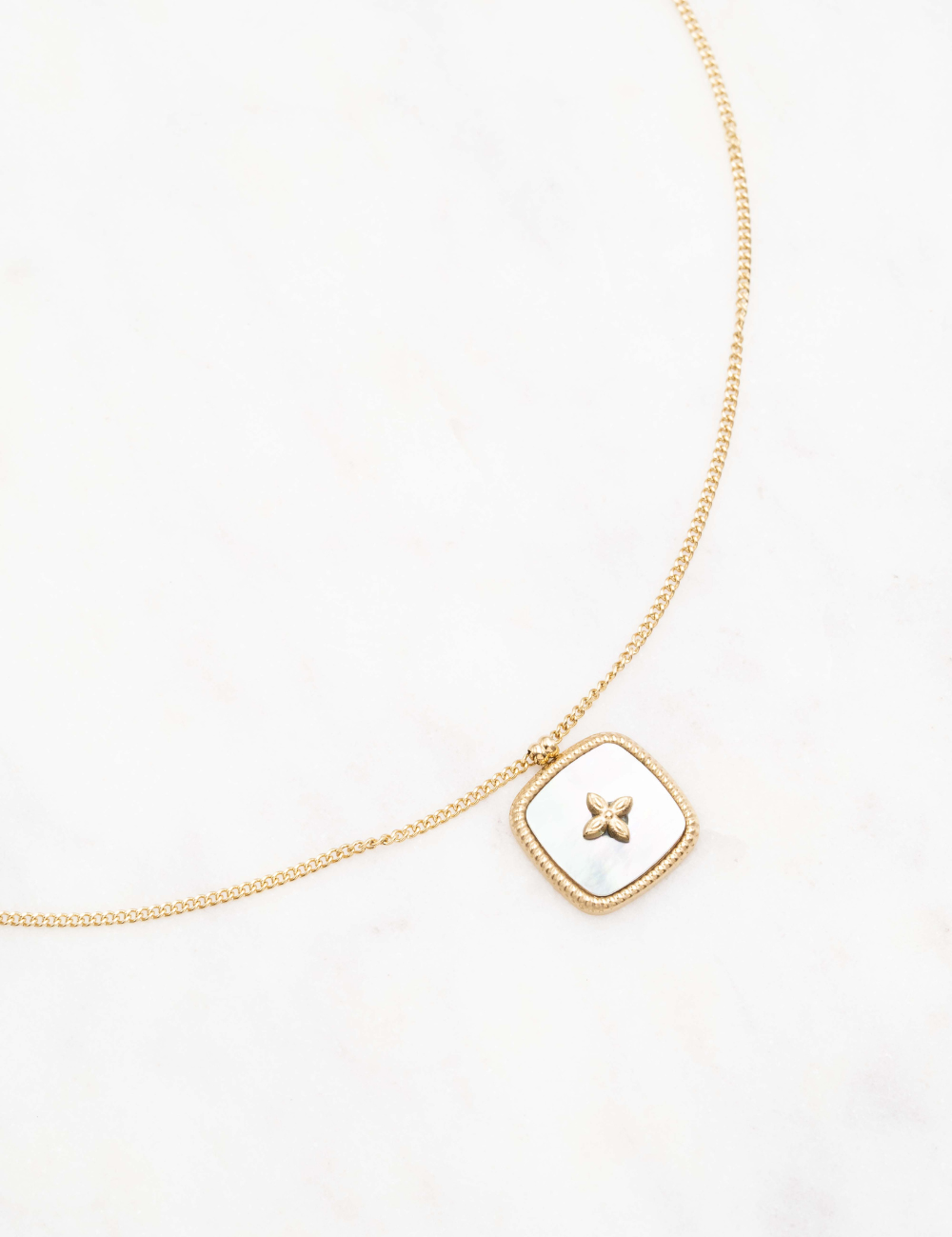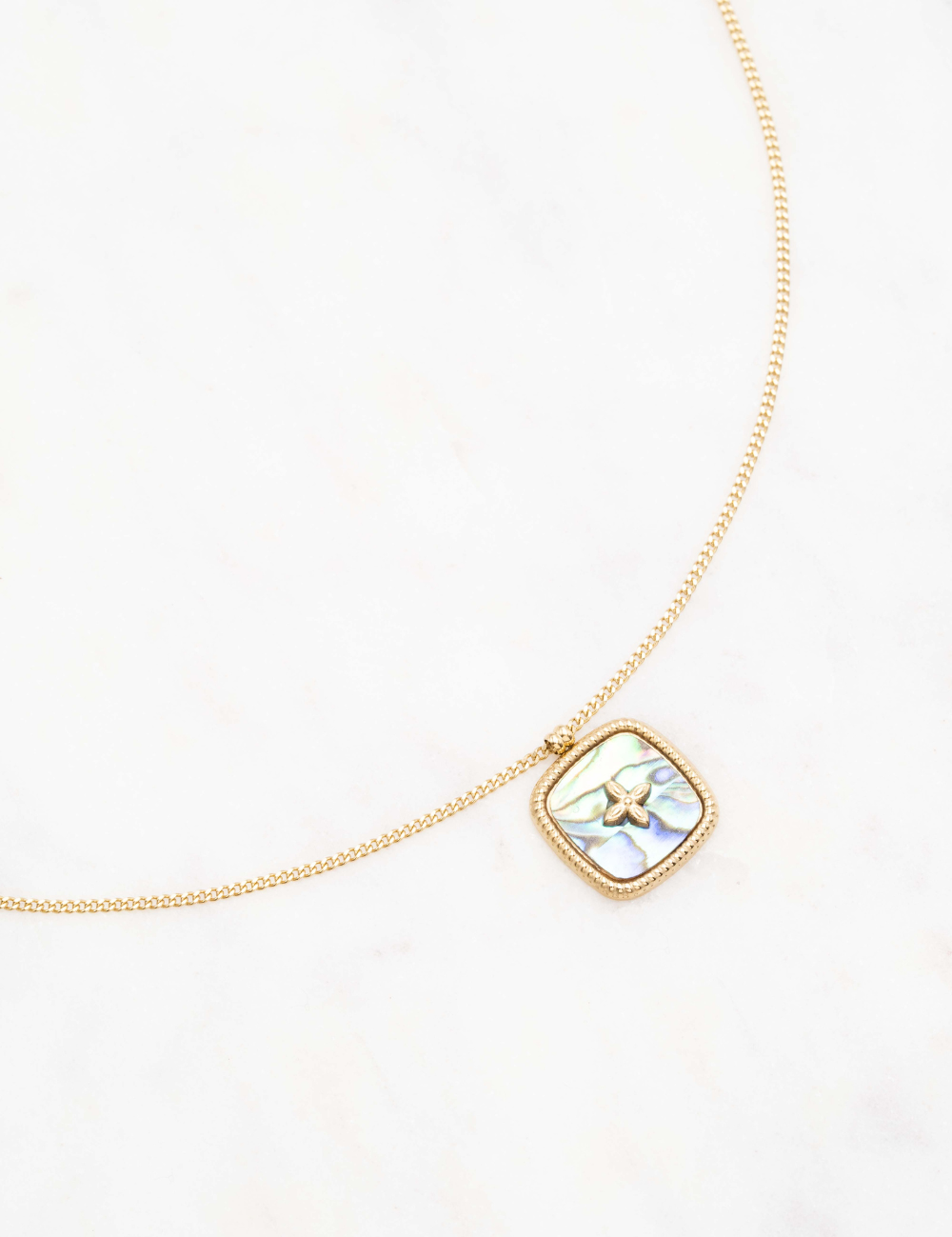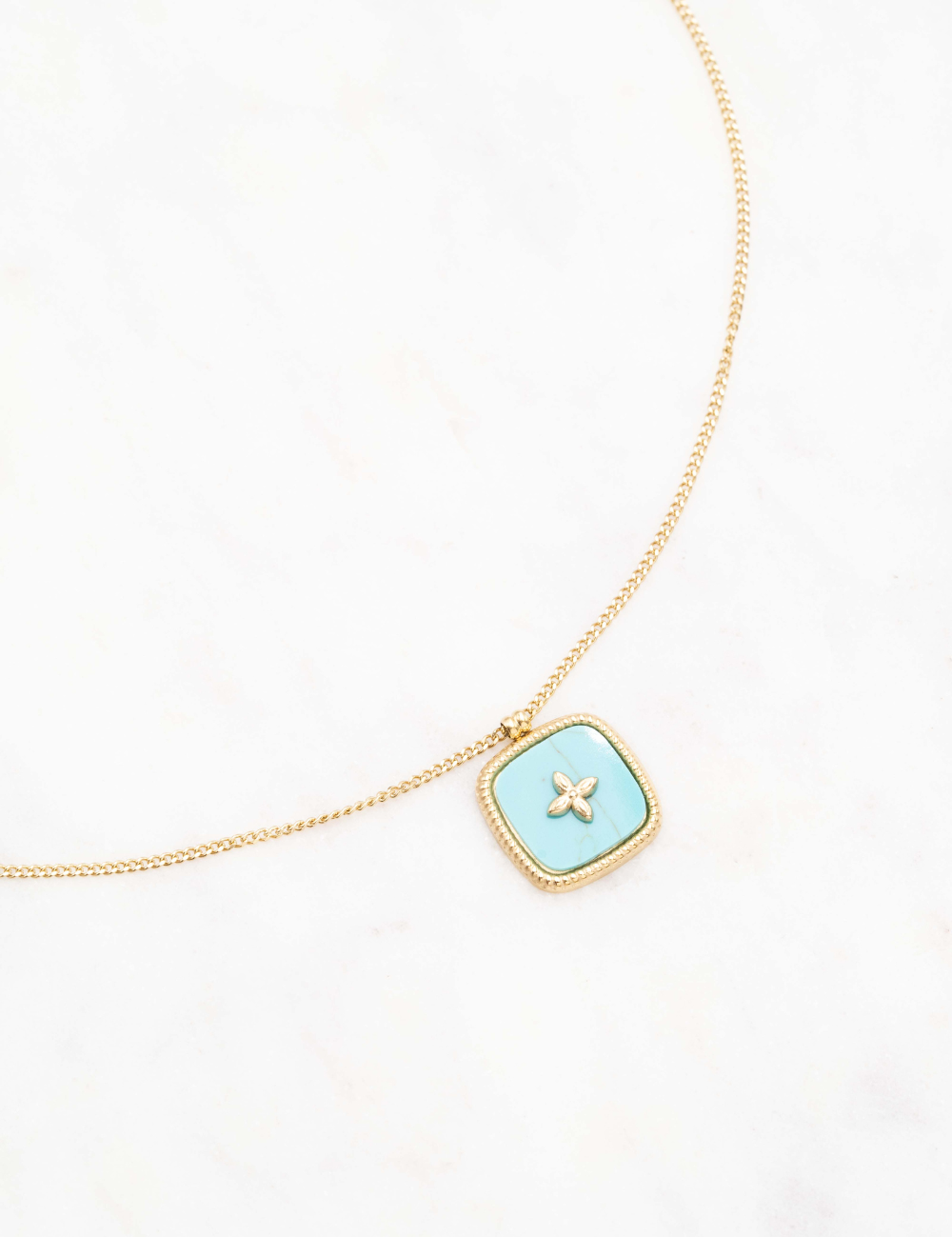 Collier réglable sur chaîne avec une pampille carrée sertie d'une pierre naturelle et ornée d'une pièce graphique au centre.