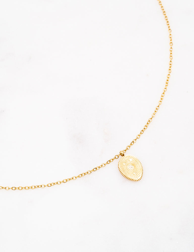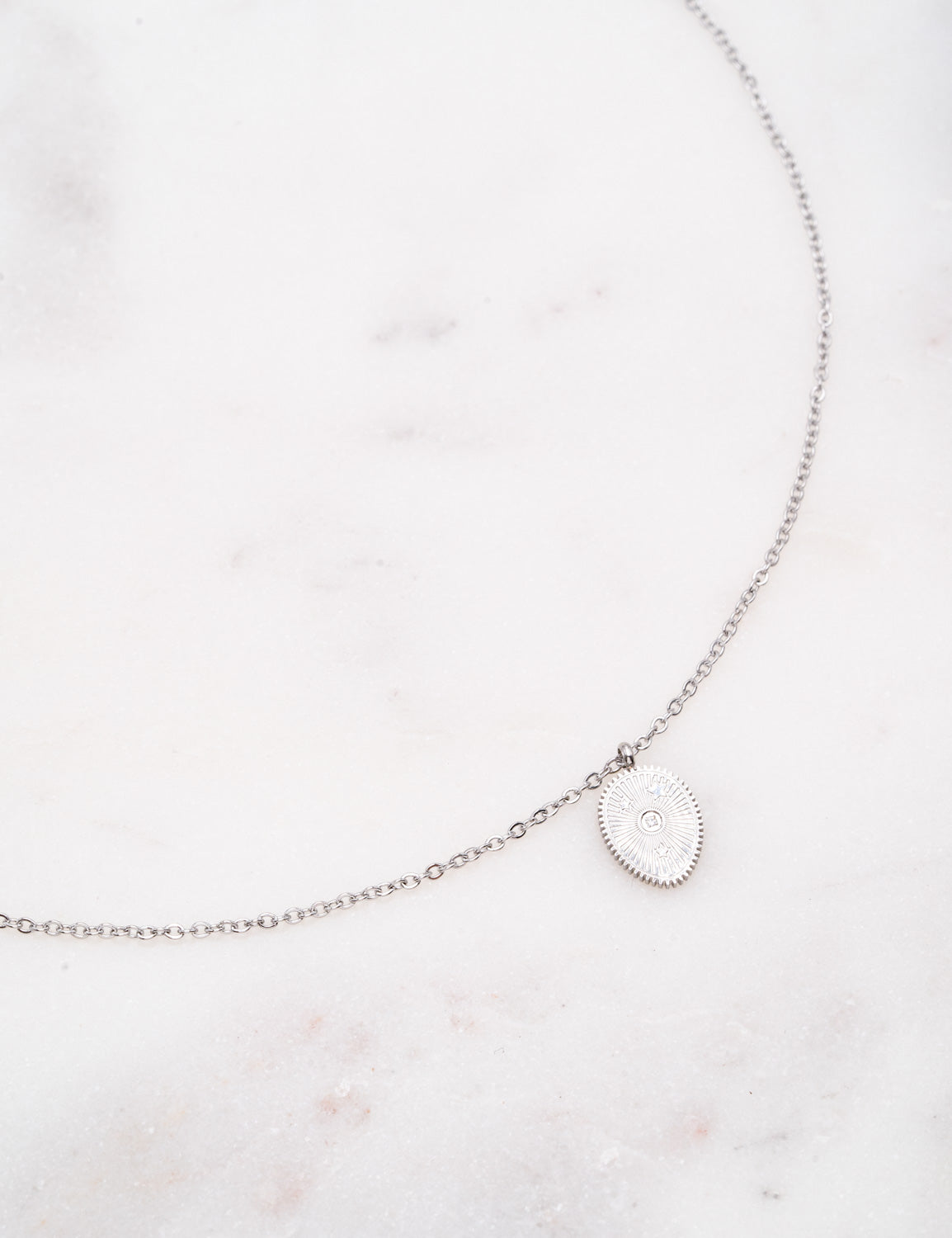 Collier réglable sur chaine composé d'un médaillon graphique texturé avec des motifs étoilés serti d'un strass (oxyde de zirconium). Fermoir mousqueton et chaînette de réglage.