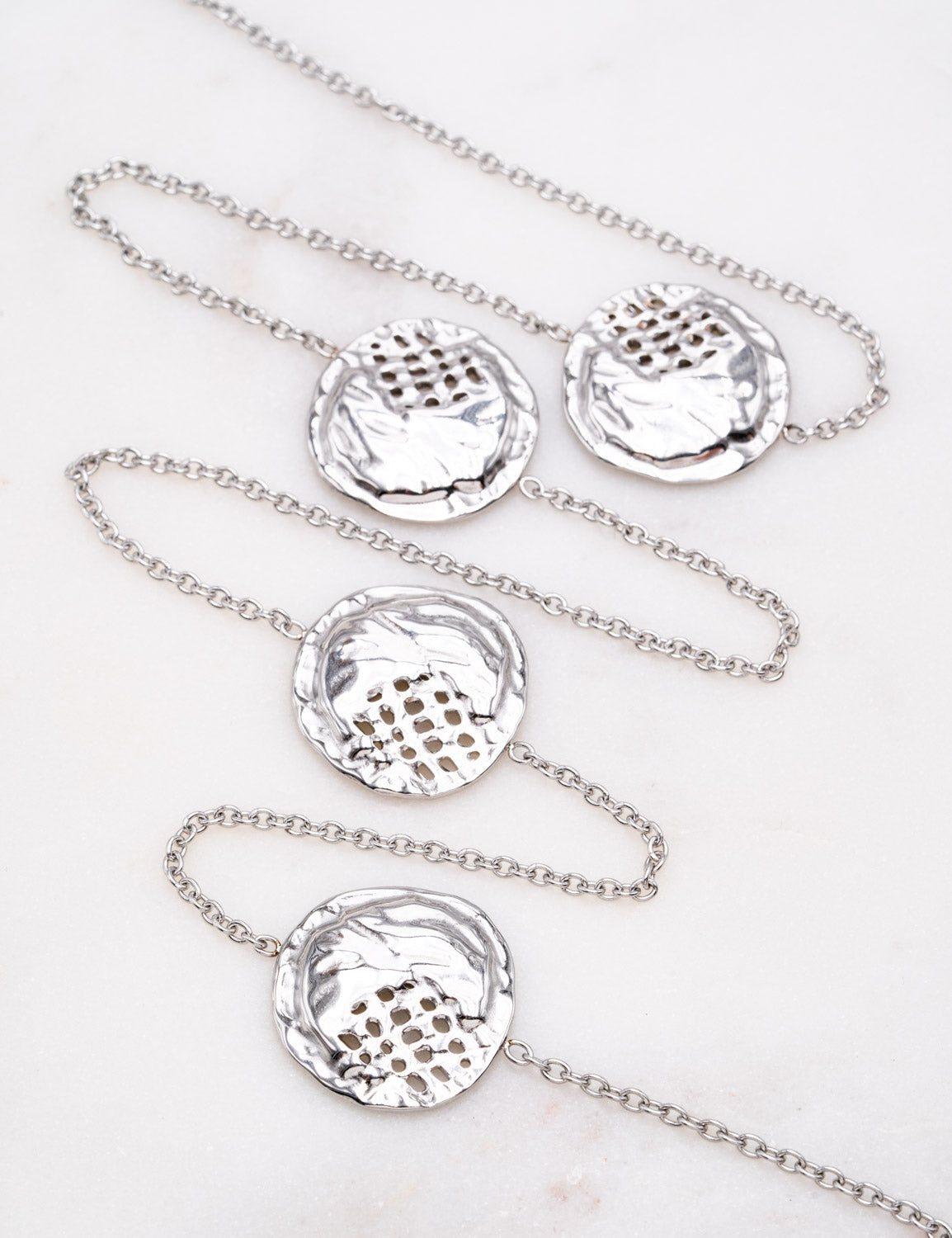 Collier type sautoir sur chaine avec un jeu de pièces graphiques texturées et ajourées. Fermoir mousqueton.
