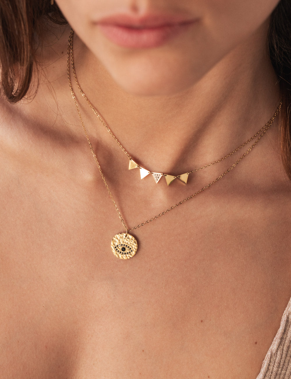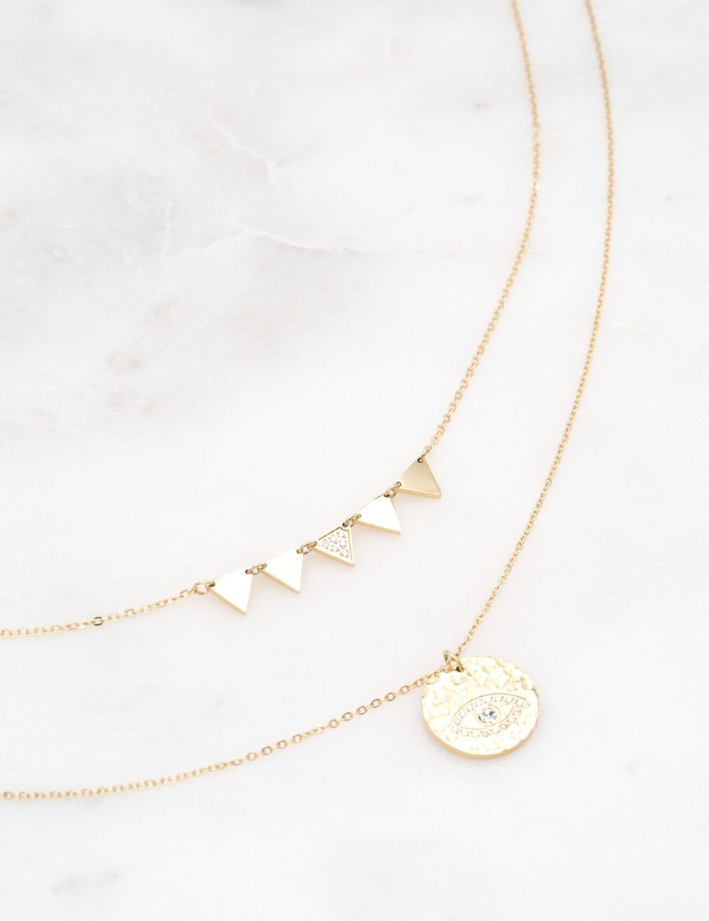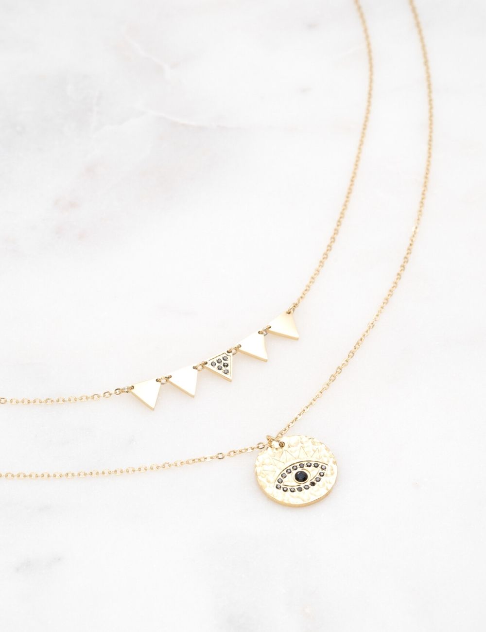 Collier sur chaine réglable 2 rangs parsemés de strass et d'un pendant au motif oeil bienveillant strassé (strass zirconium)
