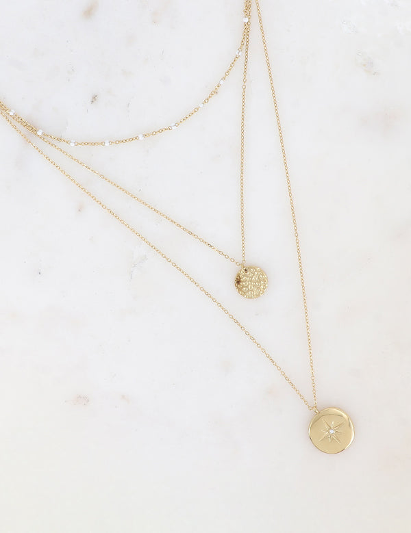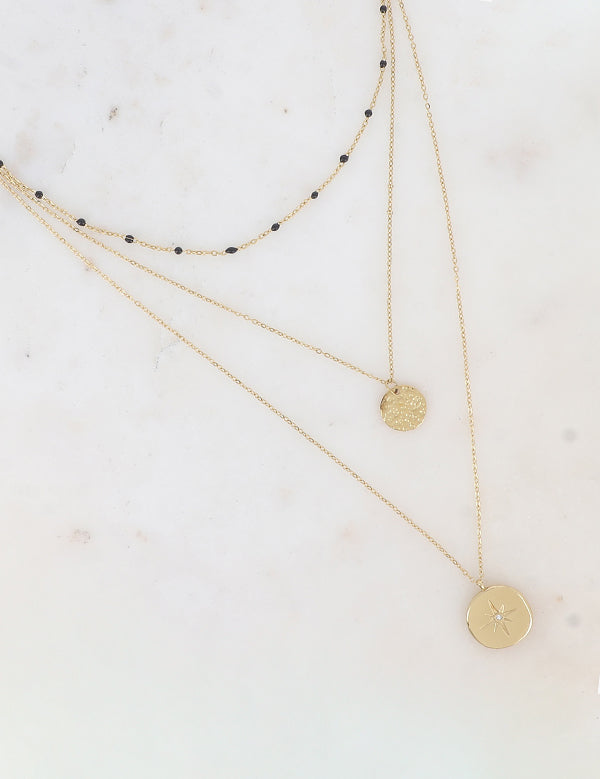 Collier réglable sur chaine 3 rangs composé  d'une chaine ornée de petites touches émaillées colorées, d'une pièce martelée et d'une pampille étoilée sertie d'un petit strass zirconium.