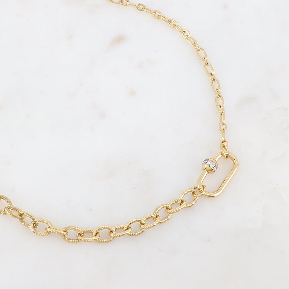 Collier sur chaine réglable à maillons avec pièce effet cadenas et strass.  (pièce non détachable).
