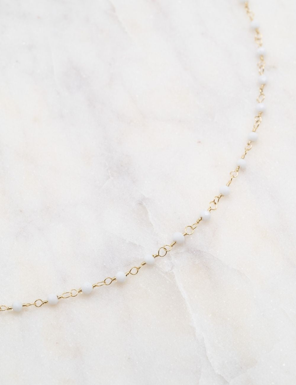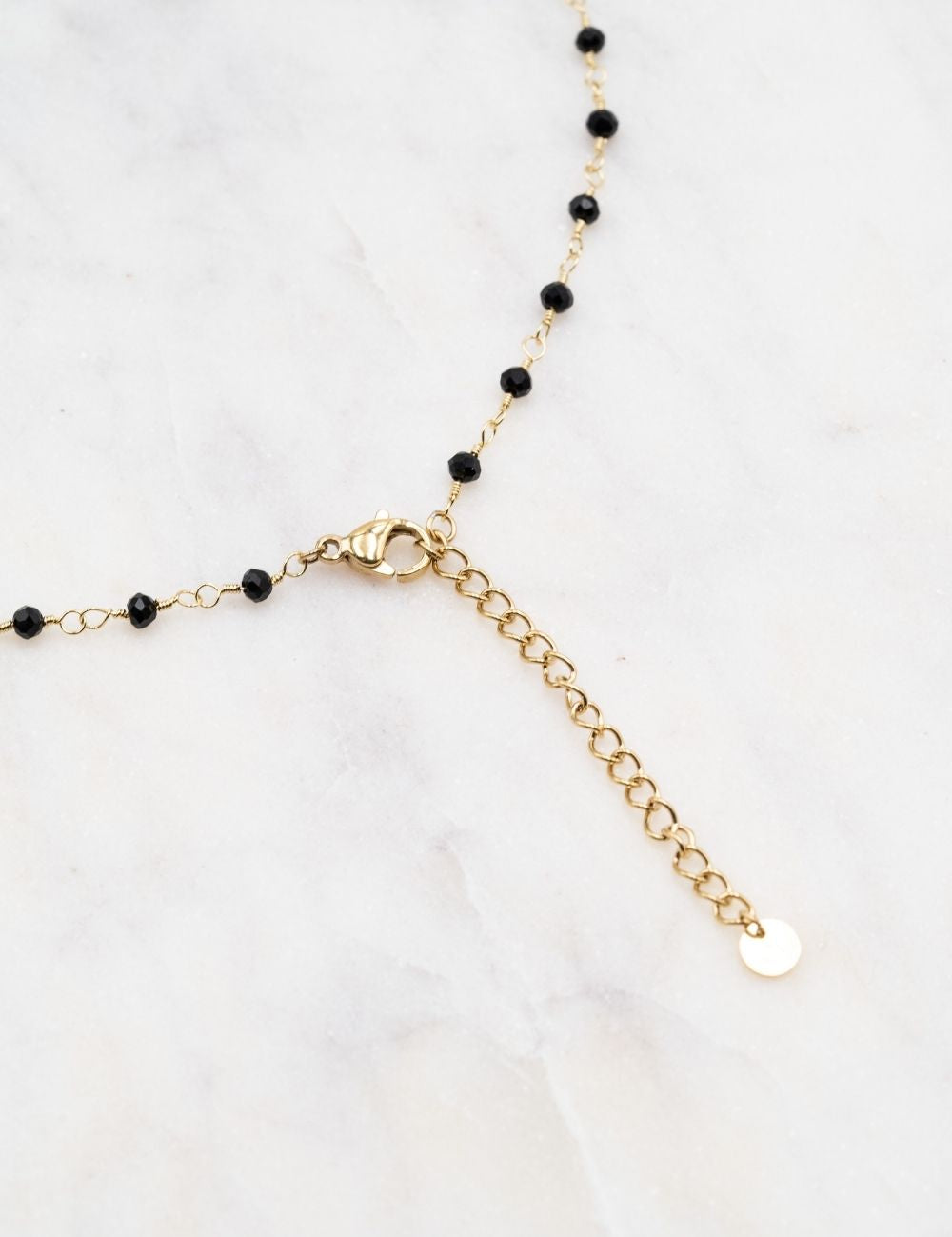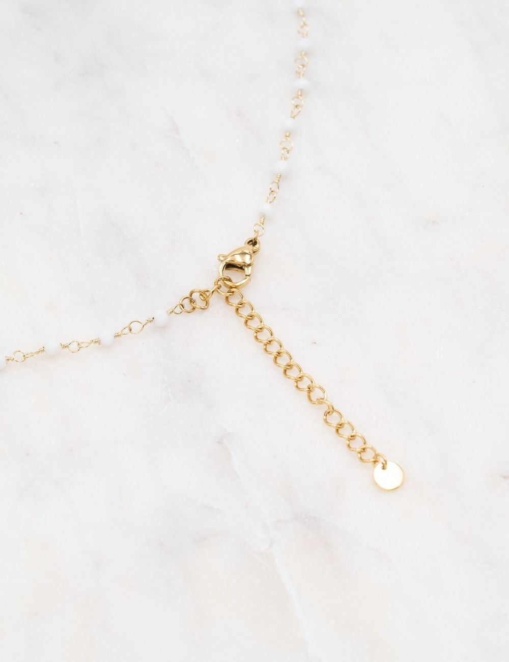 Collier sur chaîne avec fermoir mousqueton et chaînette réglable. Composé de multiples perles.