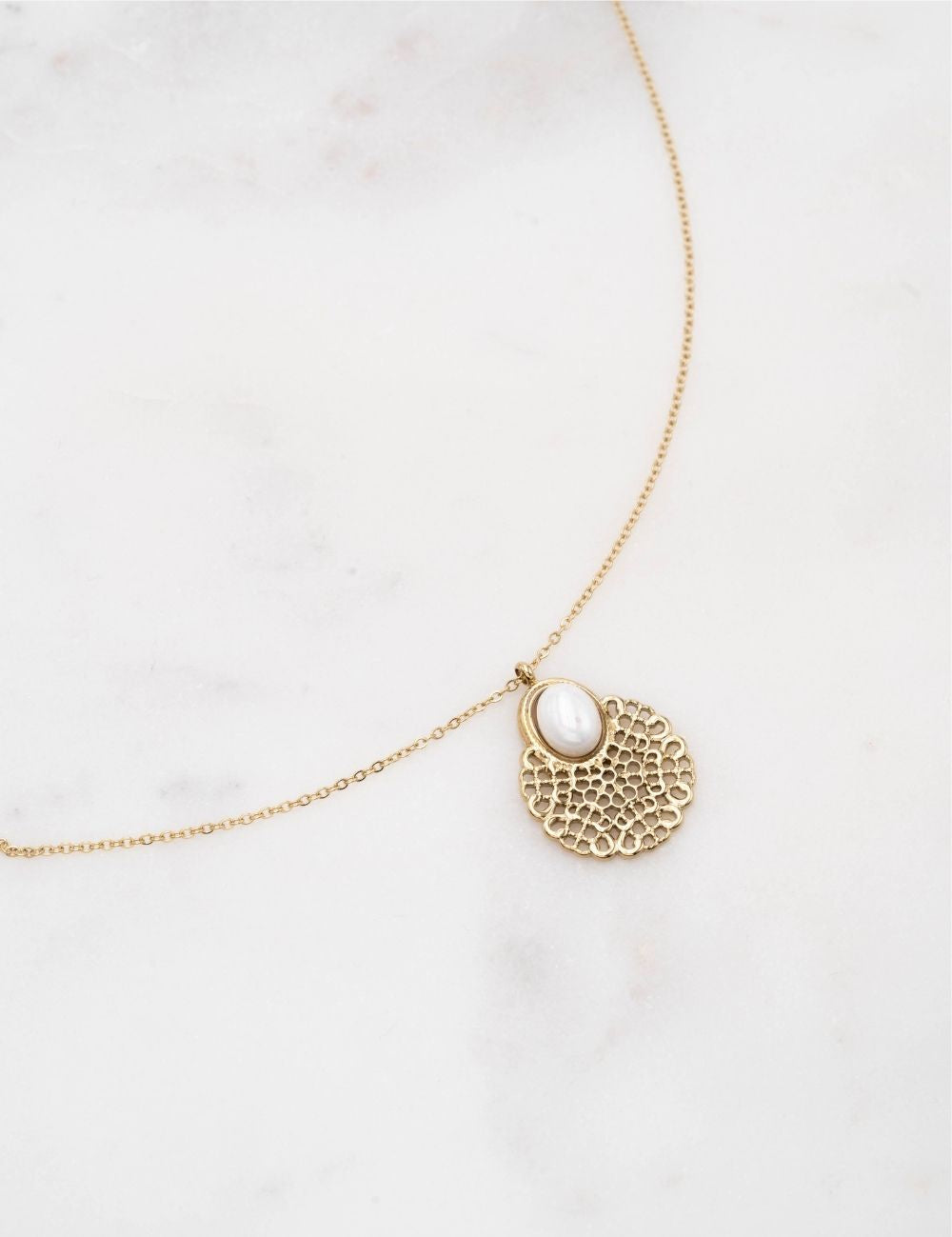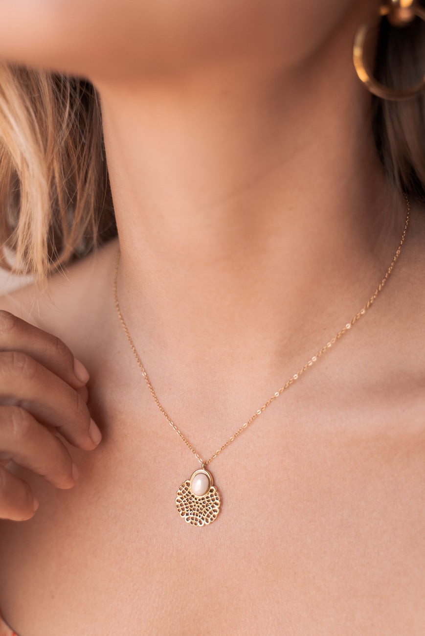 Collier réglable sur chaine composé d'un pendant ajouré , stylisé et serti d'une nacre. Fermoir mousqueton et chainette de réglage.
