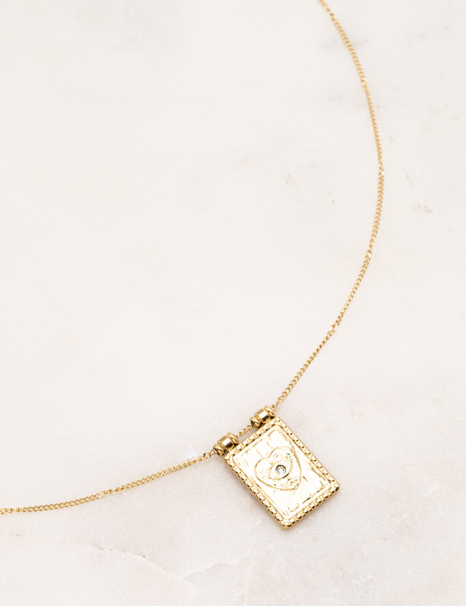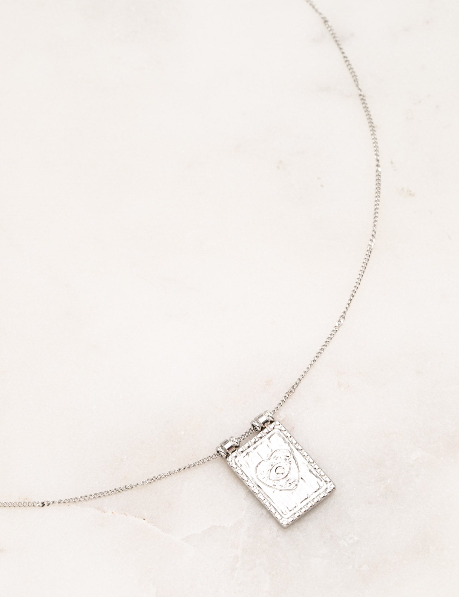Collier sur chaine composé d'une pièce rectangulaire avec un motif de coeur gravé et orné d'un strass (effet oeil bienveillant)