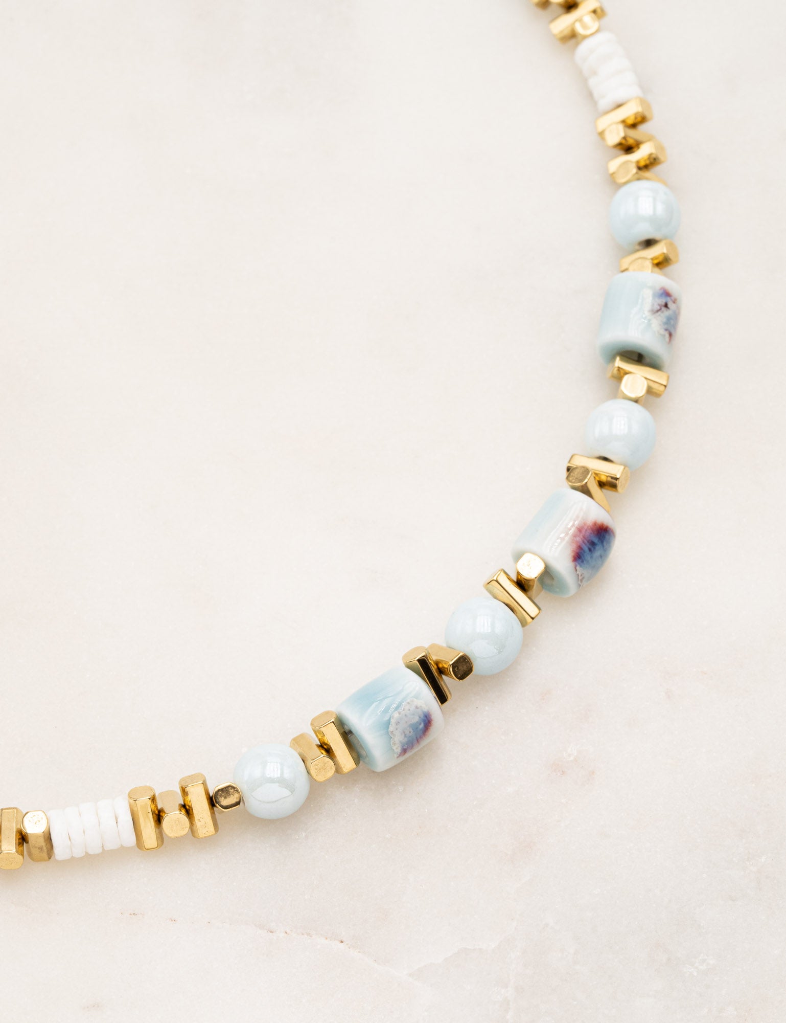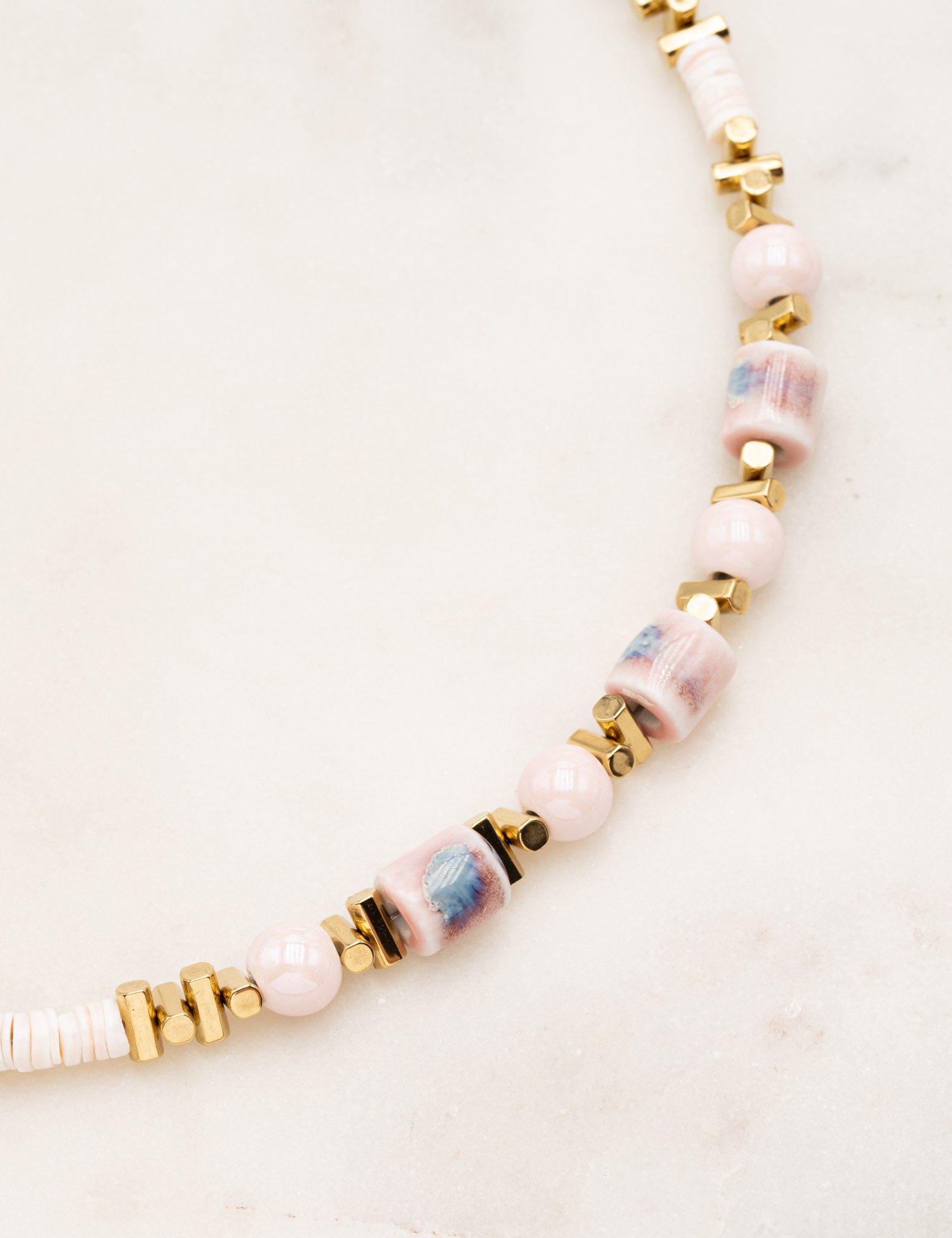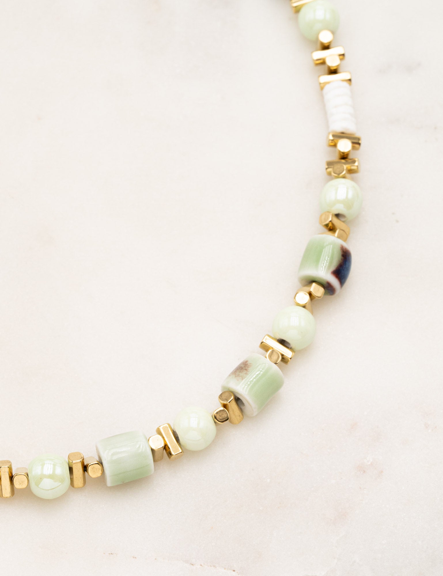 Collier réglable composé de perles en céramique émaillée colorée et de coquillages. Fermoir mousqueton et chaînette de réglable.