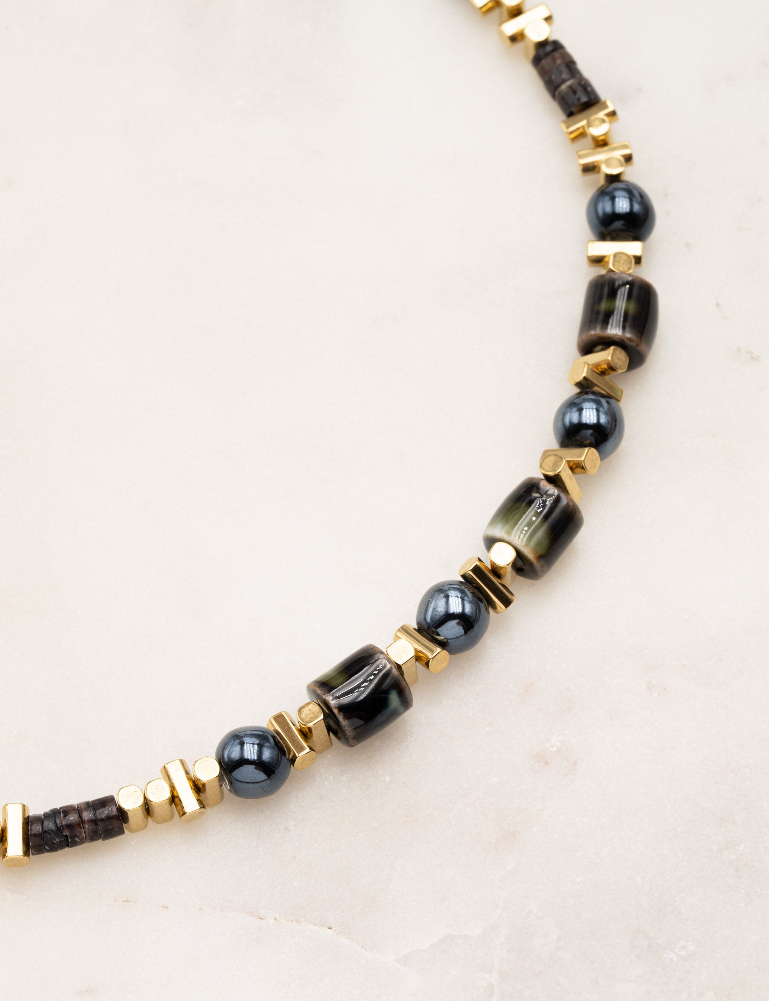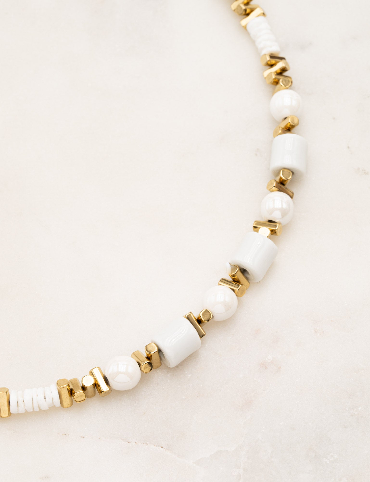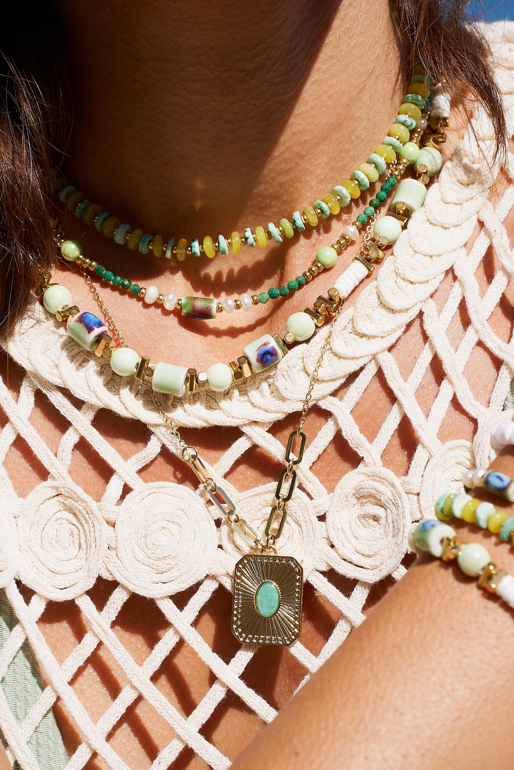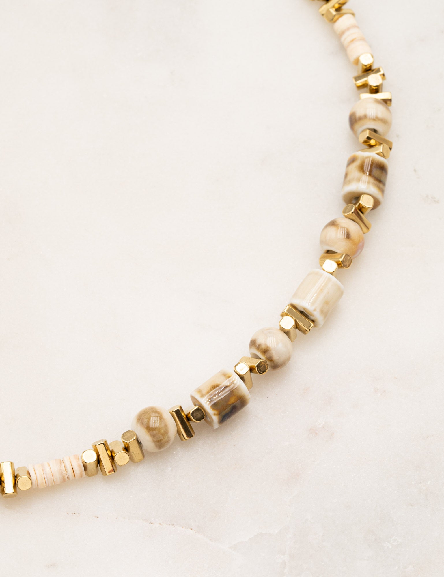 Collier réglable composé de perles en céramique émaillée colorée et de coquillages. Fermoir mousqueton et chaînette de réglable.