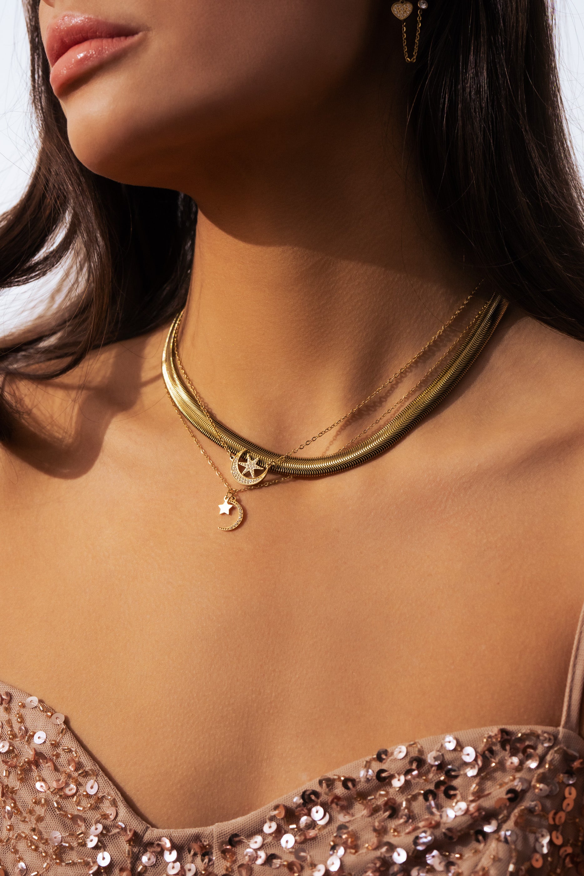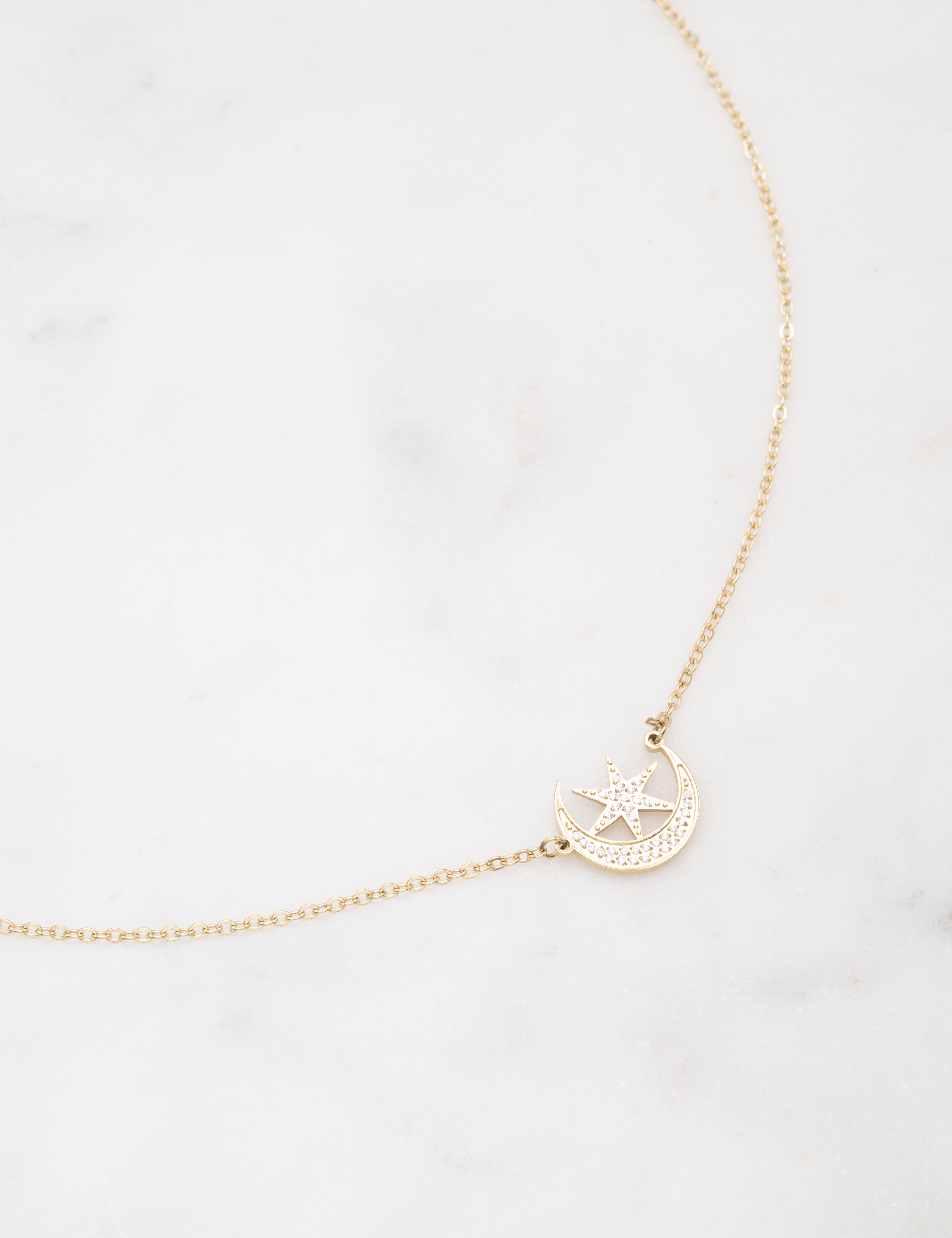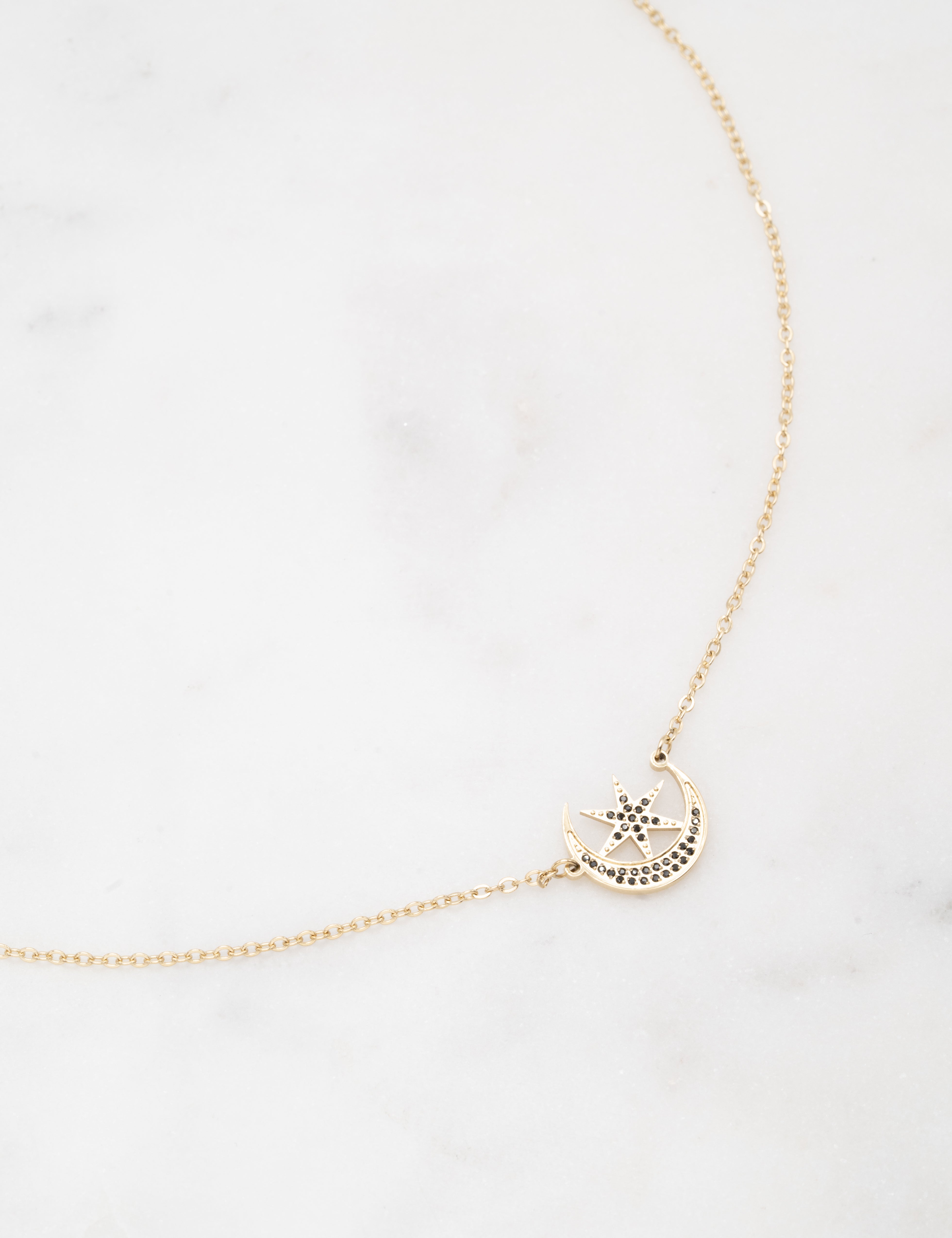 Collier sur chaine réglable composé d'un pendant au motif de lune et d'étoile sertis de strass zirconium et d'une pampille étoilée. Fermoir mousqueton et chainette de réglage.