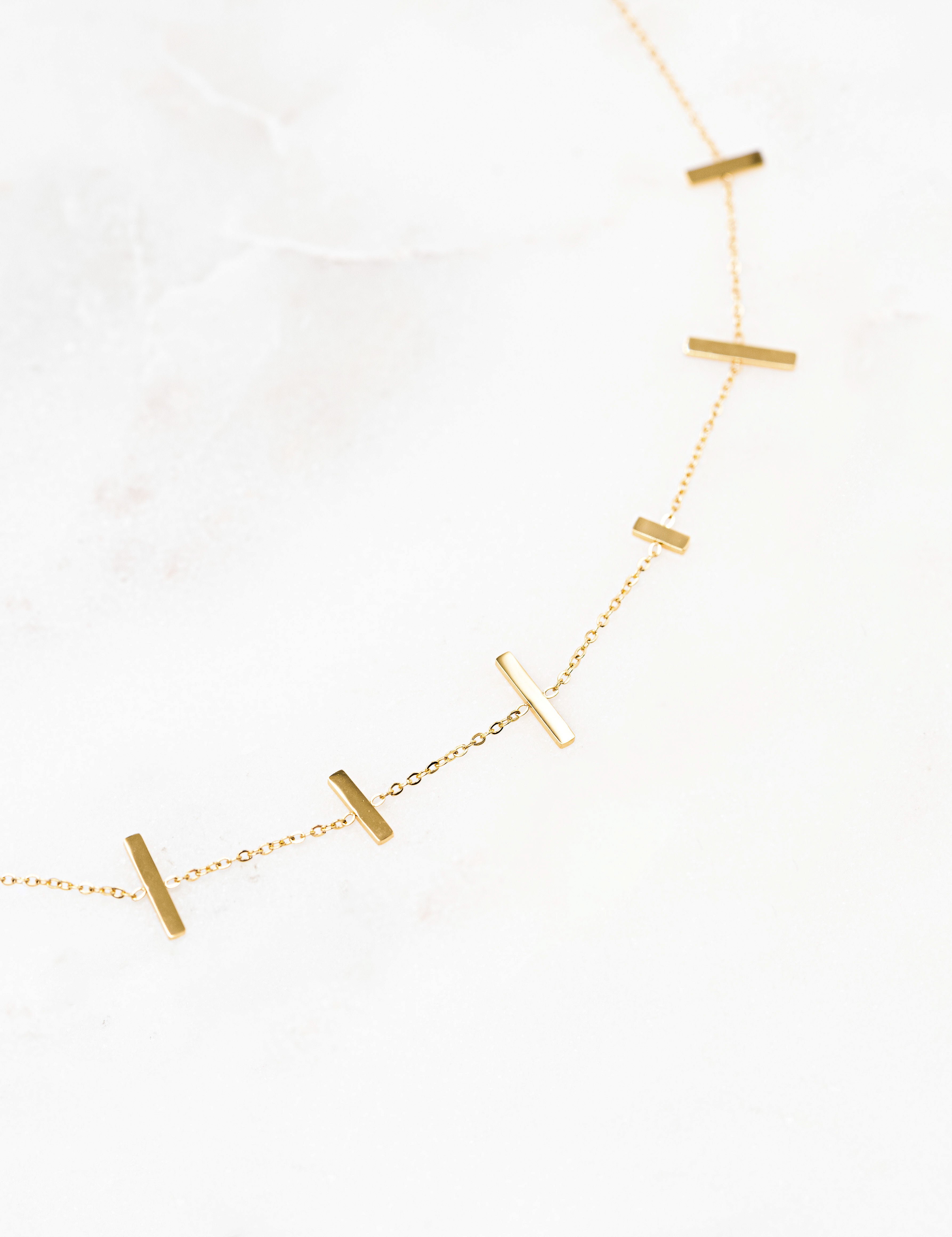 Collier sur chaine réglable graphique avec des petites barres. Fermoir mousqueton et chainette de réglage.