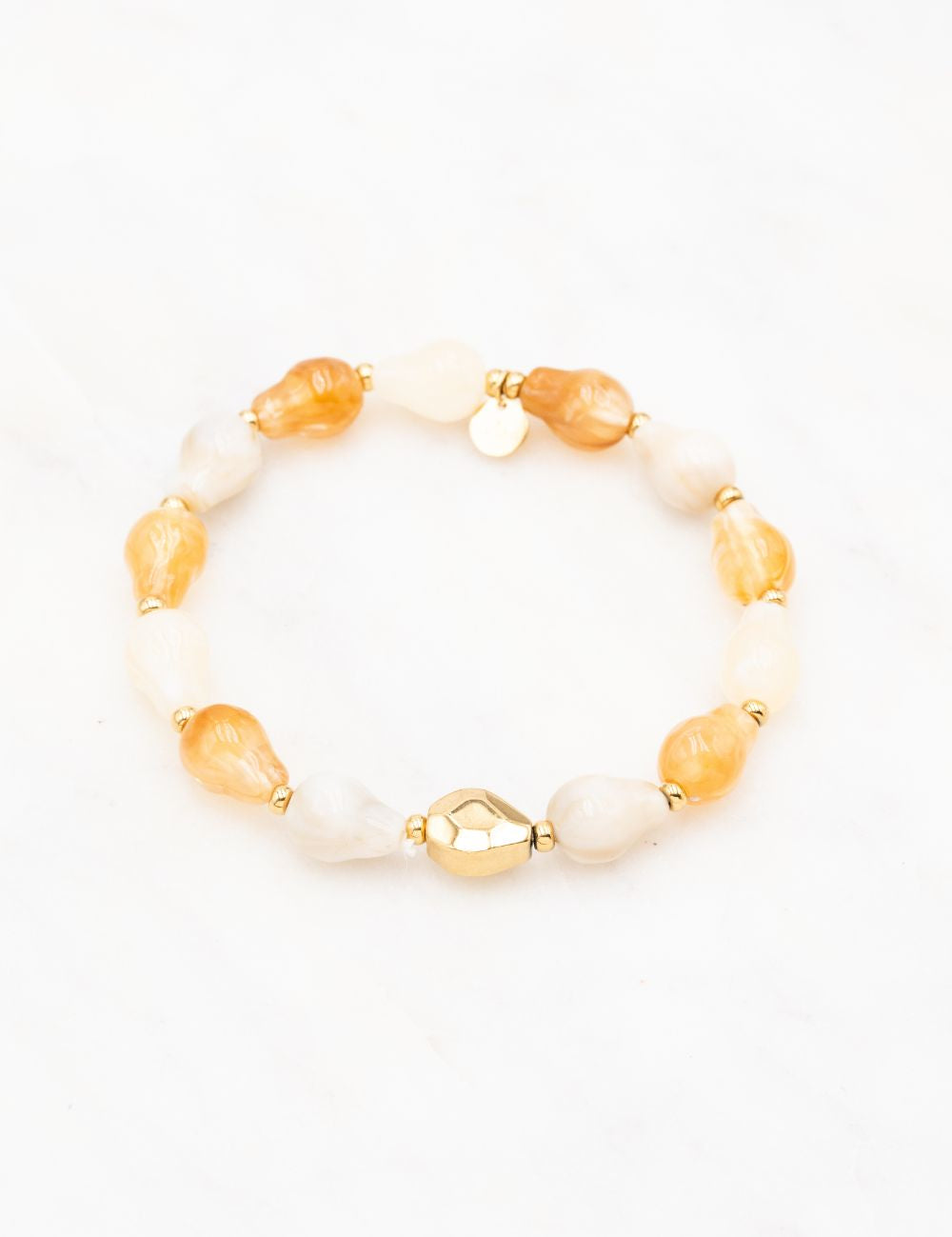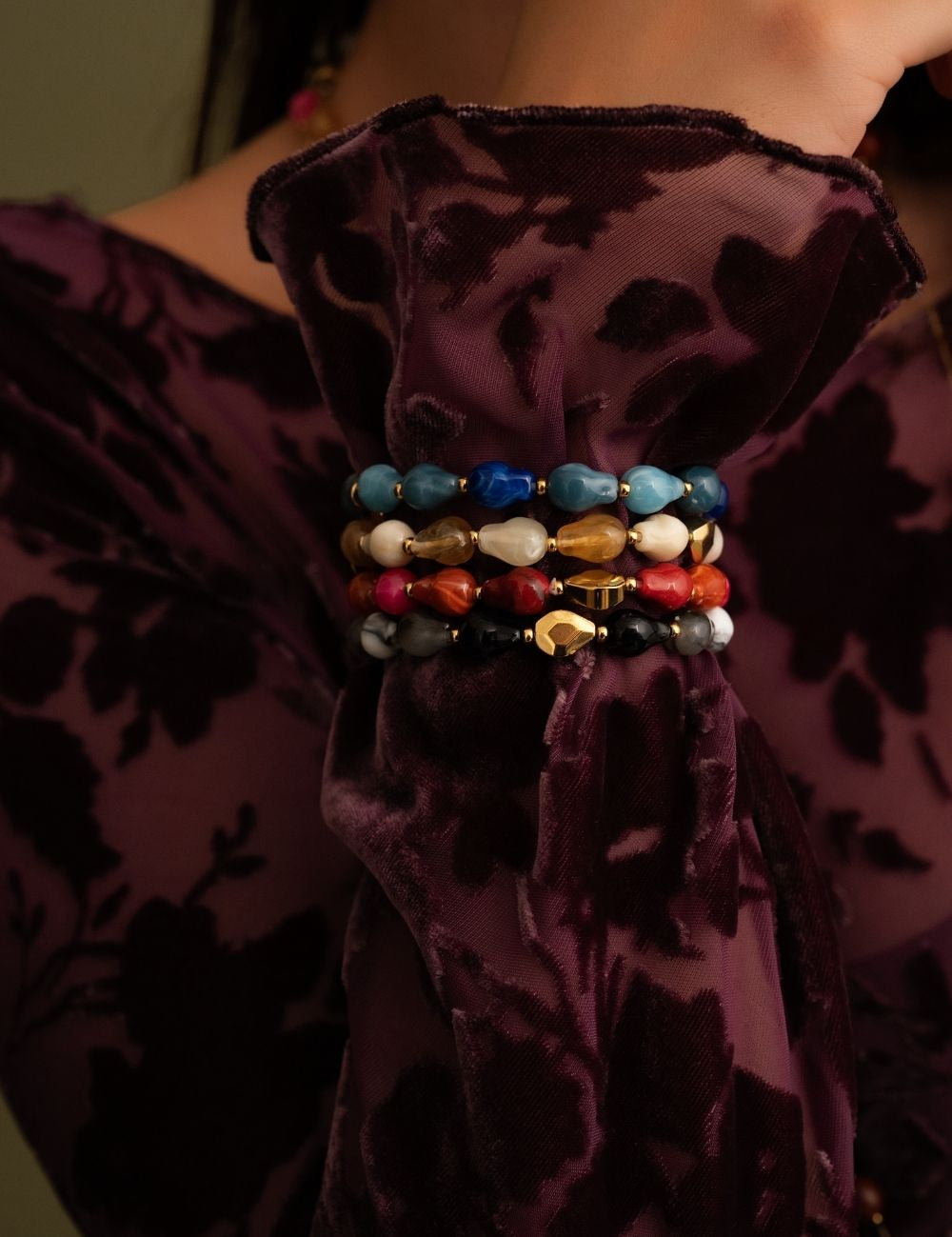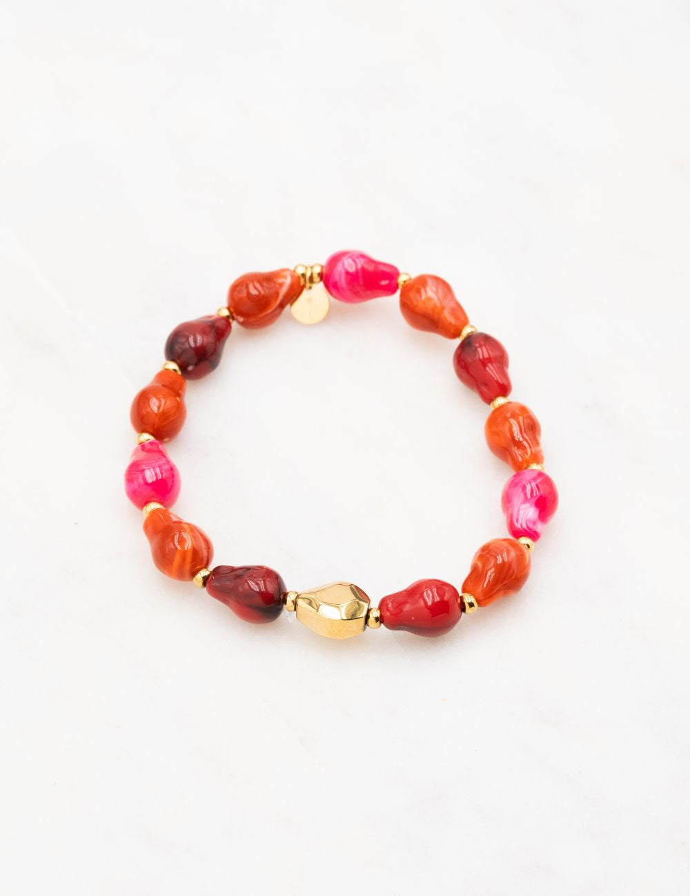 Bracelet élastique composé d'un joli enfilage de  perles en résine acétate colorée, de perles en bois et de perles en acier.