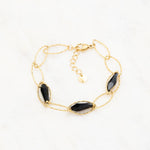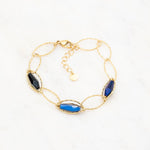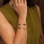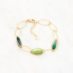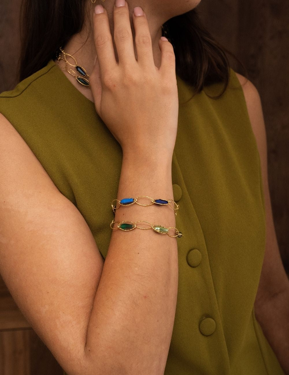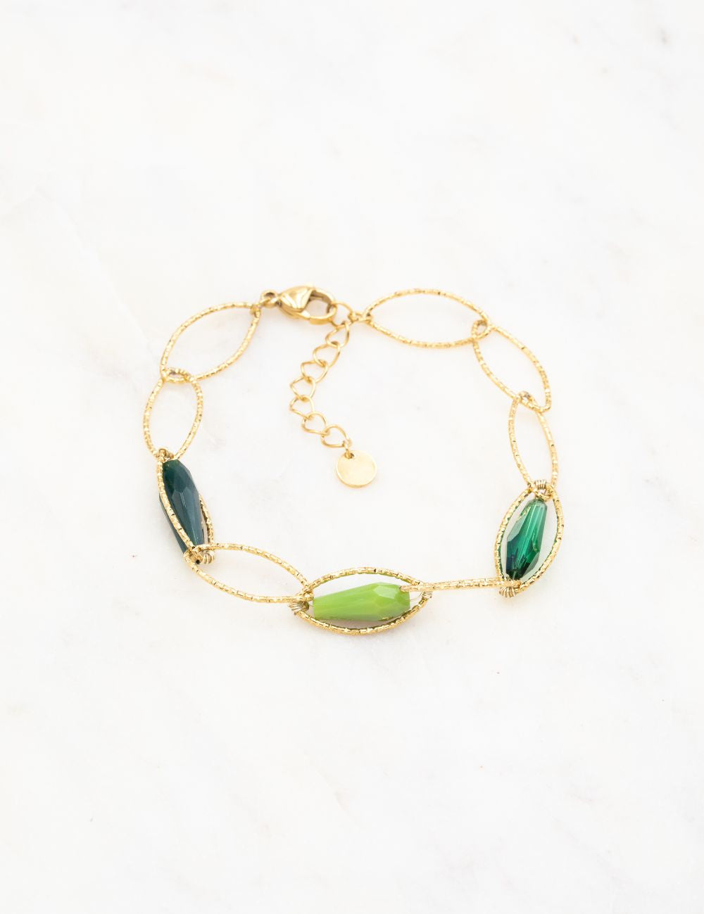 Bracelet réglable sur chaîne maille, de formes ovales texturés orné de perles en pâtes de verre colorées.