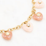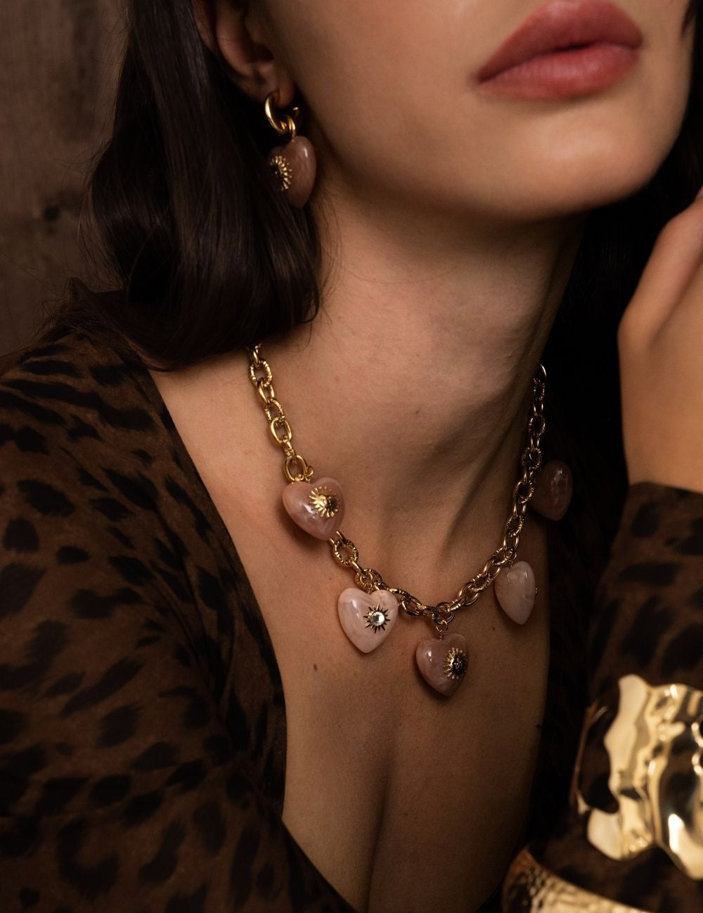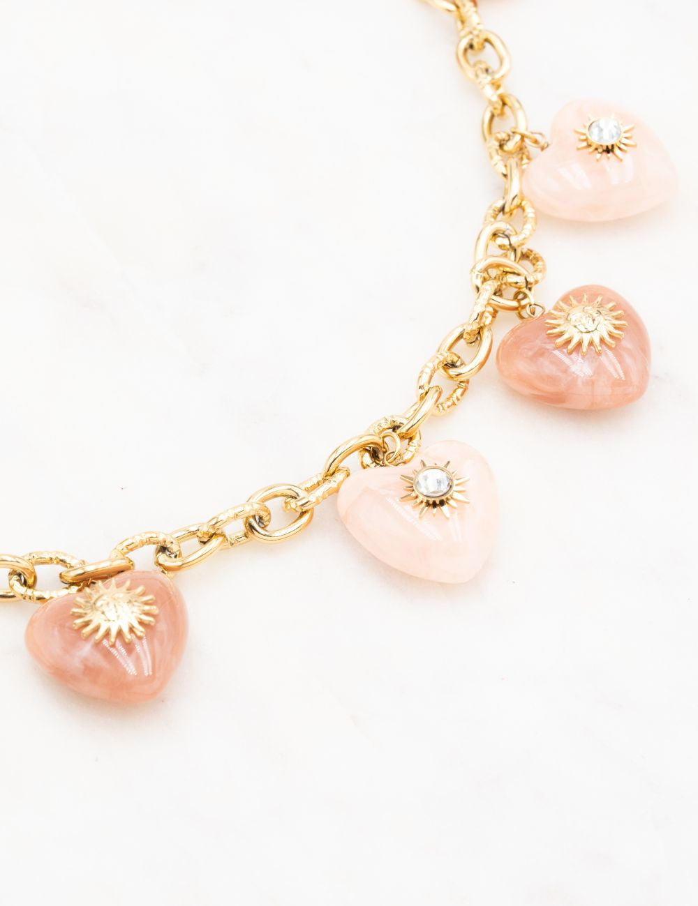 Collier en maille sur chaîne composé de plusieurs pendentifs en forme de coeur en résine colorée embellie d'une pièce soleil ou d'un strass.