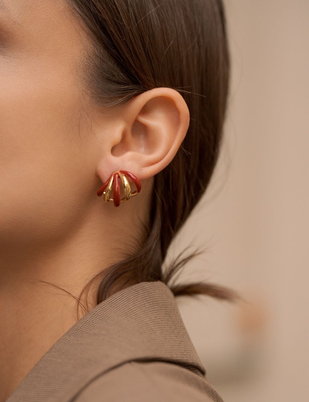 Boucles d'oreilles graphiques type créoles à puce composées de 5 rangs avec un jeu de matières (acier et émail coloré).