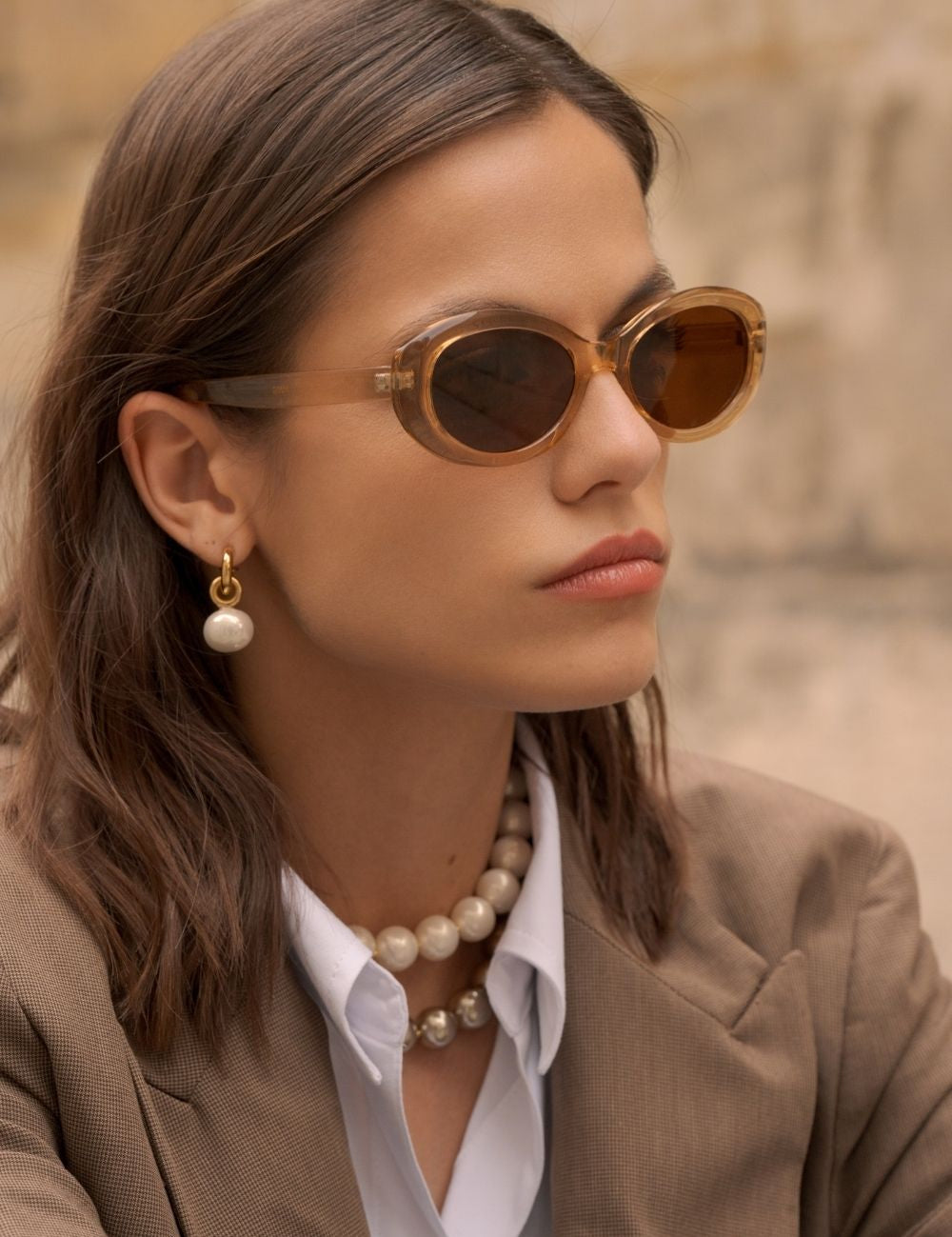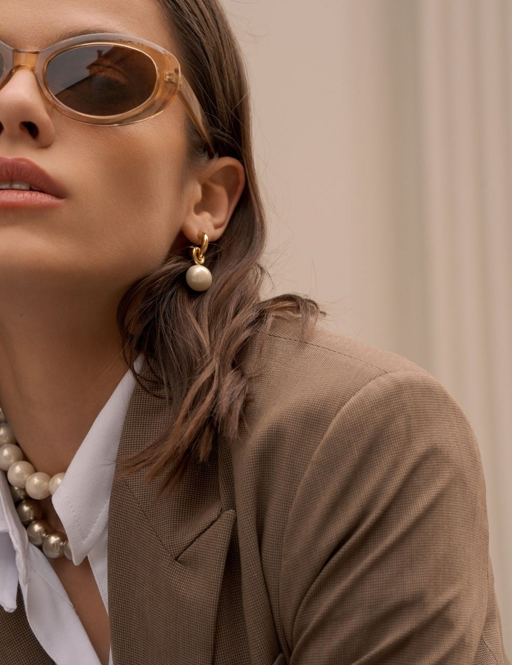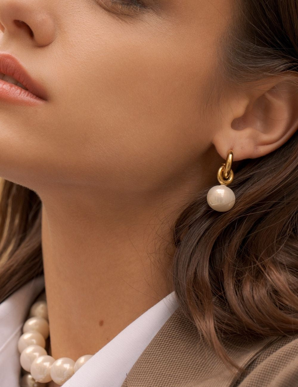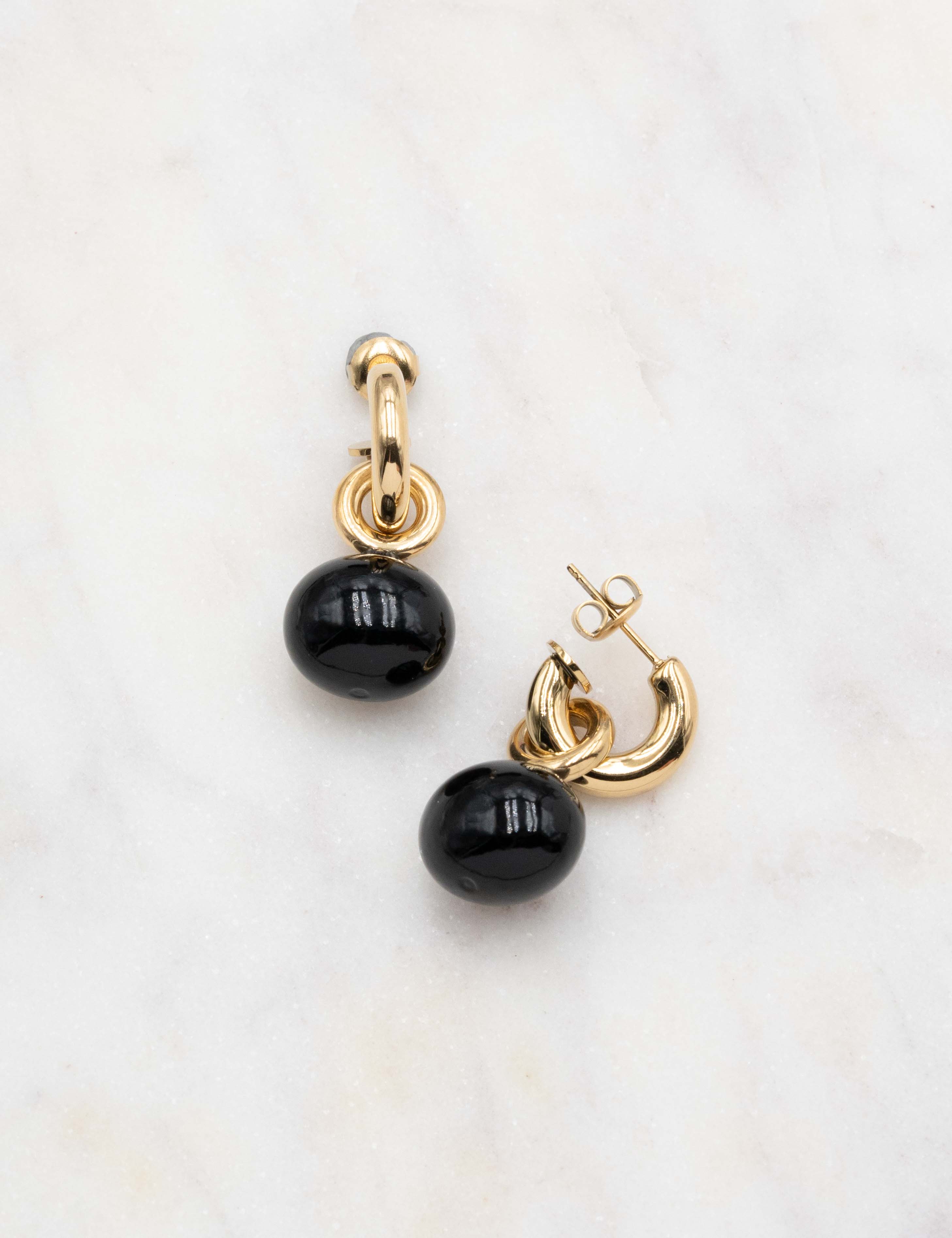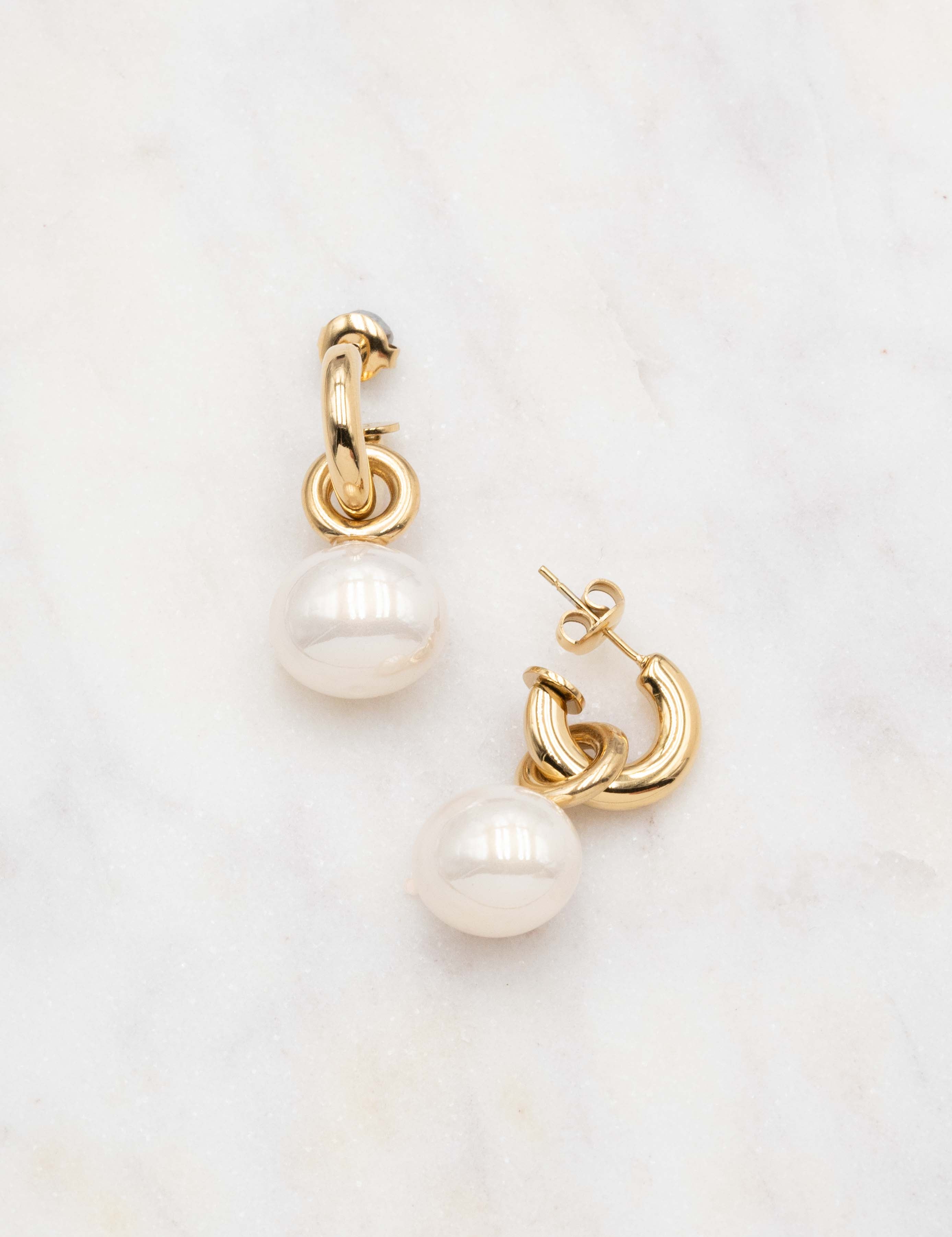 Boucles d'oreilles graphiques type créoles à puce composées d'une perle en verre nacrée.
