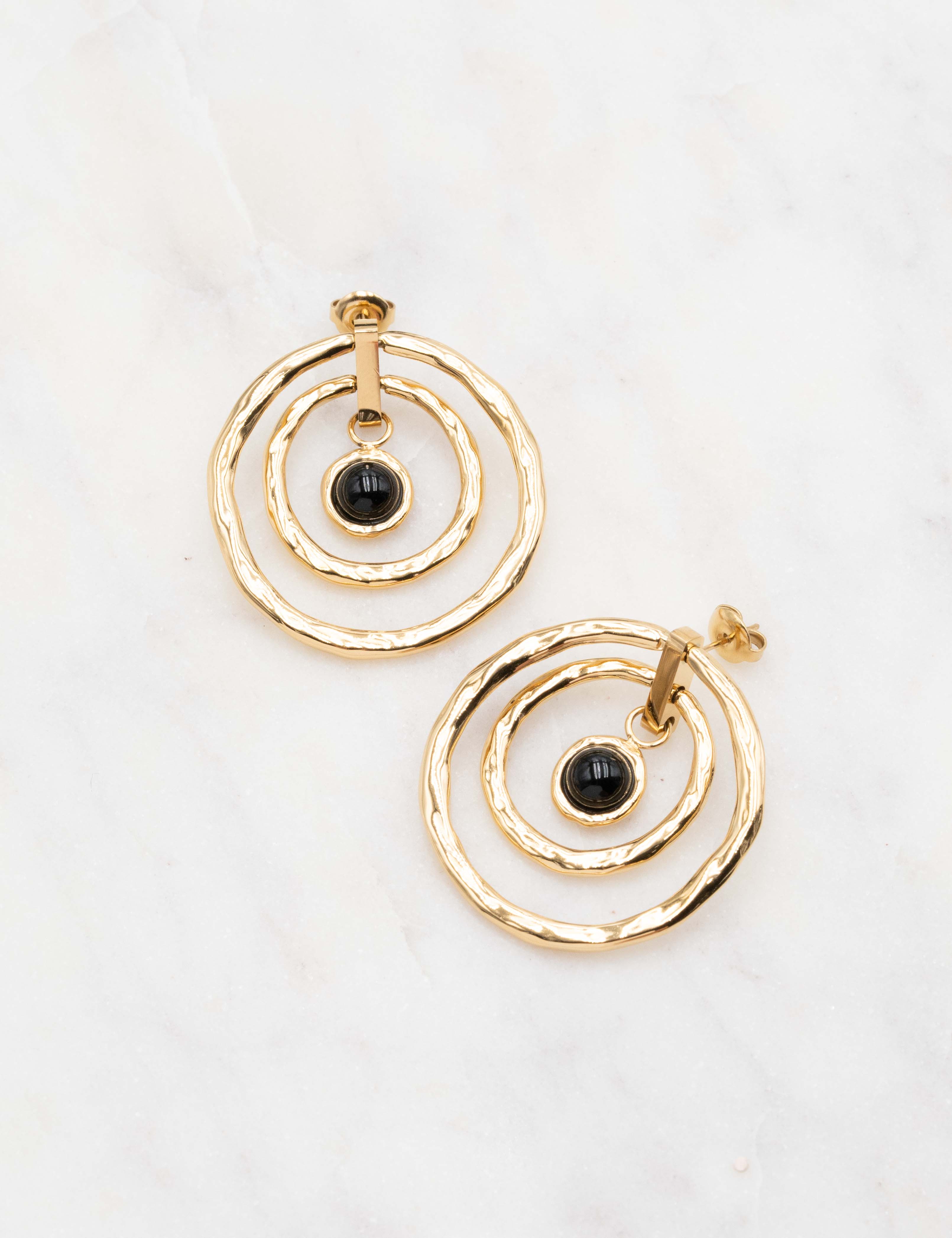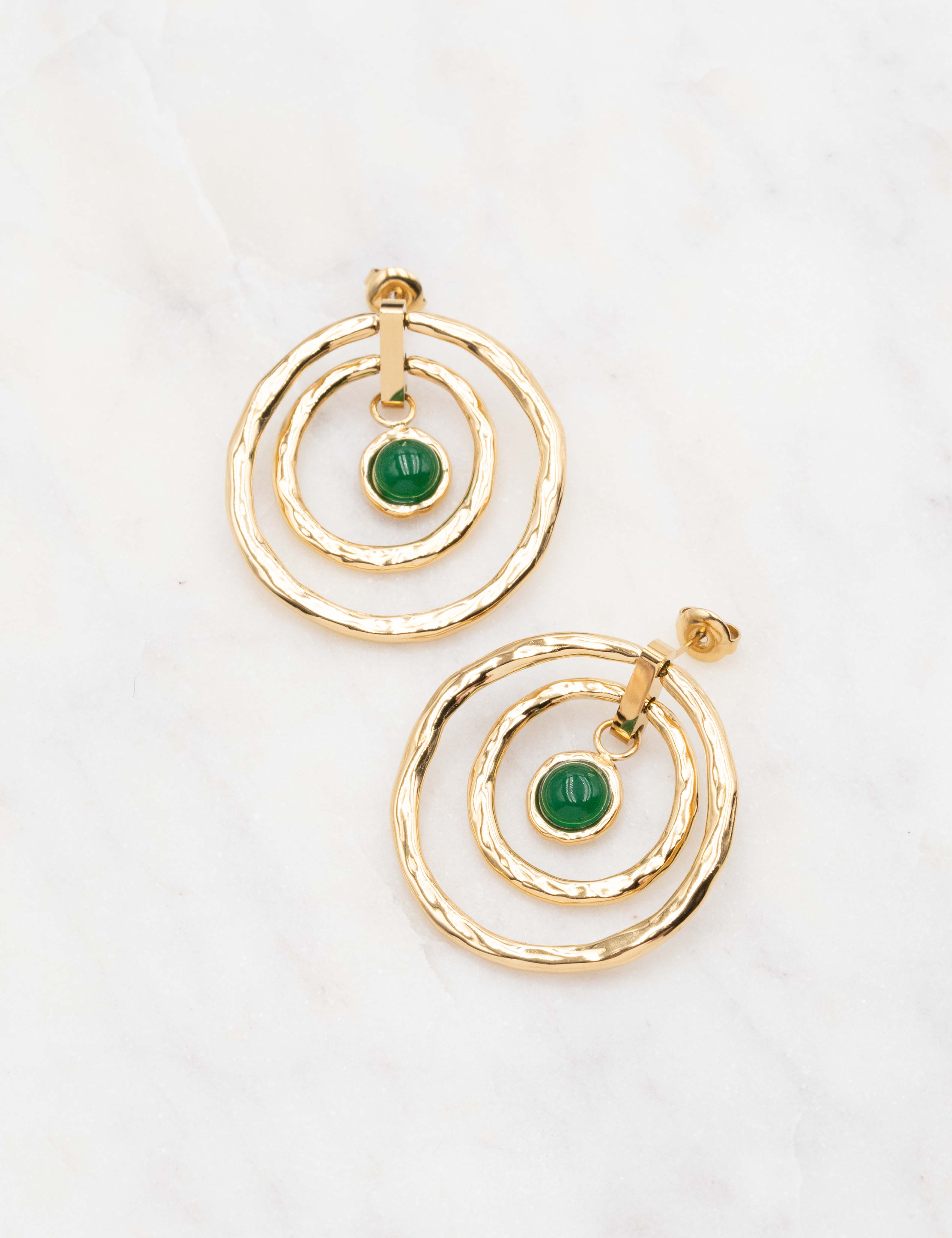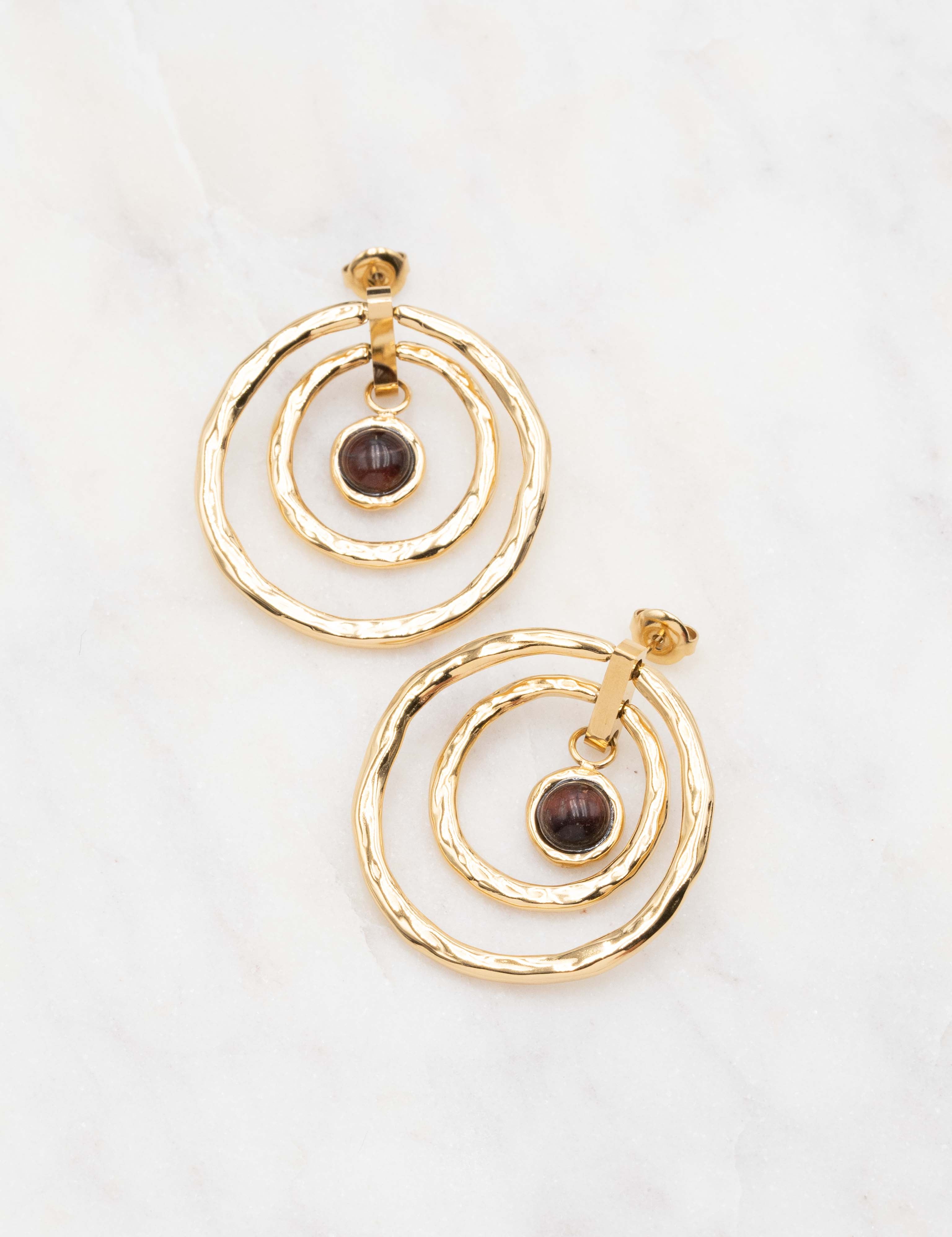 Boucles d'oreilles graphiques à puce composée d'une pièce avec un jeu d'anneaux texturés et ornée d'une pierre naturelle.