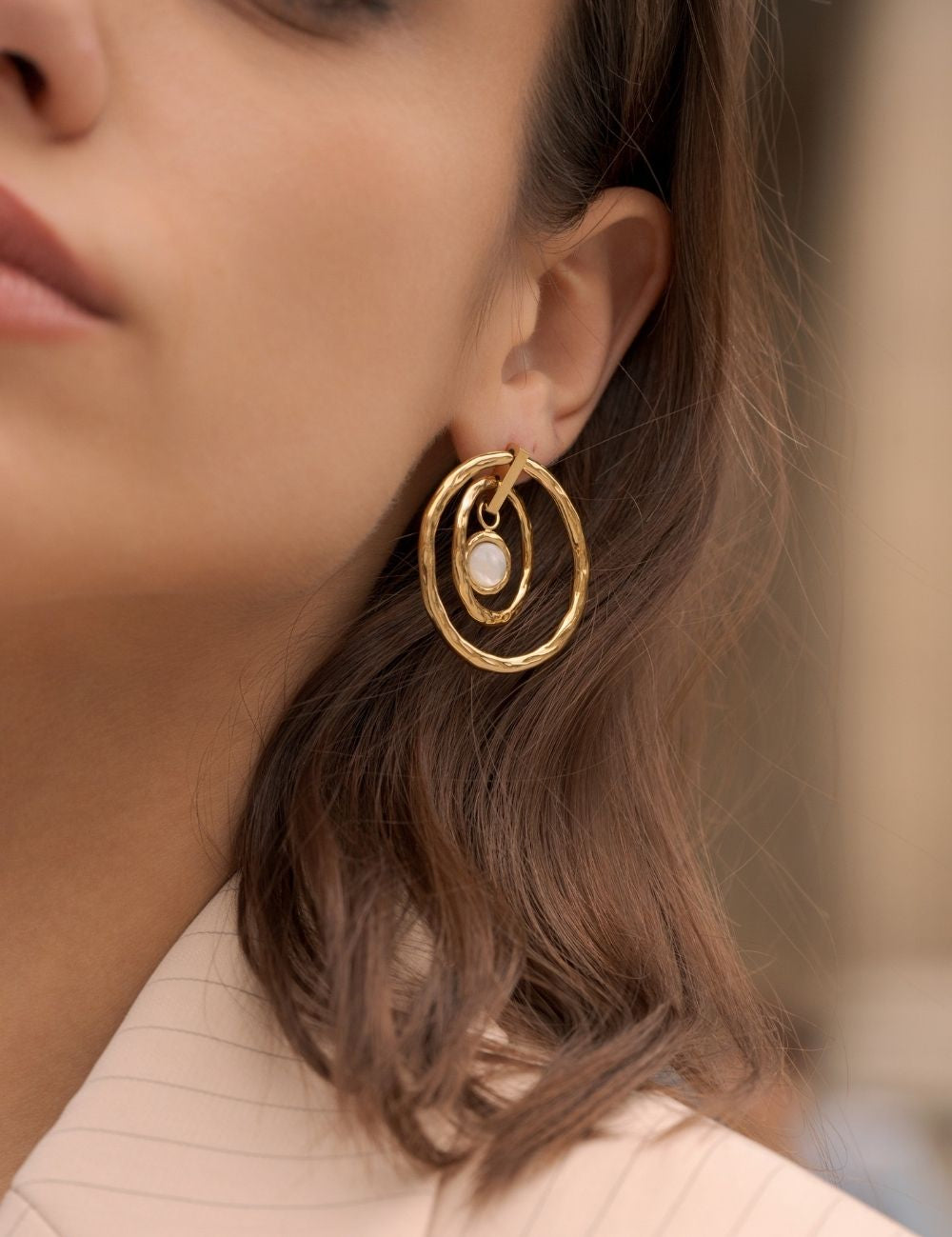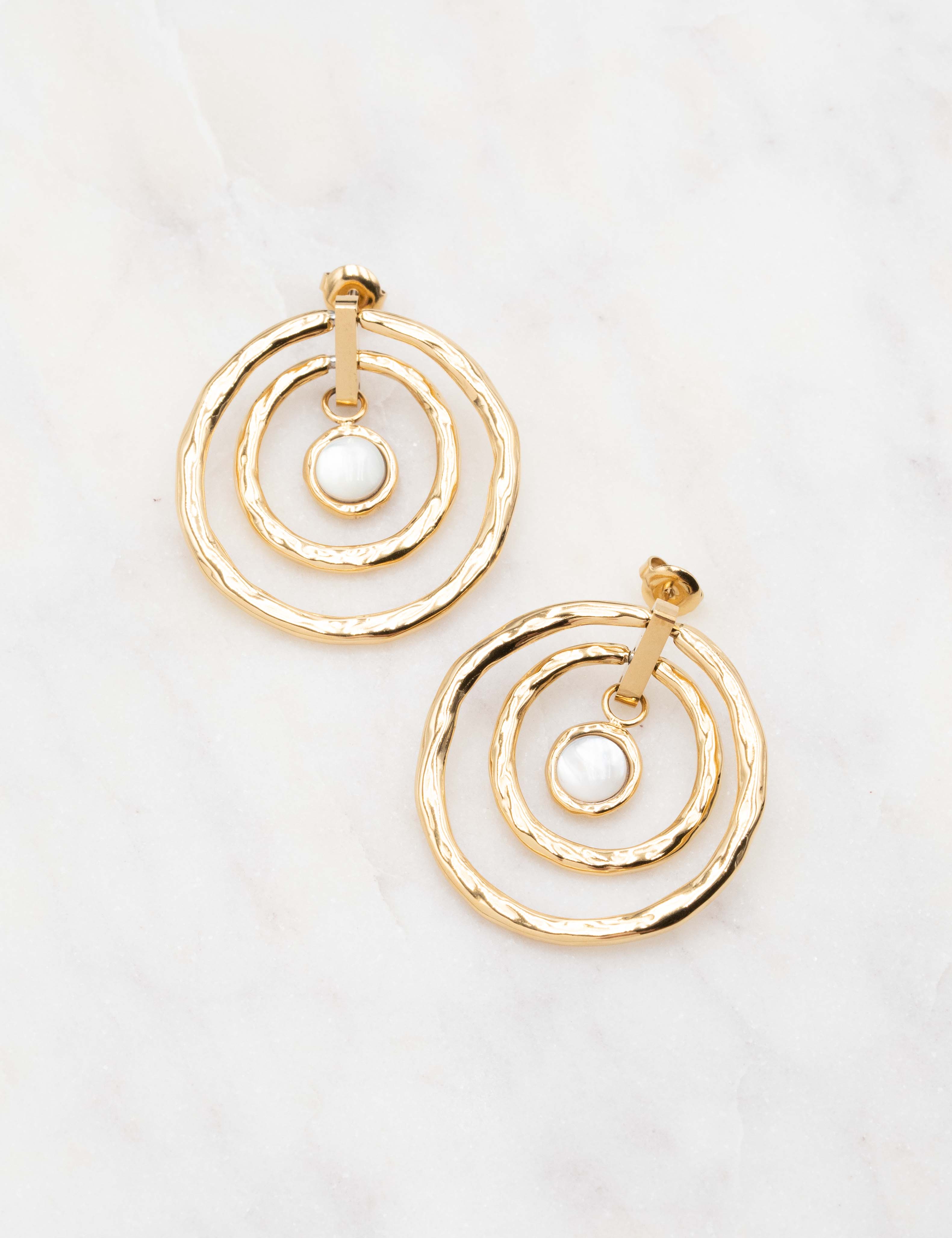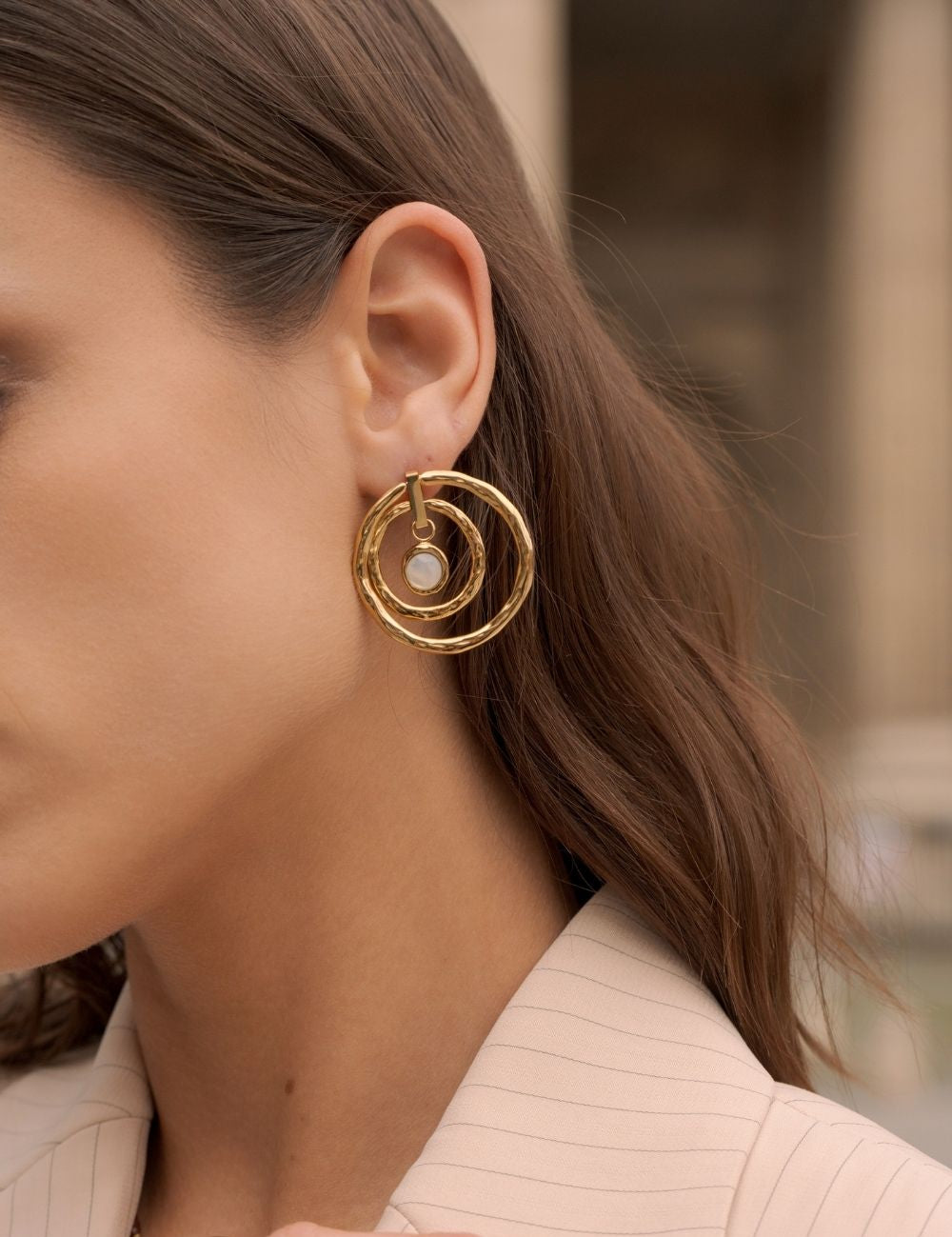 Boucles d'oreilles graphiques à puce composée d'une pièce avec un jeu d'anneaux texturés et ornée d'une pierre naturelle.